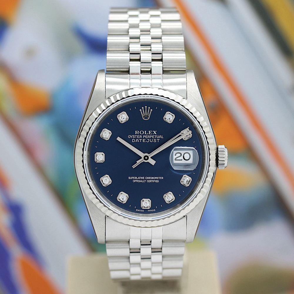 Die Uhr befindet sich in einem dem Alter entsprechend guten Zustand. Sie ist mit einem Automatikwerk ausgestattet. Eine Bereicherung für jeden Uhrensammler und Liebhaber. Alle Funktionen wurden vom Uhrmachermeister überprüft und für einwandfrei befunden. Das Werk wurde im April 2025 geölt und gereinigt. Das Jubileeband ist in Stahl und gebraucht, aber in einem noch sehr guten Zustand ( 16.5 cm Länge ohne Uhr gemessen ). Sie bieten hier auf eine Wunderschöne und klassische Armbanduhr der Spitzenklasse mit Wiedererkennungswert. Saphirglas . Das Zifferblatt ist blau - farbig und 10 Diamanten besetzt ( hierbei handelt es sich um einen Rolex Besatz . Die Lünette ist aus 18KT Weißgold und geriffelt. Die Datejust Uhr ist ca 27 Jahre alt, und wird in einem gebrauchten Zustand verkauft.