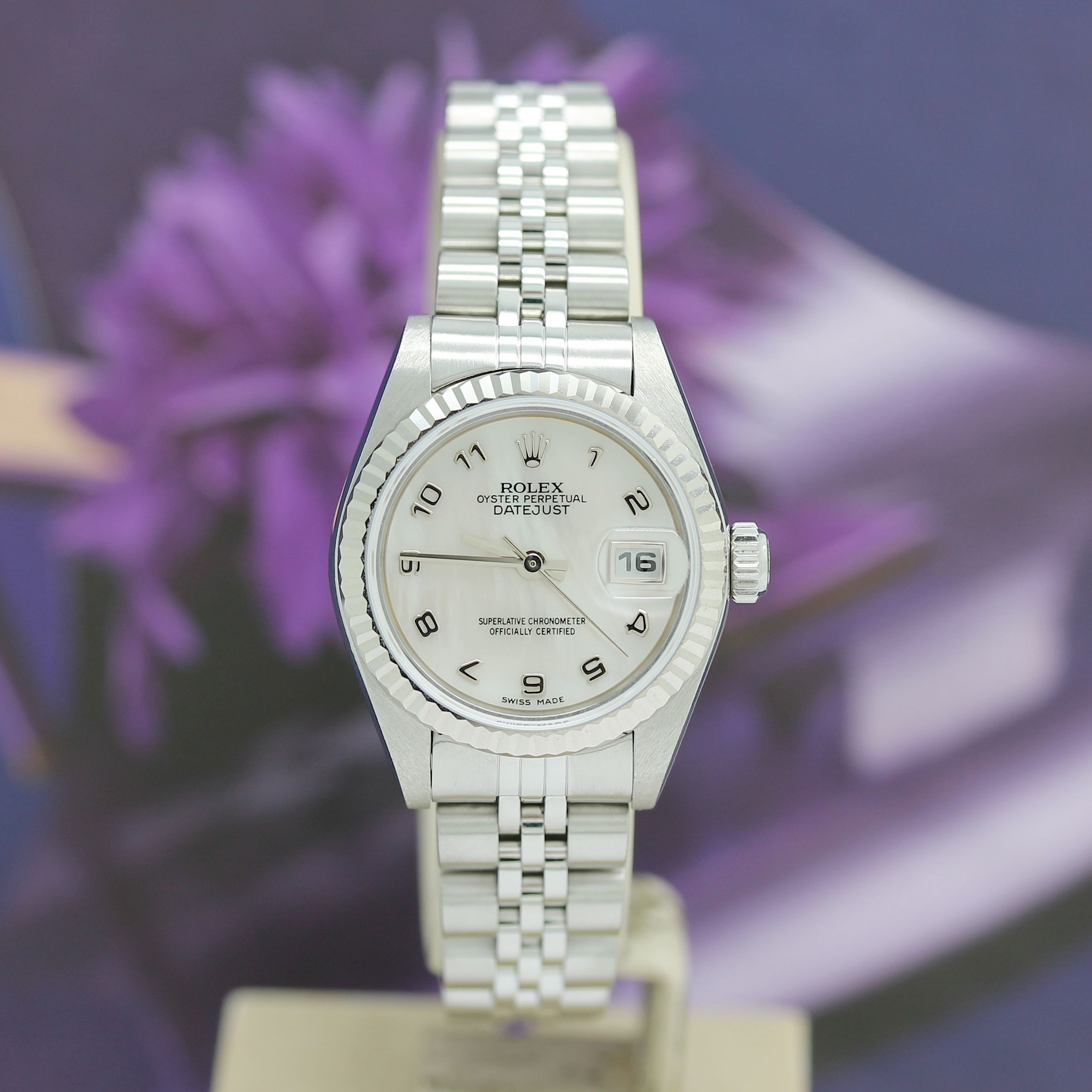 Die Uhr befindet sich in einem dem Alter entsprechend guten Zustand. Sie ist mit einem Automatikwerk ausgestattet. Das Werk wurde im April 2025 geölt und gereinigt. Eine Bereicherung für jeden Uhrensammler und Liebhaber. Das Jubileeband ist in Stahl und gebraucht, aber in einem noch guten Zustand ( Jubileeband mit 15.5 cm Länge (ohne Uhr gemessen) ). Sie bieten hier auf eine Wunderschöne und klassische Armbanduhr der Spitzenklasse mit Wiedererkennungswert. Saphirglas. Das Zifferblatt ist perlmutt - farbig. Die Lünette ist aus 18KT Weißgold. Die Datejust Uhr ist 23 Jahre alt und wird in einem gebrauchten Zustand verkauft.