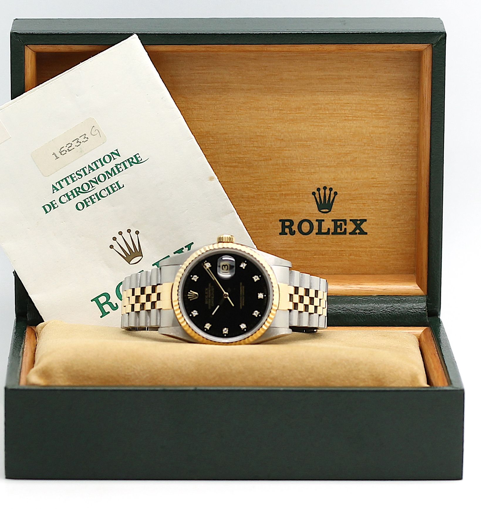 Die Uhr befindet sich in einem dem Alter entsprechend guten Zustand. Sie ist mit einem Automatikwerk ausgestattet. Das Werk wurde im April 2025 revisioniert. Eine Bereicherung für jeden Uhrensammler und Liebhaber. Das Jubileeband ist in Stahl/Gold und gebraucht, aber in einem noch guten Zustand ( Jubileeband mit 16 cm Länge (ohne Uhr gemessen) ). Sie bieten hier auf eine Wunderschöne und klassische Armbanduhr der Spitzenklasse mit Wiedererkennungswert. Saphirglas. Das Zifferblatt ist schwarz - farbig und 10 Diamanten besetzt ( hierbei handelt es sich um einen Rolex Besatz ). Die Lünette ist aus 18KT Weißgold. Die Datejust Uhr ist 33 Jahre alt und wird in einem gebrauchten Zustand verkauft.