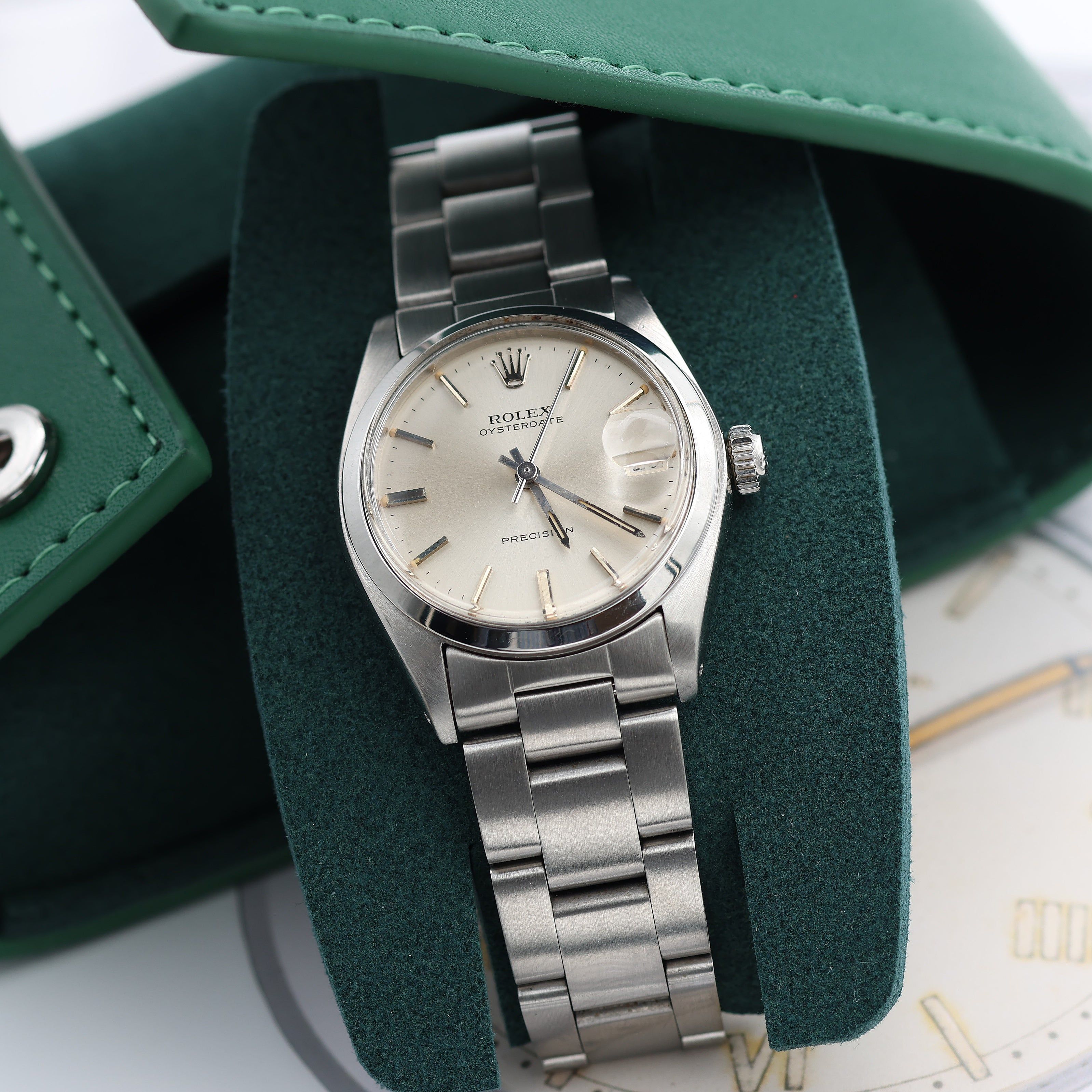 For sale a pre-owned Rolex Oyster Precision ref. 6466 with a bright silver dial. This Rolex is a perfect entry level luxury watch and it comes from the end of the '60s, directly to your wrist.A peculiar 30mm size case, a smooth bezel and clean style – if you're in the market for a notable vintage Rolex, the ref. 6466 is an excellent option to consider. A manual-winding movement beats within the case, allowing it to maintain a slimmer profile on the wrist, and creating a modest statement piece. BRAND ROLEX MODEL OYSTER PRECISION REFERENCE 6466 CASE MATERIAL STEEL MOVEMENT MANUAL WINDING DIMENSION 30 MM DIAL SILVER CRYSTAL PLEXIGLASS BRACELET TYPE OYSTER BRACELET MATERIAL STEEL ORIGINAL BOX NO ORIGINAL PAPERS NO YEAR 1966 CONDITION VERY GOOD
