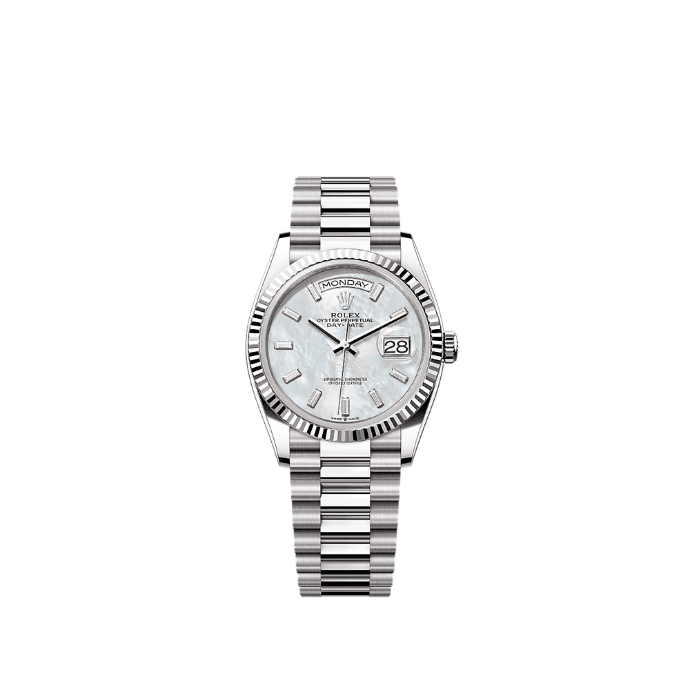 Rolex 128239-0065 - Day-Date 36 White Gold - Fluted / MOP - Baguette / President