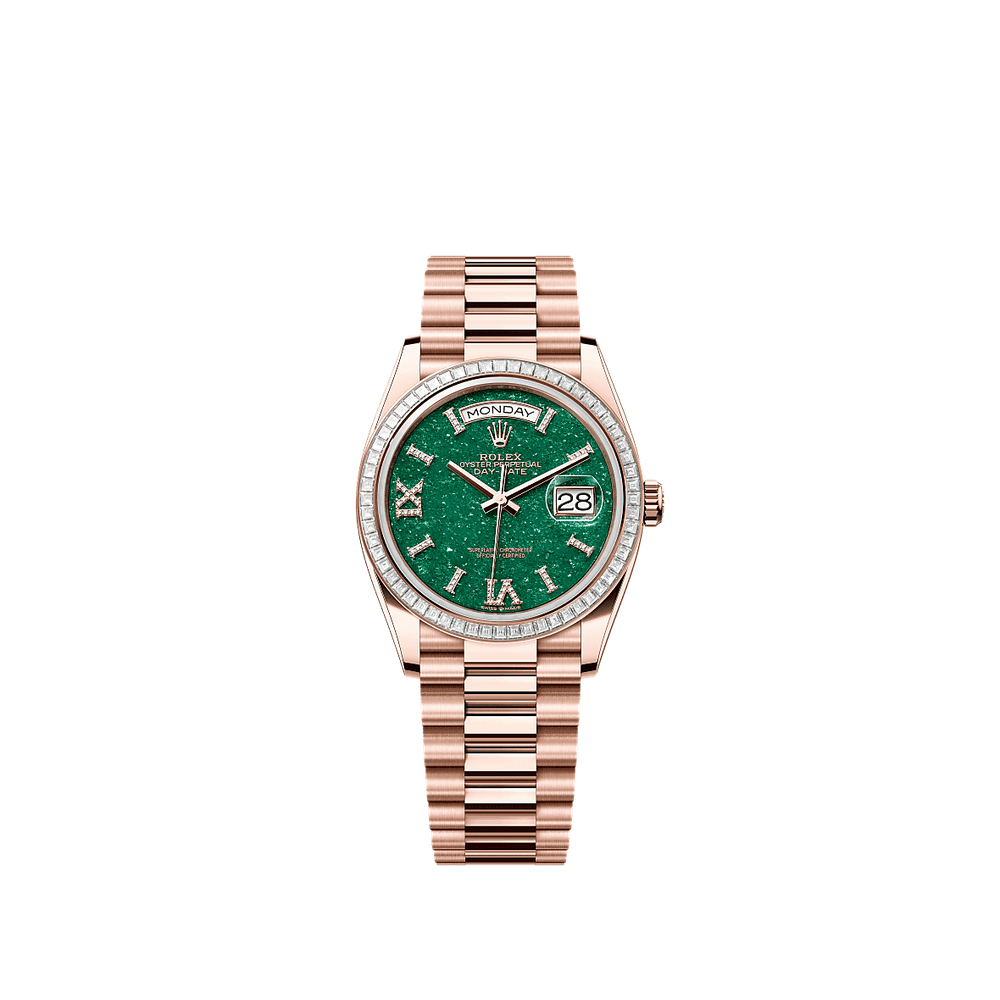 Rolex 128395TBR-0020 - Day-Date 36 Everose Gold - Baguette / Green Aventurine / President - Diamond