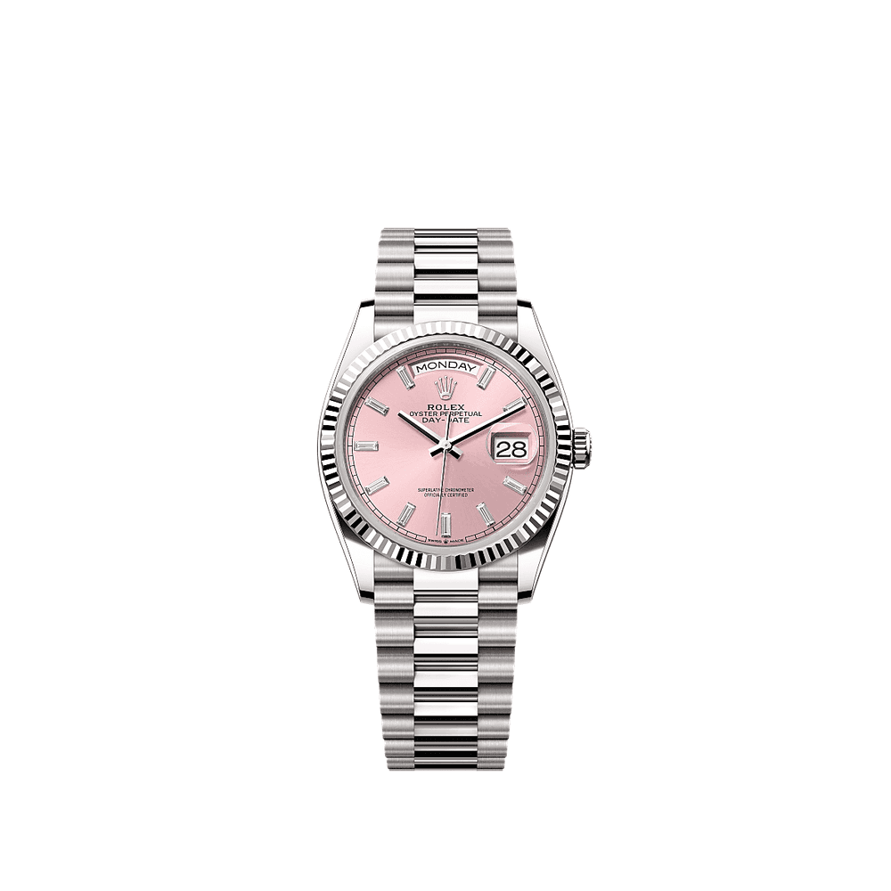 Rolex 128239-0071 - Day-Date 36 White Gold - Fluted / Pink - Baguette / President