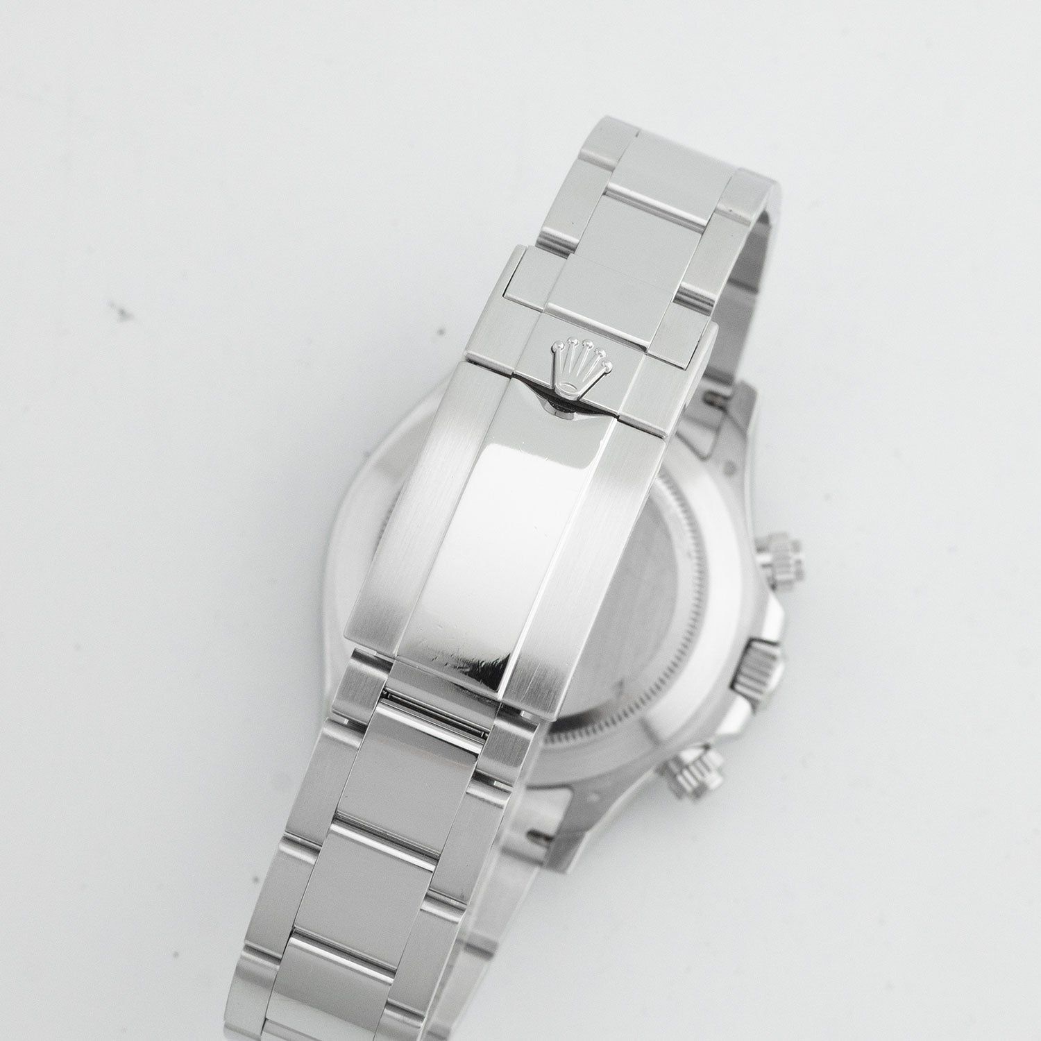 The Rolex Daytona 116506 with a platinum case and ice-blue dial is one of the most exclusive and coveted watches in the Cosmograph Daytona collection. First introduced to celebrate the 50th anniversary of the Daytona model in 2013 , this refined version stands out with its luxurious platinum case and stunning ice-blue dial with a brown Cerachrom bezel. Design & Materials The 40 mm Oyster case of this special Daytona is crafted from 950 platinum – the most precious and rarest metal used by Rolex. It is characterized by its high density and unparalleled luster. The brown monobloc Cerachrom bezel is not only a visual highlight but also extremely scratch- and UV-resistant. The engraved tachymeter scale enables precise speed measurements – an essential feature for motorsport enthusiasts. The legendary ice-blue dial , reserved exclusively for Rolex platinum models, lends this Daytona an exceptional elegance. The applied white gold indices and hands filled with Chromalight ensure optimal legibility. The three brown subdials for the chronograph functions create a harmonious contrast and underscore the sporty character of the watch. The model is worn on a platinum Oyster bracelet with polished center links, ensuring maximum comfort. The Oysterlock safety clasp protects against accidental opening, while the Easylink extension system allows for quick adjustment of the bracelet length by 5 mm. Precision & Technology The Daytona 116506 is powered by the Rolex Manufacture Caliber 4130 , a high-precision self-winding chronograph movement. It features a Parachrom hairspring that is resistant to magnetic fields and shocks. Thanks to the optimized chronograph control via a vertical clutch, the movement offers extremely precise and smooth stopwatch operation. With a power reserve of approximately 72 hours and Rolex's typical Superlative Chronometer certification, the caliber guarantees the highest precision and reliability. Conclusion The Rolex Daytona 116506 with Ice Blue dial is not just a watch, but a true collector's icon. With its elegant platinum case, exclusive dial, and superior technology, it is the epitome of luxury and sportiness—a must-have for connoisseurs and lovers of exclusive timepieces. A notice: The watch is subject to differential taxation , so VAT is not deductible . You receive a 1 year warranty on the movement .