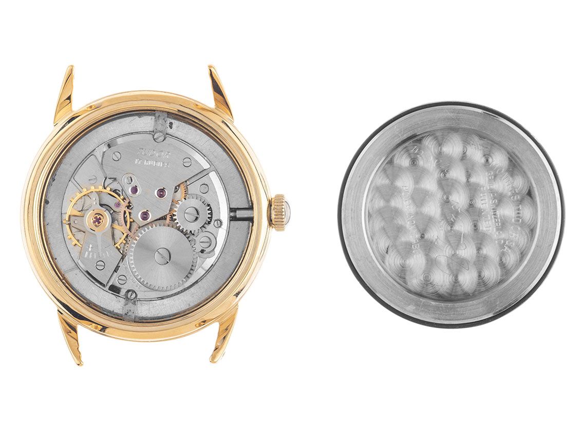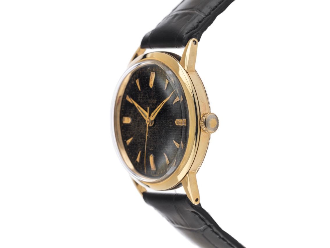Gehäuse Edelstahl Gelbgold vergoldet und poliert, Gehäusedurchmesser ohne Krone 35mm, Gehäusehöhe 10,6mm. Lünette Edelstahl Gelbgold vergoldet glatt und poliert. Armband Leder schwarz mit Ziernaht, Anstoßbreite 18mm. Stiftschließe Edelstahl Gelbgold vergoldet. Zifferblatt schwarz mit Waffelmuster, leicht patiniert, aufgesetzten gelbgoldenen Indexen und gelbgoldenen Zeigern. Uhrwerk Handaufzug, Kaliber Tudor mit 17 Edelsteinen. Anzeige von Stunde, Minute und Sekunde über Zeiger aus der Mitte. Plexiglas gewölbt. Krone geriffelt. Boden Edelstahl verschraubt und graviert. Gewicht der Uhr inklusive Armband 41g. Referenznummer: 7957, Gehäusenummer: 290XXX, Baujahr: 1960. ID: P094010360525H-3100, Artikelnummer: 10000080365. Mit Gangkontrolle und kompletter äußerlicher Aufarbeitung von Mai 2025. Original Tudor Reise Etui und Watchregister Auszug von Mai 2025, The Watch Register Zertifikat / ohne Eintrag (Internationale Datenbank für verlorene oder gestohlene Uhren)
