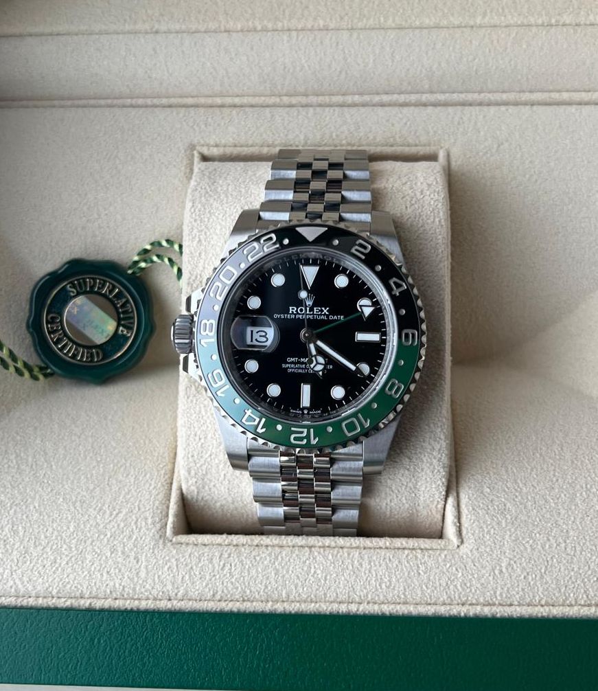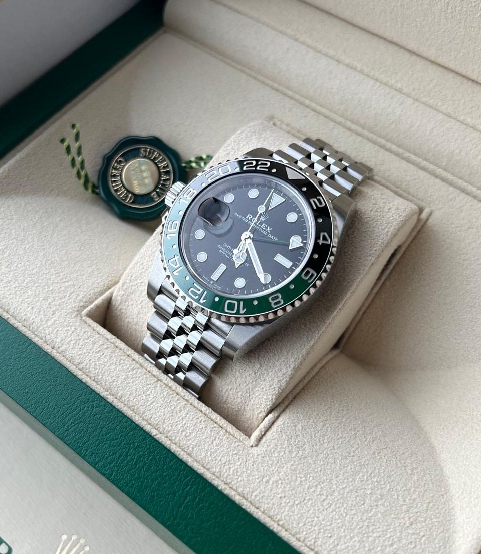 Modern and unconventional. The Rolex GMT-Master II "Sprite" features a green and black Cerachrom bezel, left-hand crown, and classic Jubilee bracelet. With dual time zone function and bold design, it’s a standout for world travelers. Now