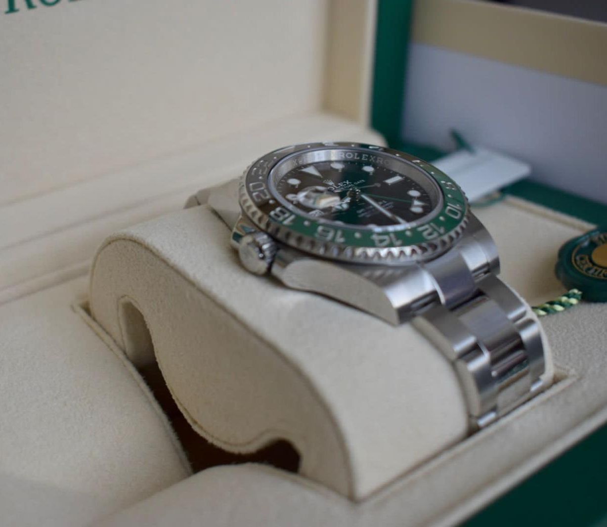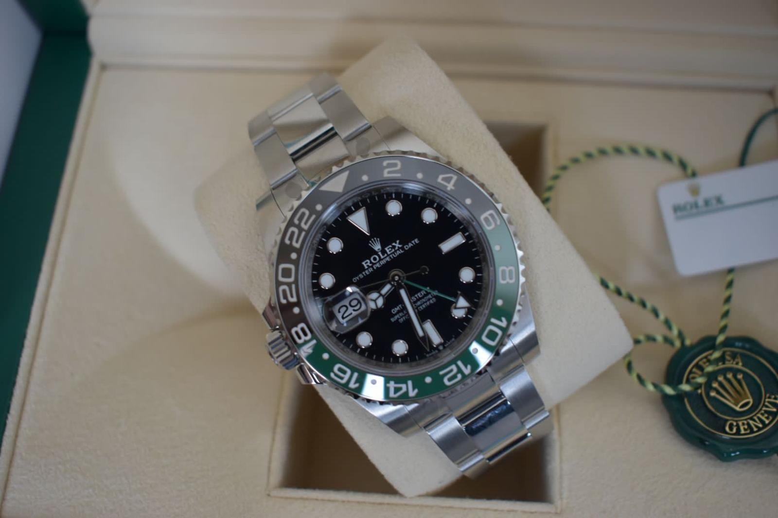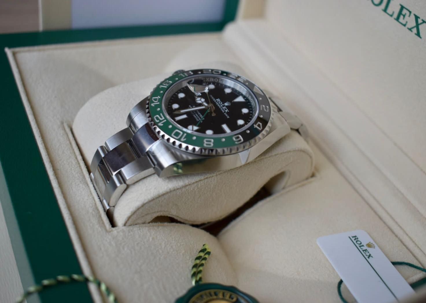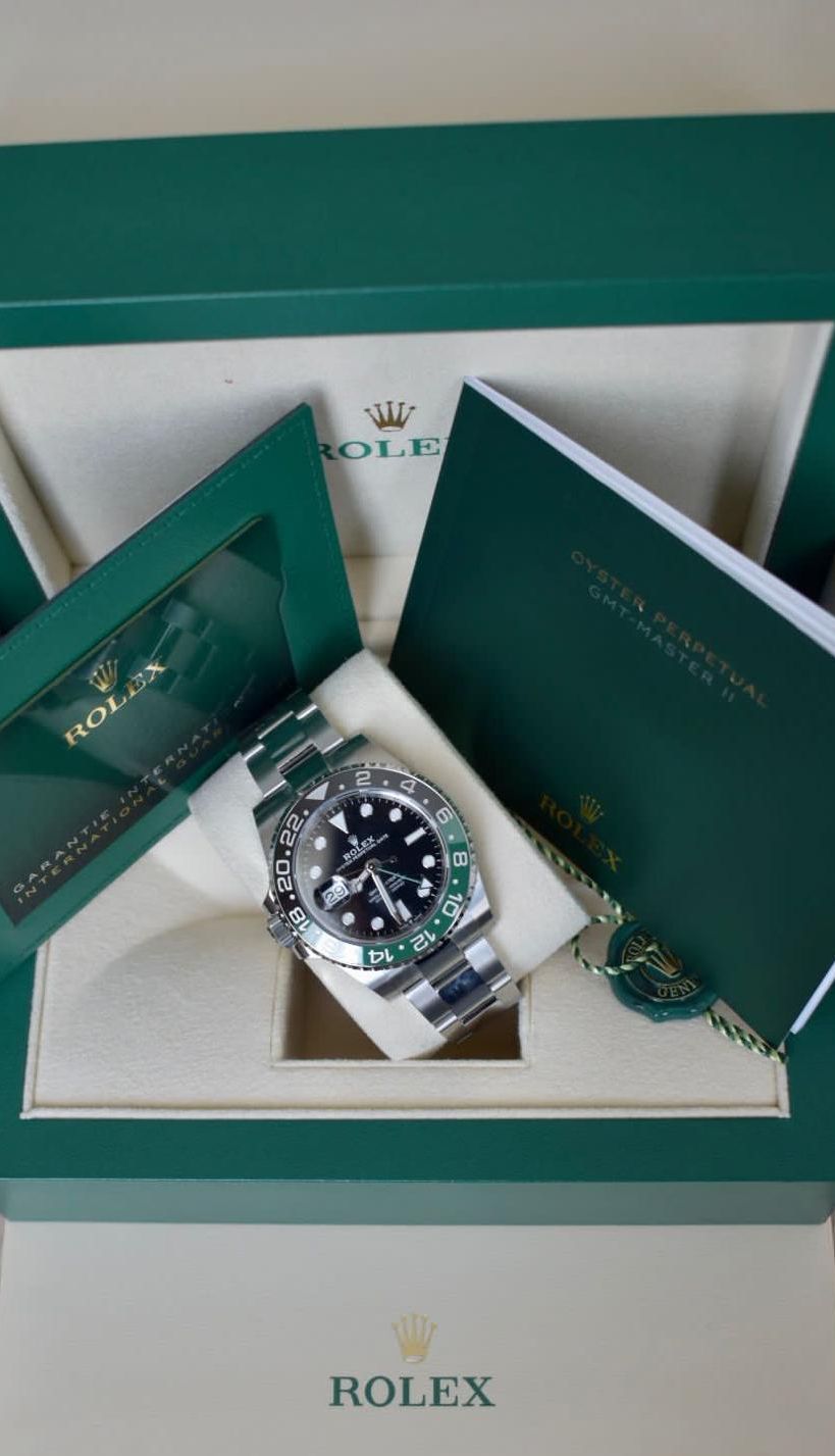 Modern and unconventional. The Rolex GMT-Master II "Sprite" features a green and black Cerachrom bezel, left-hand crown, and classic Oyster bracelet. With dual time zone function and bold design, it’s a standout for world travelers. Now available.