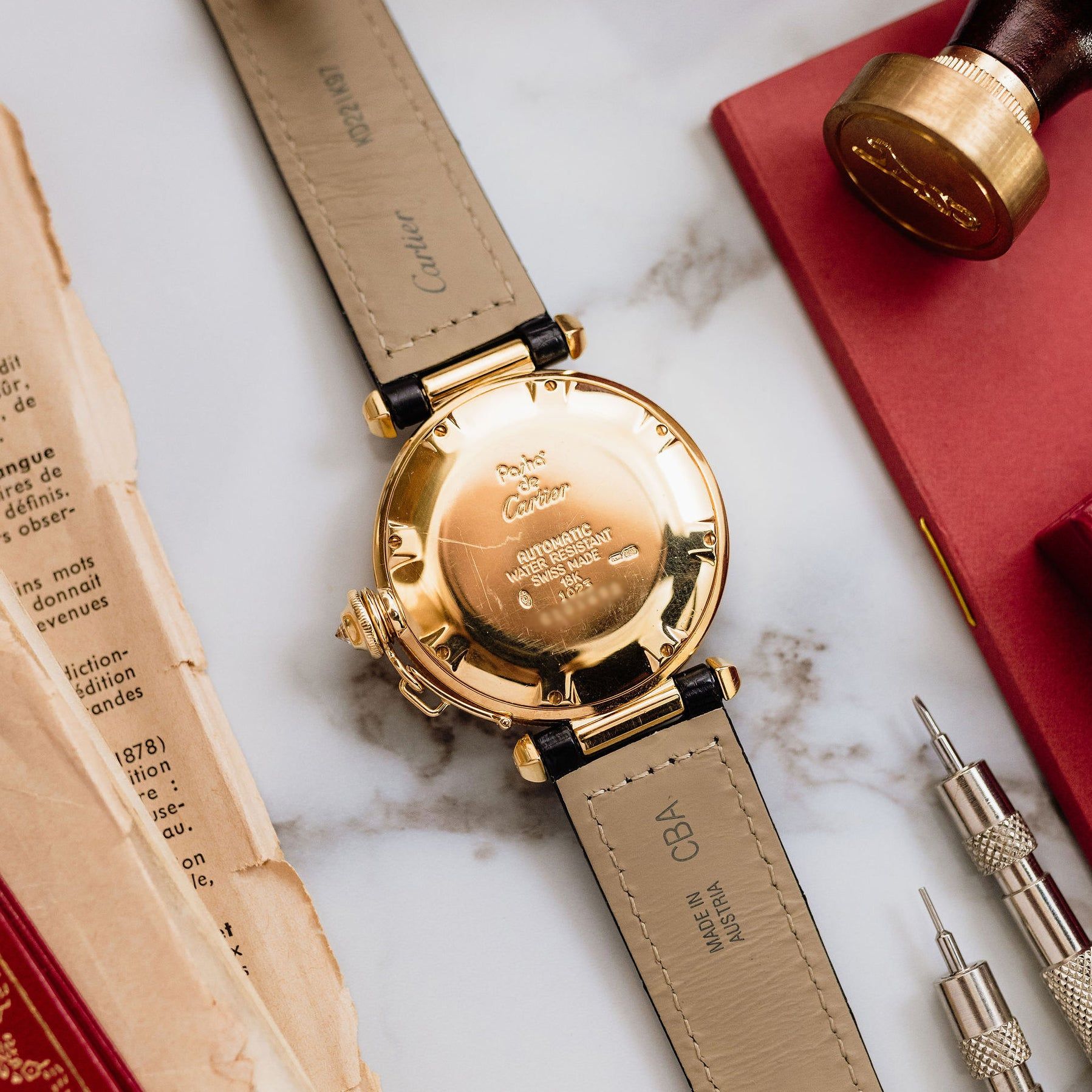 The dial follows the signature style of the Pasha de Cartier with its square within a circle, beautifully brought to life by the difference in the pieces of stone used. Deep blue lazurite is used for the central square, the heart of the watch, which is signed and framed in gold. Across the rest of the dial, we see a key feature of lapis lazuli - its pyrite flecks, its golden stars - sparkle.