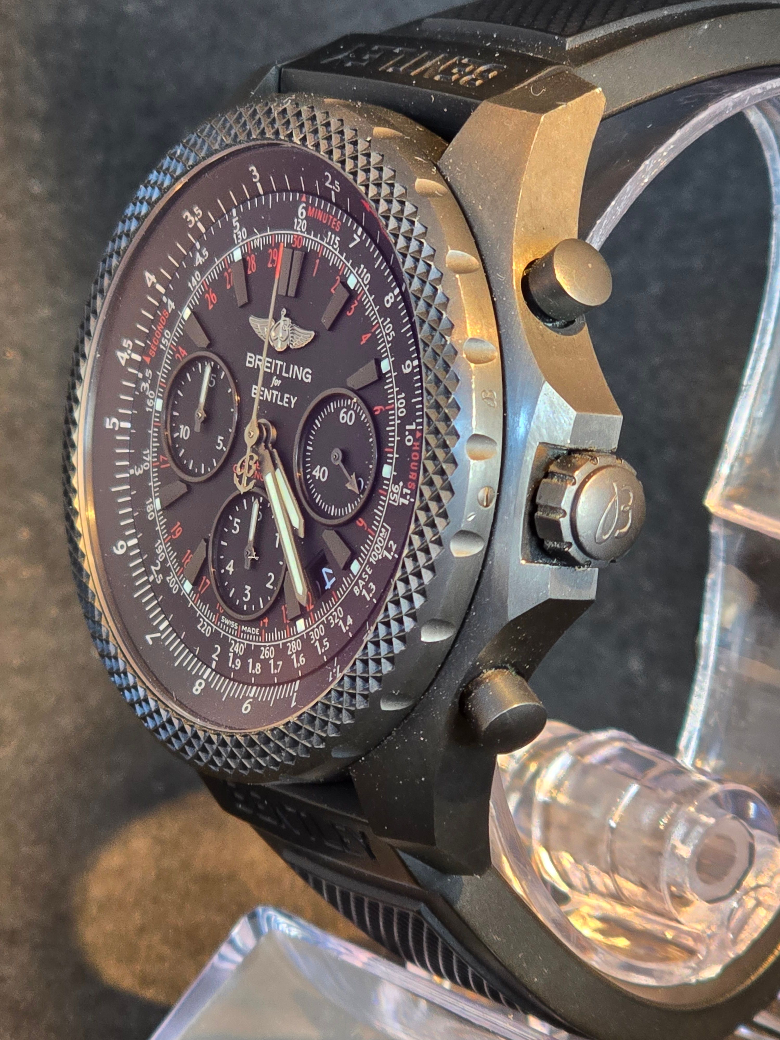 The Breitling for Bentley Light Body Midnight Carbon is a striking chronograph that merges Breitling’s aviation heritage with Bentley’s automotive excellence. Featuring a 49mm black DLC-coated titanium case, it delivers bold wrist presence while remaining lightweight and comfortable thanks to its high-tech materials.