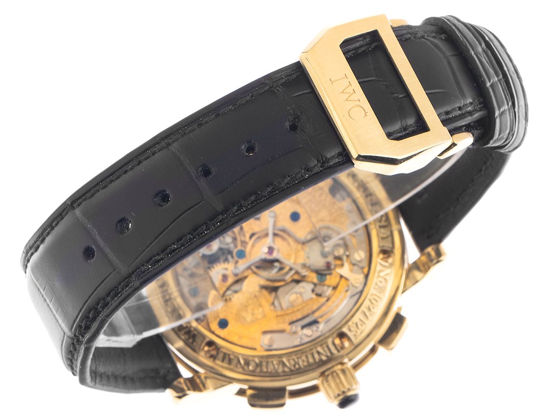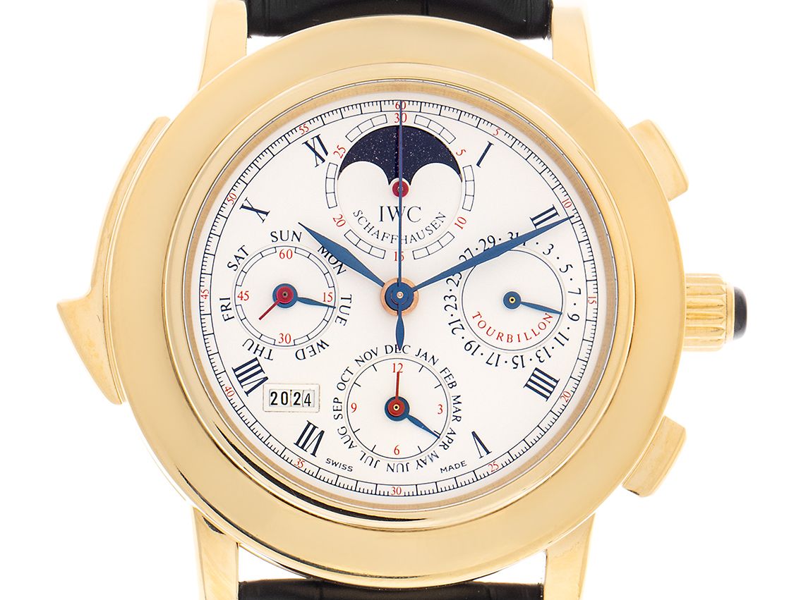 Gehäuse 18kt Gelbgold poliert, Gehäusedurchmesser ohne Krone 42,2mm, Gehäusehöhe 18,0mm. Lünette 18kt Gelbgold glatt und poliert. IWC Armband Krokoleder schwarz mit Ziernaht, Anstoßbreite 22mm, Faltschließe 18kt Gelbgold mit Hersteller-Logo. Zifferblatt versilbert mit römischen Ziffern und gebläuten Lanzenzeigern. Uhrwerk Handaufzug, Schleppzeiger-Chronograph, Stunden-, Viertelstunden- und Minutenrepetition, Kaliber IWC 1868 mit 76 Edelsteinen, Tourbillon im Titankäfig, von Hand feinbearbeitet und graviert. Anzeige von Stunde und Minute über Zeiger aus der Mitte, kleine Sekunde über Zeiger bei 9 Uhr, Datumsanzeige mit Schnellverstellung über Zeiger bei 3 Uhr, Wochentaganzeige mit Schnellverstellung über Zeiger bei 9 Uhr, Monatsanzeige über Zeiger bei 6 Uhr, vierstellige Jahresanzeige zwischen 7 und 8 Uhr, Mondphasenanzeige bei 12 Uhr. Saphirglas kratzfest. Krone mit schwarzem Cabochon für die Schleppzeigerfunktion. Boden 18kt Gelbgold 6-fach verschraubt und graviert mit Saphirglas Sichtfenster. Gewicht der Uhr inklusive Armband 173g. Referenznummer: 1868, Gehäusenummer: 2537XXX, ID: KB11042800000324H-220000, Artikelnummer: 10000073834. Original IWC Box mit Umkarton und Echtheitszertifikat von 11/1993 sowie Beschreibung, Bedienungsanleitung, Sammelband aus 1995 und Poliertuch, inkl. IWC Service von 03/2022 und 05/2024, Full Set. Kapitalanlage mit Wertsteigerungspotential, extrem seltenes Sammlerstück, aus erster Hand, fast nicht getragen. Limitiert auf 125 Exemplare. Original unpoliert. Lieferzeit sofort.