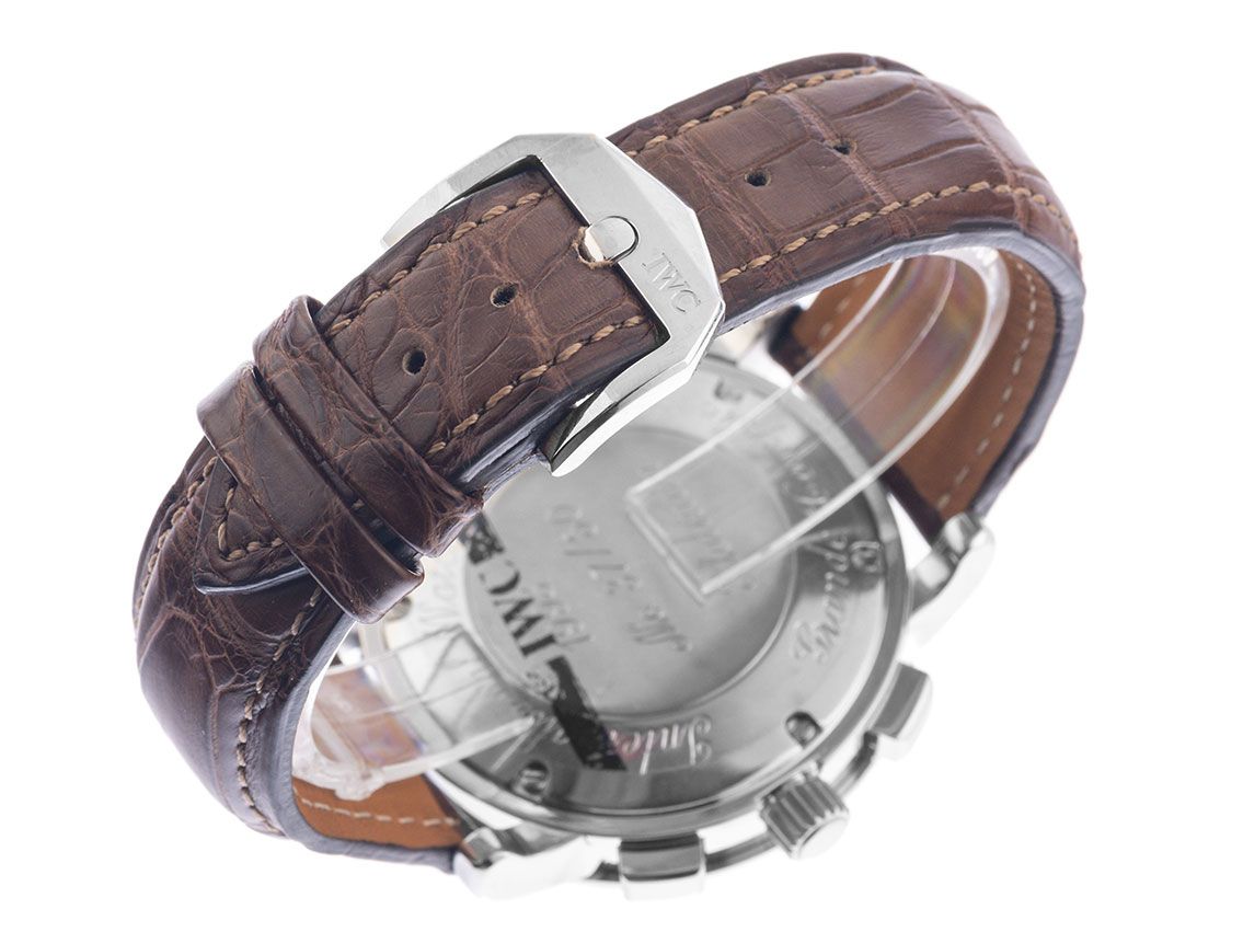 Gehäuse 950 Platin poliert, Gehäusedurchmesser ohne Krone 42,5mm, Gehäusehöhe 16,5mm. Lünette 950 Platin glatt und poliert. Armband Krokoleder braun mit Ziernaht, Anstoßbreite 22mm, Stiftschließe 950 Platin mit Hersteller-Logo. Zifferblatt versilbert mit aufgesetzten gelbgoldenen Indexen und gelbgoldenen Zeigern. Uhrwerk Automatik, Schleppzeiger-Chronograph, Stunden-, Viertelstunden- und Minutenrepetition, Kaliber IWC 79091 mit 65 Edelsteinen. Anzeige von Stunde und Minute über Zeiger aus der Mitte, kleine Sekunde mit Sekundenstopp zur sekundengenauen Einstellung der Uhrzeit bei 9 Uhr, Datumsanzeige mit Schnellverstellung über Zeiger bei 3 Uhr, Wochentaganzeige mit Schnellverstellung über Zeiger bei 9 Uhr, Monatsanzeige über Zeiger bei 6 Uhr, vierstellige Jahresanzeige zwischen 7 und 8 Uhr, Mondphasenanzeige bei 12 Uhr. Saphirglas kratzfest. Krone 950 Platin verschraubbar und geriffelt. Boden 950 Platin 6-fach verschraubt und graviert. Gewicht der Uhr inklusive Armband 184g. Referenznummer: 3770, Gehäusenummer: 2554XXX, Baujahr: 1993, ID: KH15211500000625H-150000, Artikelnummer: 10000080609. Original IWC Box mit Umkarton, nachträglich von professioneller Polsterei mit weißem Echtleder bezogen und Garantie Papieren ohne Datumseintrag sowie Service Rechnung von IWC über kompletten Service und Aufarbeitung von September 2021 Beschreibung, Bedienungsanleitung, Sammelbücher "Die Uhren von IWC" von 1993, "Porsche Design by IWC", Großes Sammelbuch "Grande Complication", zwei original IWC Ersatz- Lederbänder in Braun und Schwarz und Watchregister Auszug von Juni 2025, The Watch Register Zertifikat / ohne Eintrag (Internationale Datenbank für verlorene oder gestohlene Uhren), Full Set. Superschnäppchen, Kapitalanlage mit Wertsteigerungspotential, extrem seltenes Sammlerstück, Tresoruhr. Limitiert auf 50 Exemplare. Ungetragen. Lieferzeit sofort.