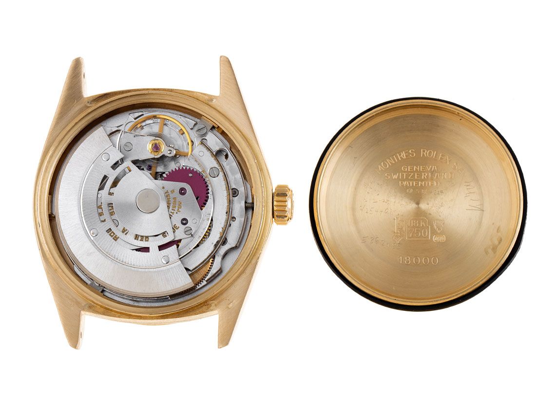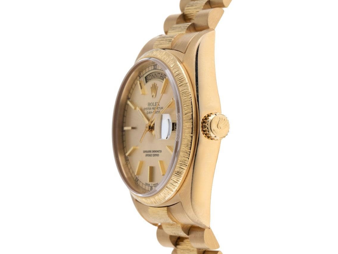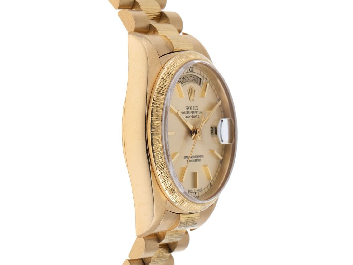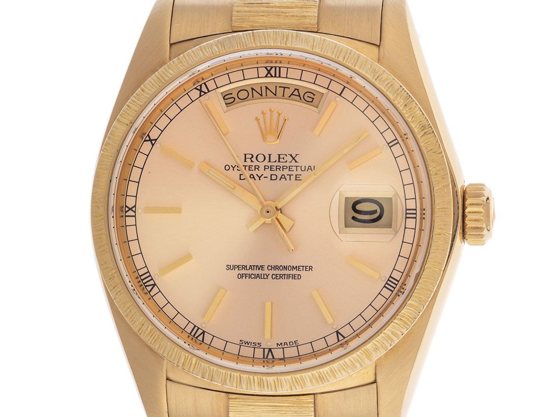 Gehäuse 18kt Gelbgold poliert und satiniert, Gehäusedurchmesser ohne Krone 36mm, Gehäusehöhe 12,1mm. Lünette 18kt Gelbgold poliert mit Rindengravur. Armband Präsident 18kt Gelbgold mit Rindengravur satiniert, verdeckte Crownclasp-Faltschließe 18kt Gelbgold mit Hersteller-Logo. Zifferblatt champagnerfarben mit aufgesetzten gelbgoldenen Indexen und gelbgoldenen Zeigern. Uhrwerk Automatik, Chronometer mit Zeugnis, Rolex Manufakturkaliber 3055 mit 27 Edelsteinen. Anzeige von Stunde, Minute und Sekunde über Zeiger aus der Mitte, Wochentagsanzeige in Deutsch bei 12 Uhr, Datumsanzeige unter Glaslupe mit Schnellverstellung bei 3 Uhr, open 6/9 (offene 6 und 9 in der Datumsanzeige). Saphirglas kratzfest. Krone verschraubbar mit Hersteller-Logo. Boden 18kt Gelbgold verschraubt. Gewicht der Uhr inklusive Armband 139g, Länge des Armbandes inklusive Gehäuse 175mm. Referenznummer: 18078, Gehäusenummer: 5862XXX, ID: P1021350000625H-24900, Artikelnummer: 10000080652. Mit Gangkontrolle und kompletter äußerlicher Aufarbeitung von Juni 2025. Original Rolex Leder Box und Garantie Papiere von September 1979, LC 100/ Germany EU, sowie Beschreibung, Service Booklet, Rolex Taschentuch, Übersetzungsheft, Ledermäppchen, Rolex Chronometer-Siegel, Tag und Watchregister Auszug von Juni 2025, The Watch Register Zertifikat / ohne Eintrag (Internationale Datenbank für verlorene oder gestohlene Uhren),