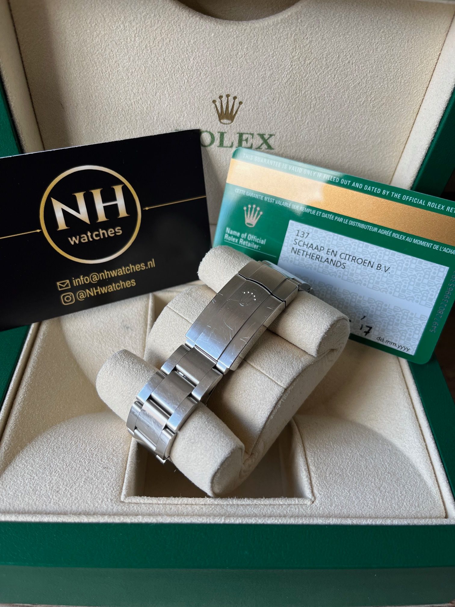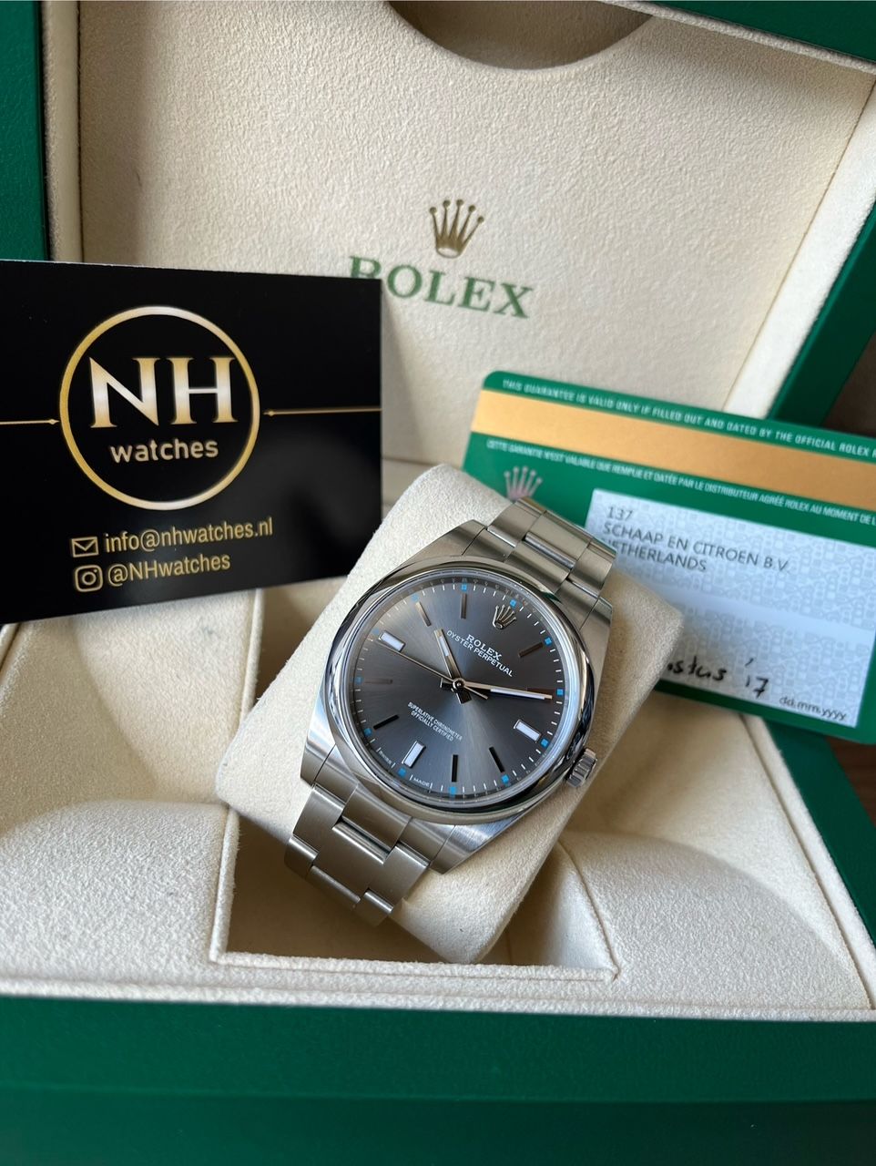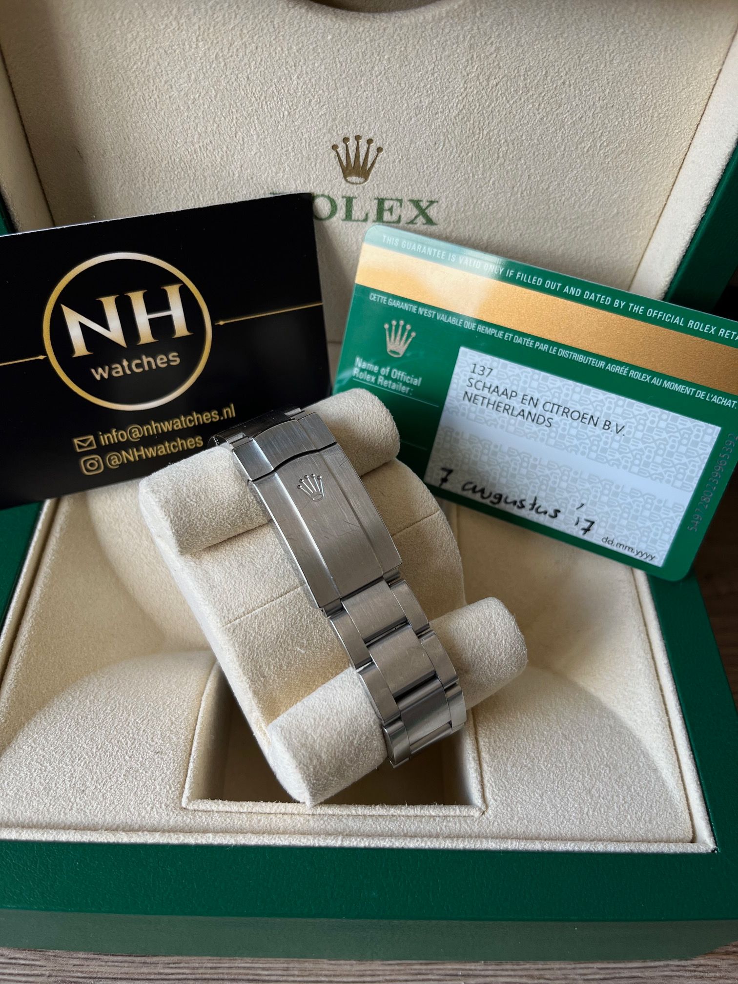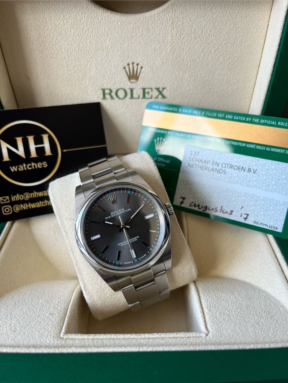 The very chique Rolex Oyster Perpetual 114300 with the Silver dial and small blue ourmark dots.