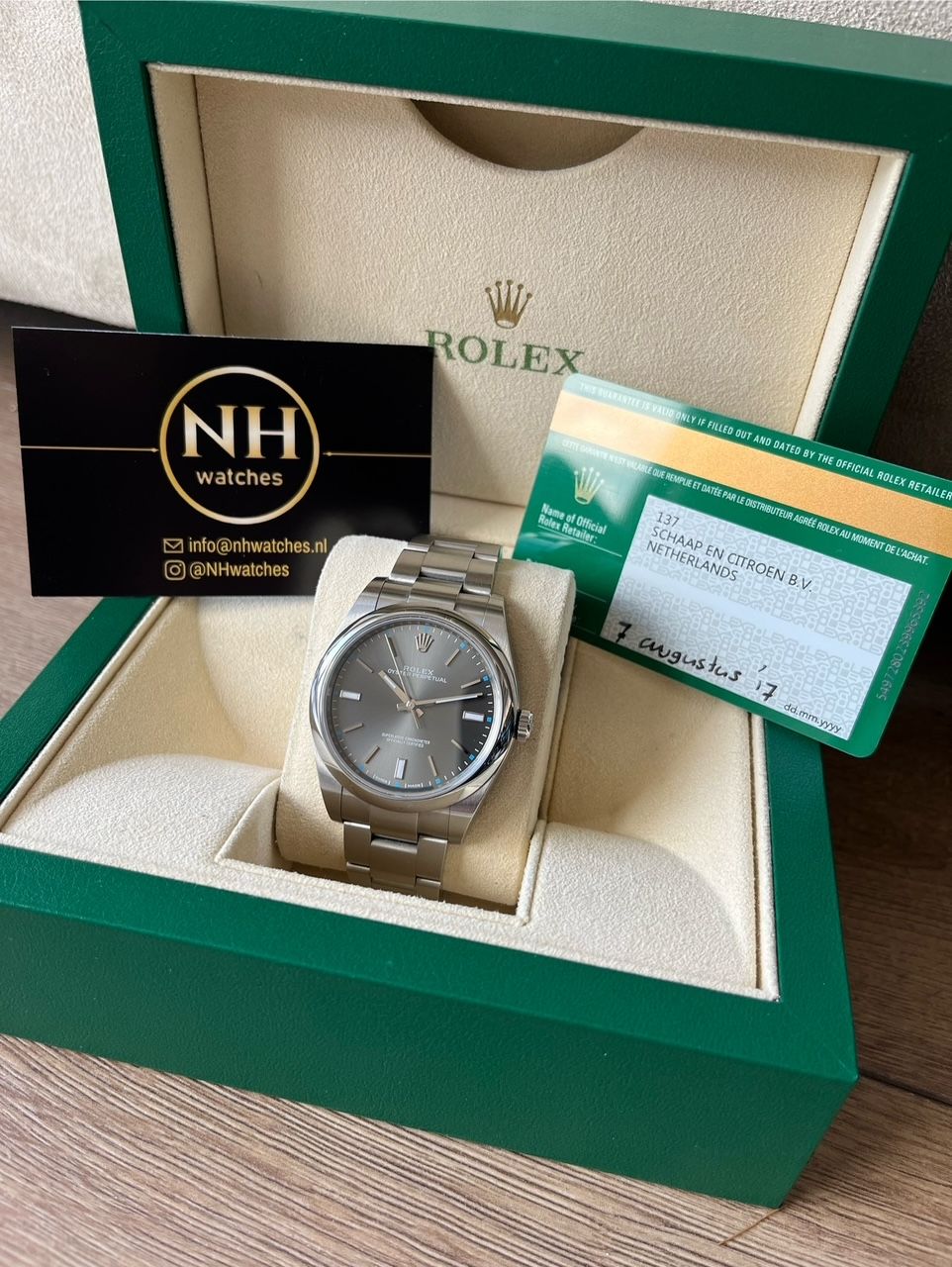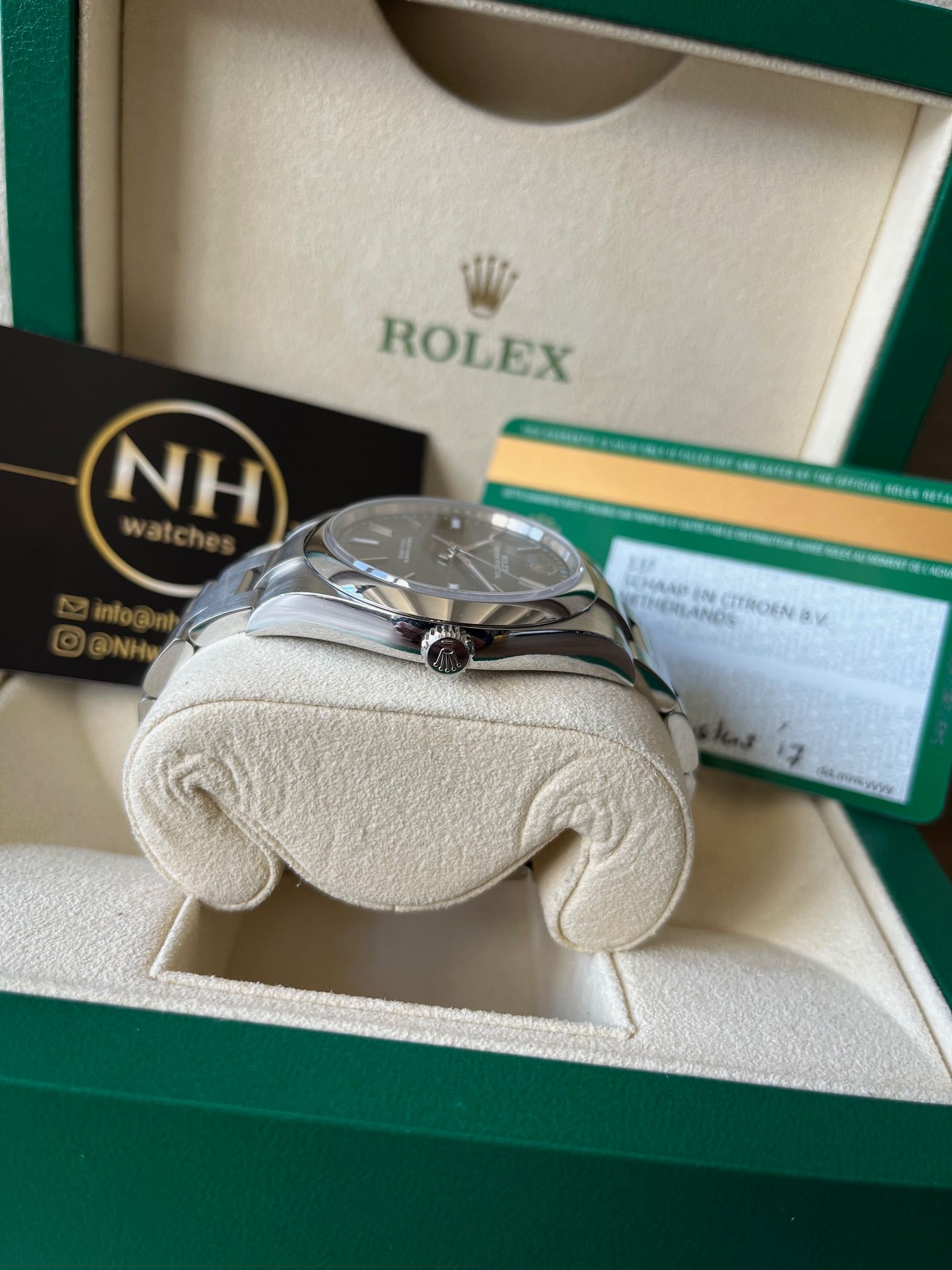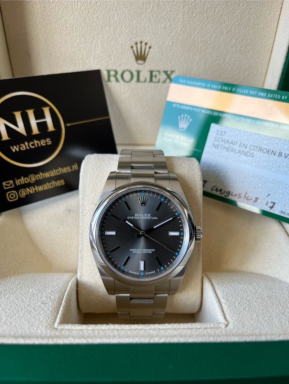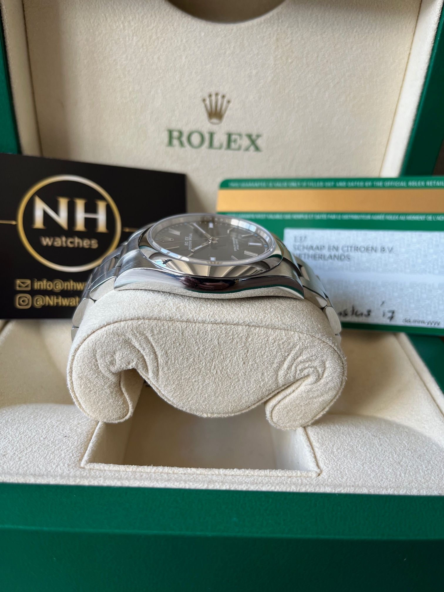 The very chique Rolex Oyster Perpetual 114300 with the Silver dial and small blue ourmark dots.