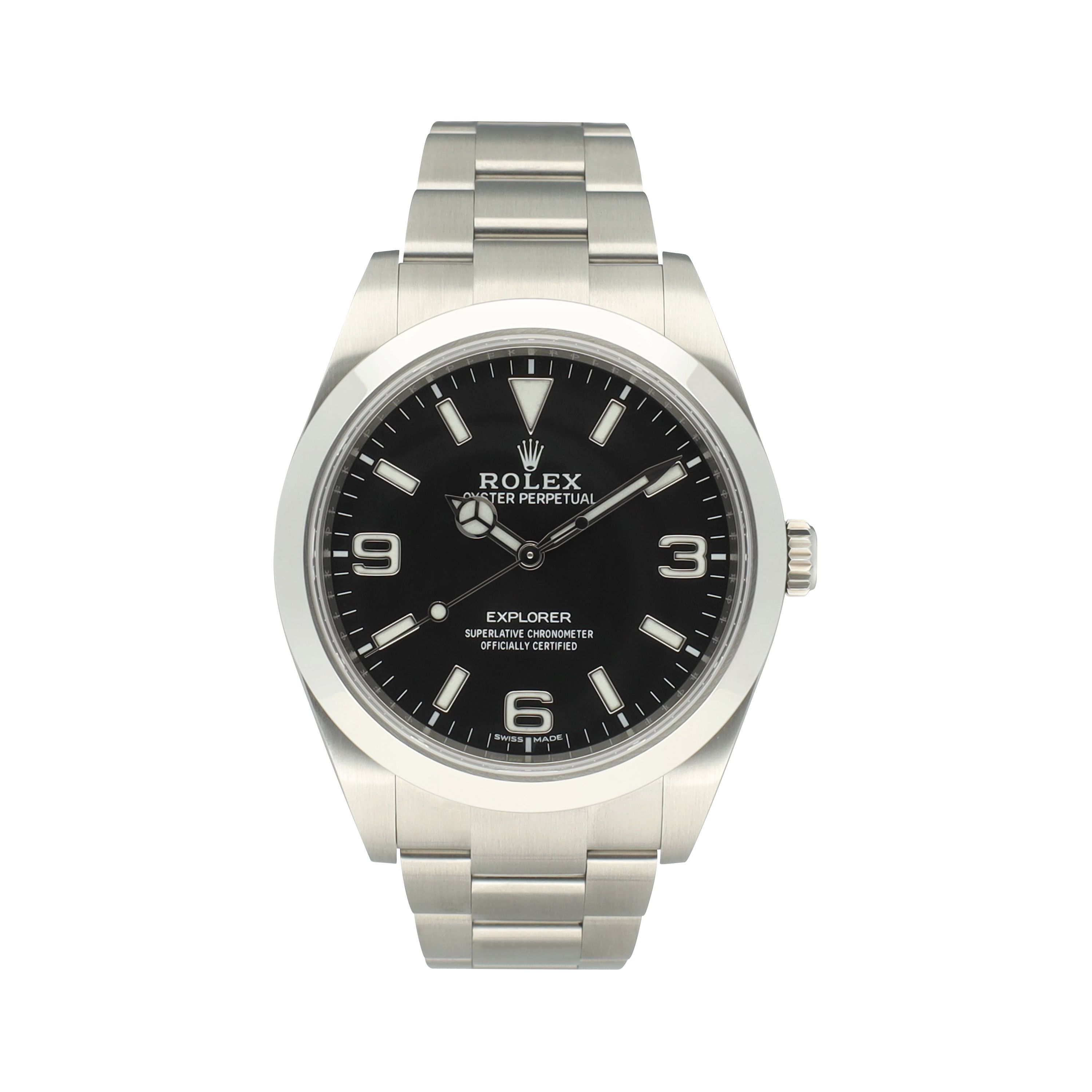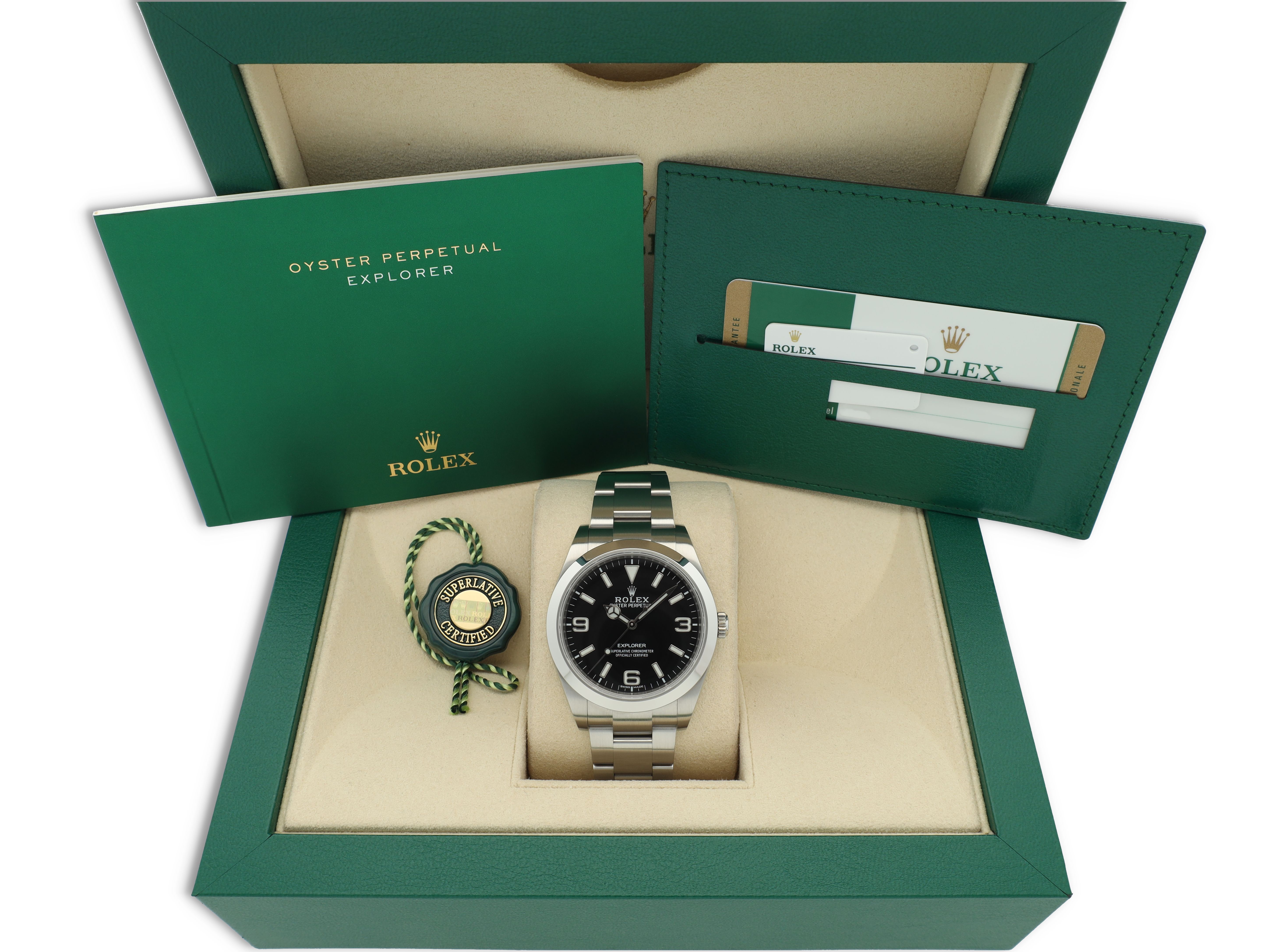 The Rolex Explorer with reference 214270 from 2016 comes as a full set, including the original box, papers, booklets, hang tag, and Rolex warranty card. This 39 mm Explorer represents the perfect balance between tool-watch functionality and understated elegance, making it one of the most versatile models in the Rolex lineup.