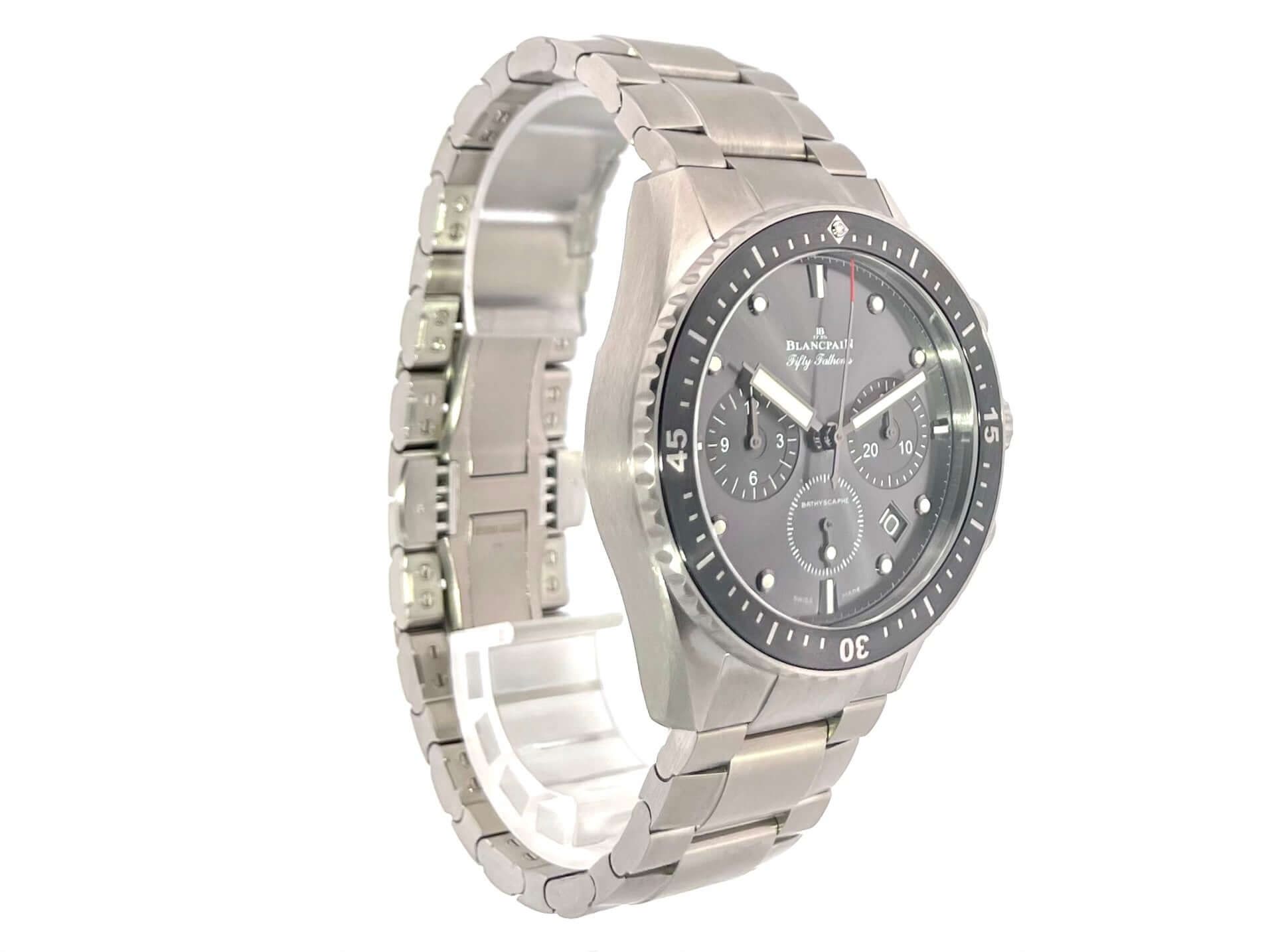 Blancpain Fifty Fathoms Bathyscaphe Chronograph Flyback 5200-1210-98S Case made of titanium polished and satin-finished, case diameter 43 mm, case height 14.9 mm, titanium bezel with gray ceramic inlay, rotatable with lock, titanium strap with folding clasp, gray dial with applied luminous dots, luminous hands, small second hand with luminous tip, automatic, caliber Blancpain F385, 37 jewels, power reserve approx. 50 hours, date, central seconds, sapphire crystal, screwed crown with side protection, screwed titanium back with viewing window, water resistant up to 30 bar.