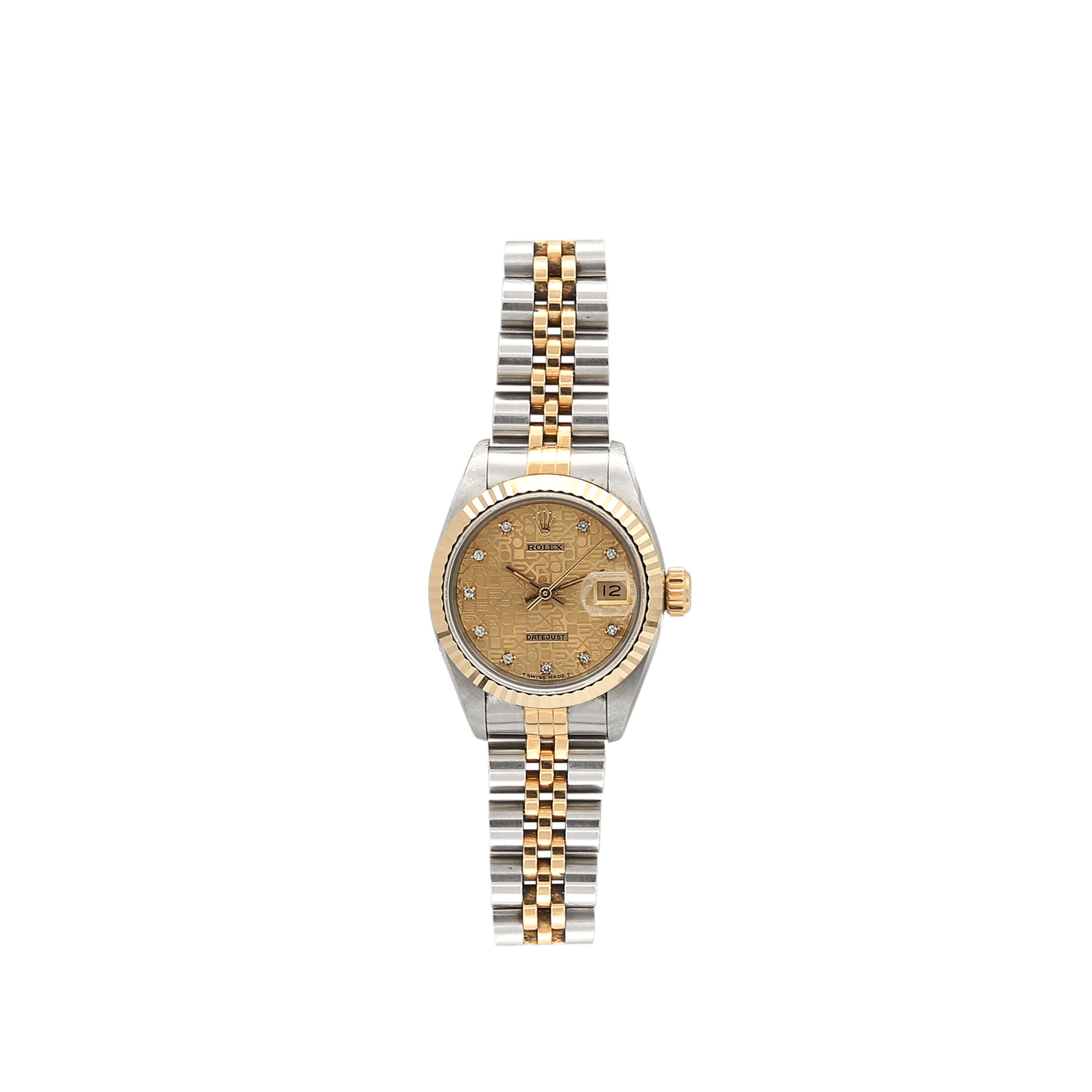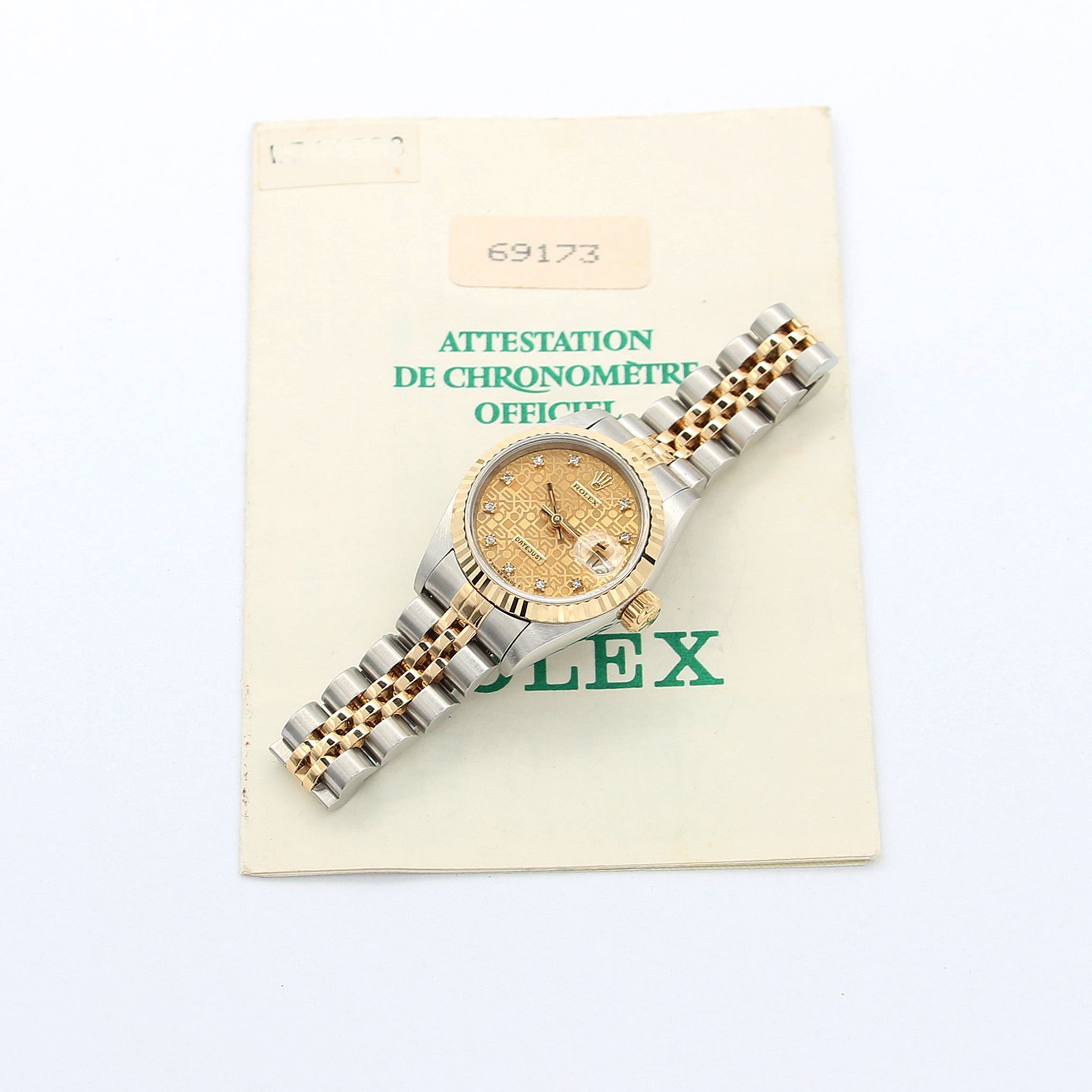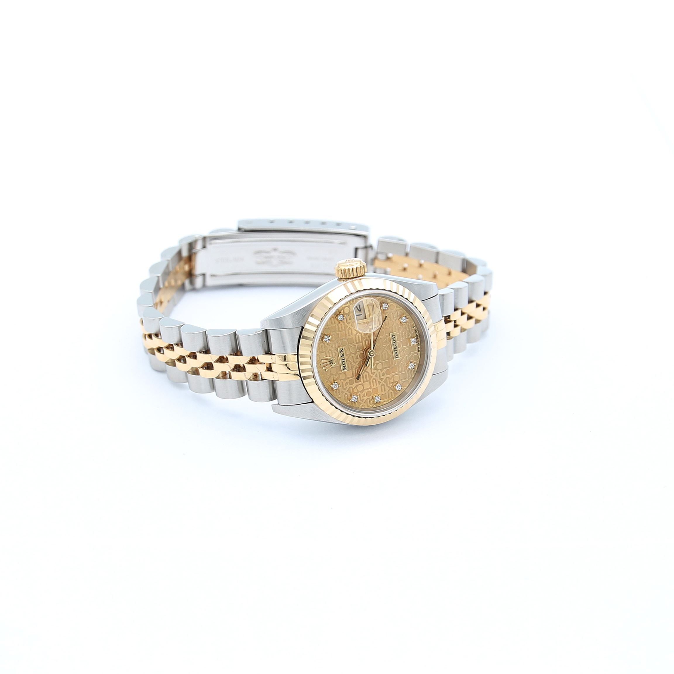 For sale at Debonar Watches: pre-owned Rolex Datejust Lady ref. 69173 on an Jubilee bracelet, full set.It presents a champagne millennary dial with diamonds.Feminine elegance at superlative, chronometer certified with a flawless and iconic accurate date display window: a perfect Rolex watch for women.It is one of the finest women’s watches, since 1957. The small 26mm dimensions make this model a manufacturing jeweler Rolex Jubilee Bracelet in agreement with 18k yellow gold and steel. The model is a compliment of sophisticated elegance, signed Rolex.Contact us in case of any doubts/inquiry. BRAND ROLEX MODEL DATEJUST LADY REFERENCE 69173 CASE MATERIAL STEEL/GOLD MOVEMENT AUTOMATIC DIMENSION 26 MM DIAL CHAMPAGNE MILLENNARY W/DIAMONDS BEZEL GOLD CRYSTAL SAPPHIRE BRACELET TYPE OYSTER BRACELET MATERIAL STEEL/GOLD BRACELET LENGHT 16 CM ORIGINAL BOX YES ORIGINAL PAPERS YES YEAR APPROX. THE '90s CONDITION VERY GOOD