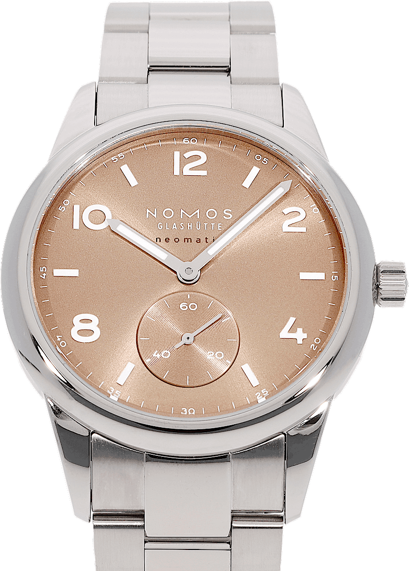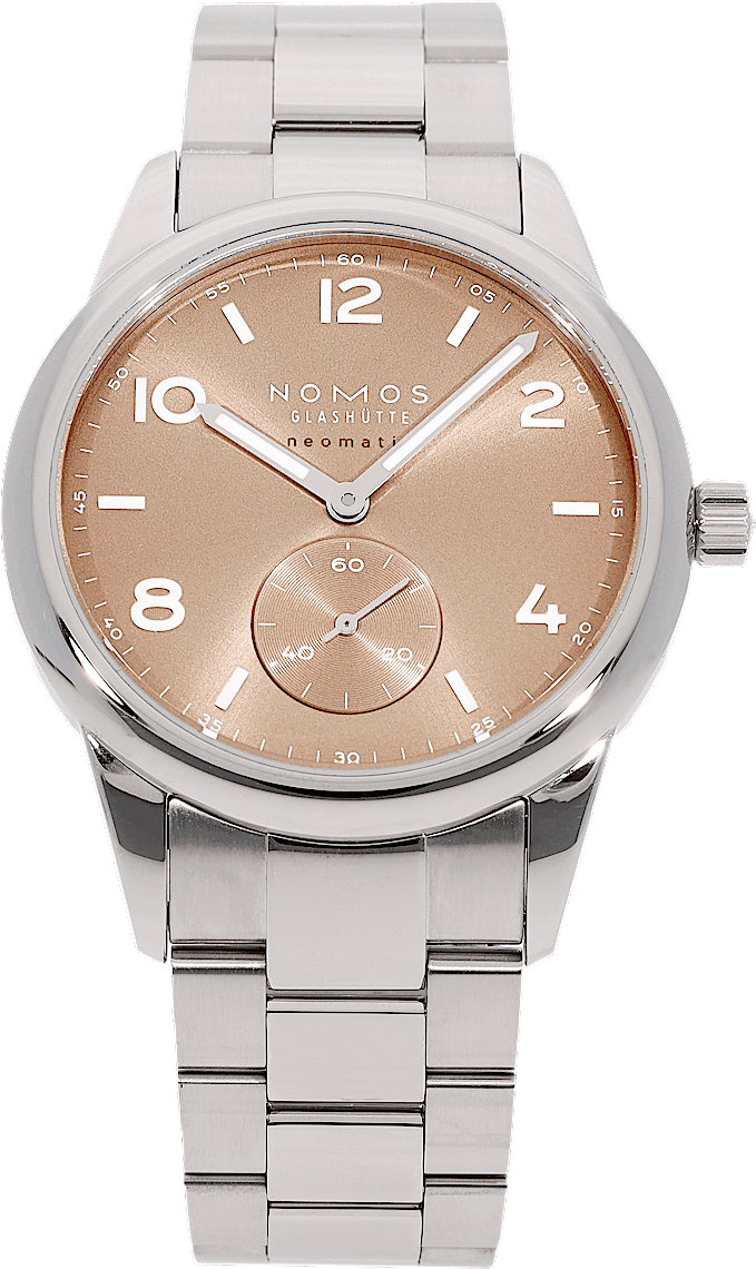 Nomos Club Sport Neomatik 39 Amber, Reference: 766, Gender: Unisex, Size: 39.5mm, Dial color: Rose, Strap material: Stainless Steel, Movement: Automatic, Year: 2023, Condition: Previously worn with some signs of usage. The movement is flawless and the case has been cleaned. watch tested to ensure full functionality. An inspection by our certified watchmakers guarantees its authenticity., Documents: Original papers, CHRONEXT Certificate