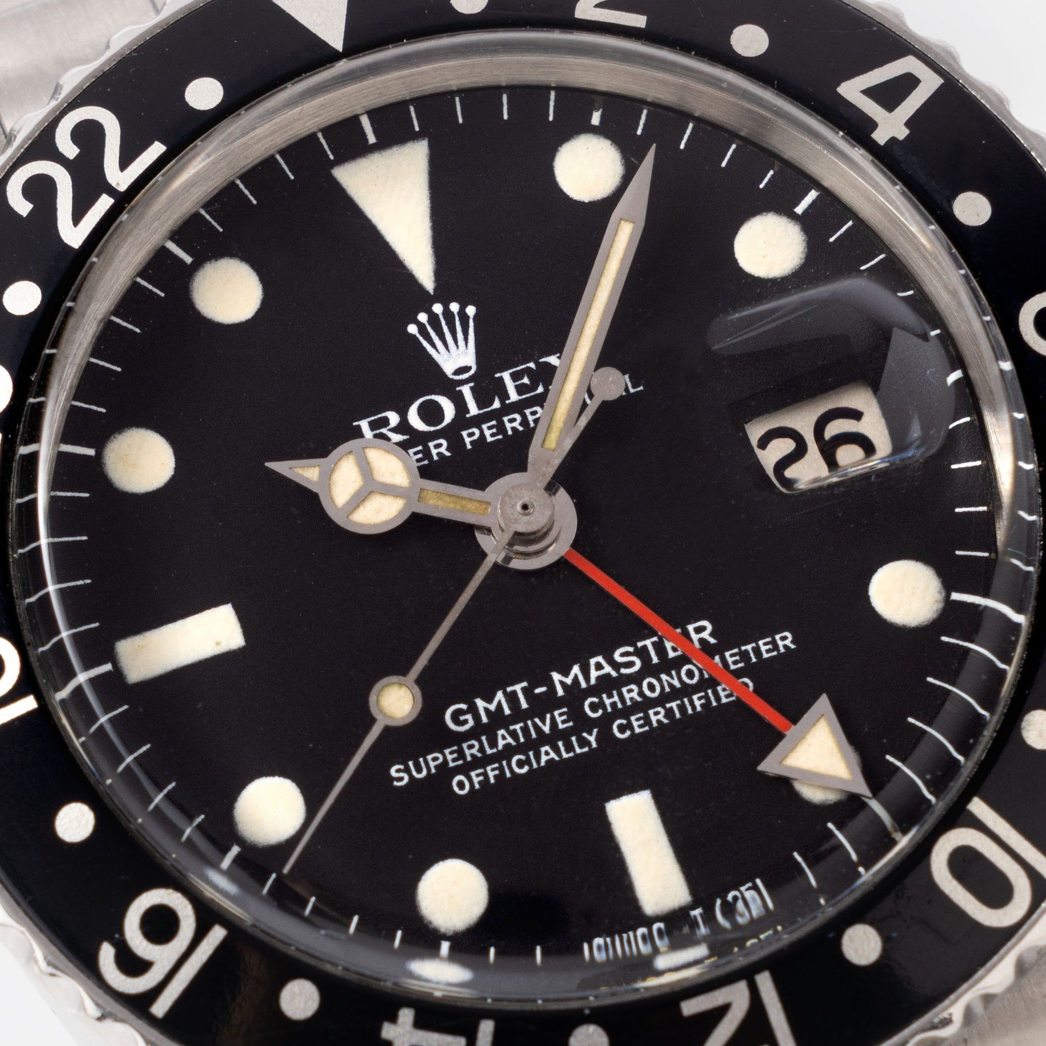 The Rolex GMT-Master 1675, produced from 1959 to 1980, stands as one of the most iconic vintage Rolex models, known for its long production run and the many subtle variations that evolved over the years. It was the sole GMT-Master reference during that era, making it especially fascinating for collectors. Throughout its lifespan, the 1675 saw numerous updates—ranging from dial changes (gilt to matte), crown guard designs (pointed to rounded), to the introduction of a larger GMT hand. While the now-famous red and blue “Pepsi” bezel was standard, an all-black bezel variant was also introduced in the early 1970s. On offer here is a matte “Mk4” dial variant, featuring a strong, well-preserved case and two bezel inserts—giving you two distinct looks with one watch. Currently fitted with a clean black insert showing only light signs of wear, the watch also comes with a bonus “Pepsi” insert. The Pepsi insert is in great condition—non-faded, with a blue back—making it a later addition, but it adds a vibrant, classic touch. The Mk4 dial itself is in excellent condition, with creamy vanilla patina on the tritium hour plots. The watch is paired with a Rolex Oyster bracelet, reference 78360, featuring 501B end links and a clasp stamped “03.” This great 1675 has just been fully checked and regulated by our watchmaker and is ready for new adventures! This GMT-Master 1675 is rocking a clean black bezel right now, but we’re throwing in a classic “Pepsi” insert too—so you can switch it up whenever the mood hits. Got questions or want to try it on? Just give us a shout! Specifications: - Rolex GMT-Master reference 1675- 40mm steel case- Serial 332xxxx dating to 1972- Mk4 matte dial- Black insert & “Pepsi” style blue back insert- Oyster bracelet ref 78360 with 501B end links- One-year mechanical warranty- Fully checked by our watchmaker- Free worldwide FedEx Priority shipping