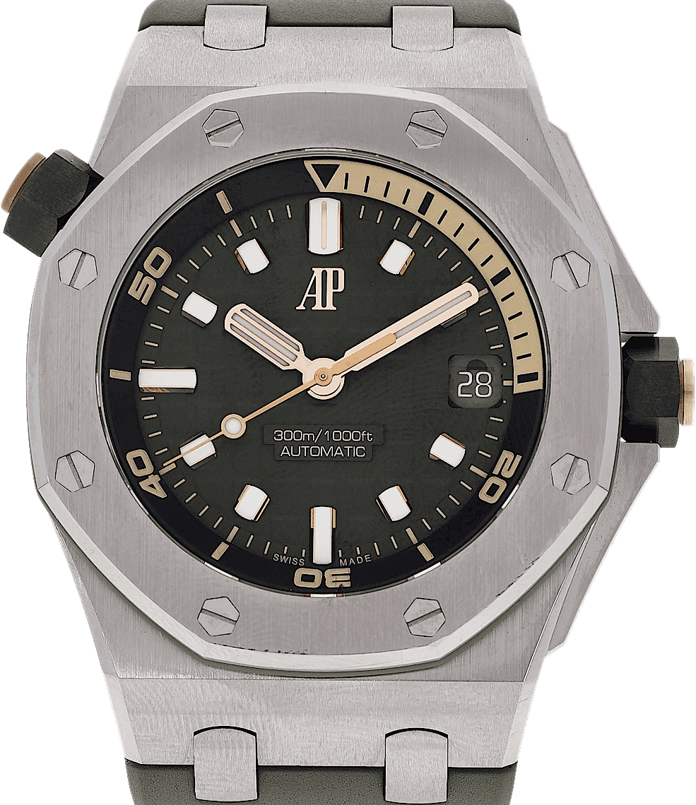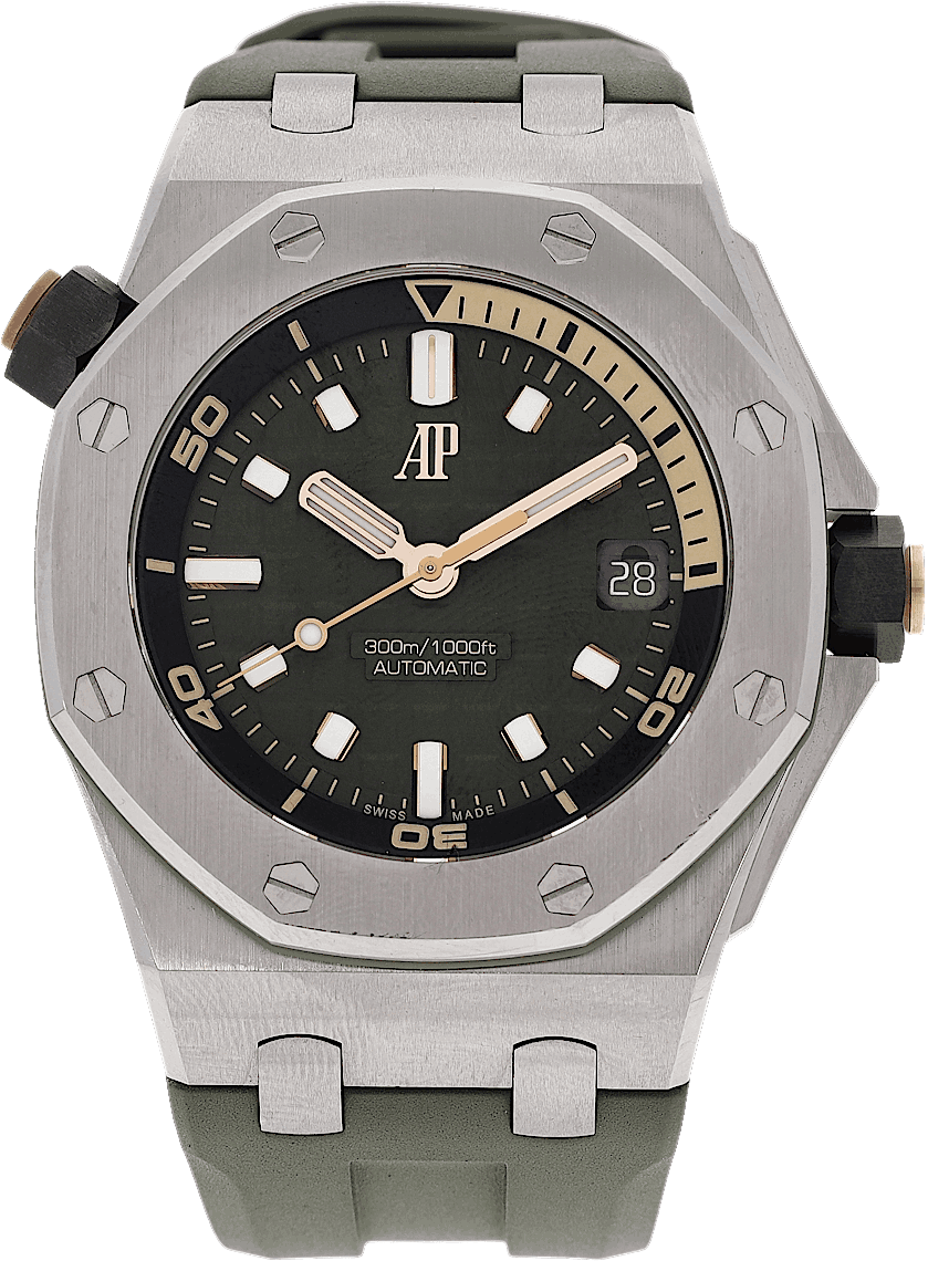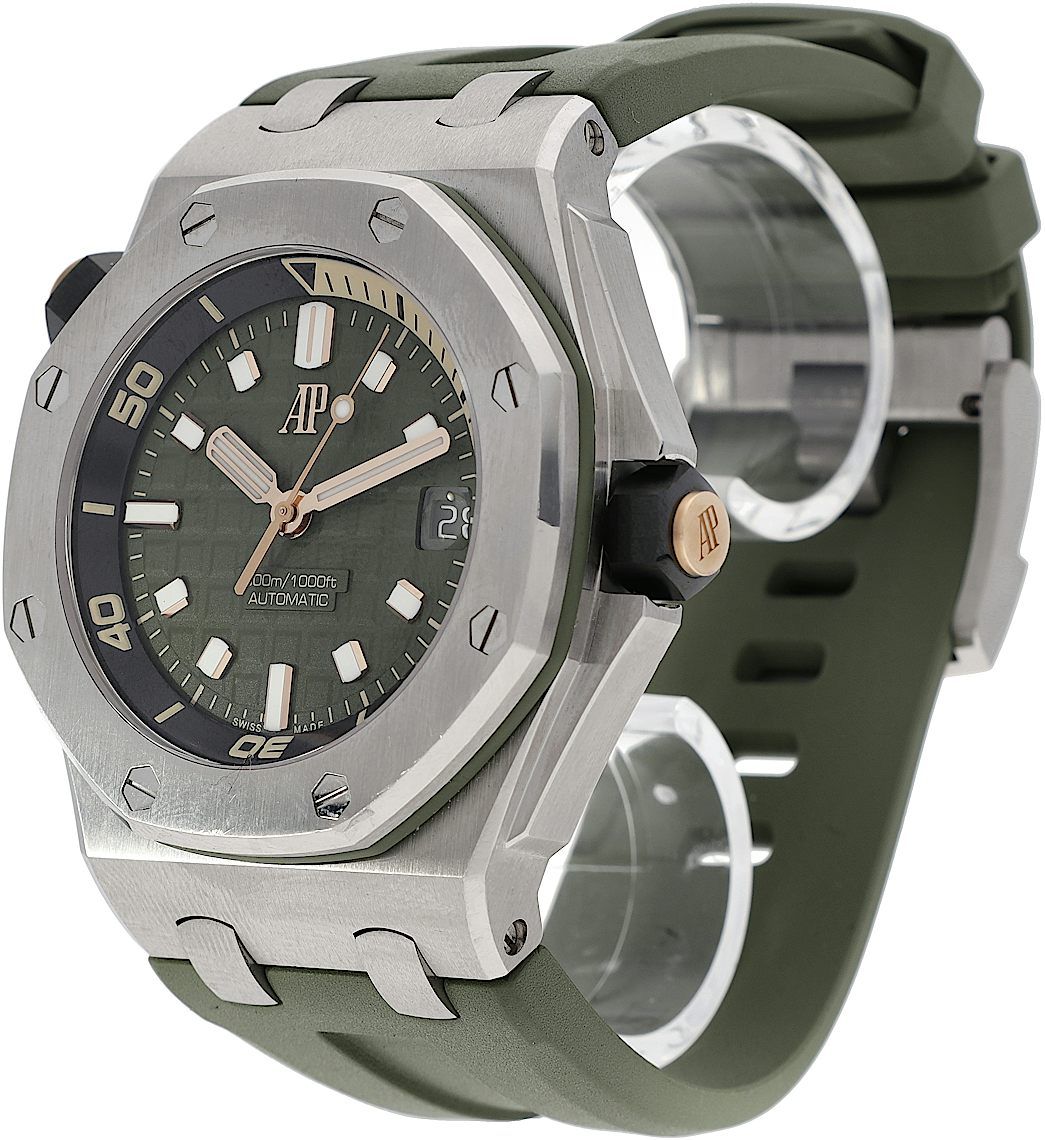 Audemars Piguet Royal Oak Offshore Diver, Reference: 15720ST.OO.A052CA.01, Gender: Male, Size: 42mm, Dial color: Green, Strap material: Rubber, Movement: Automatic, Year: 2022, Condition: Previously worn with some signs of usage. The movement is flawless and the case has been cleaned. watch tested to ensure full functionality. An inspection by our certified watchmakers guarantees its authenticity., Documents: Original papers, CHRONEXT Certificate