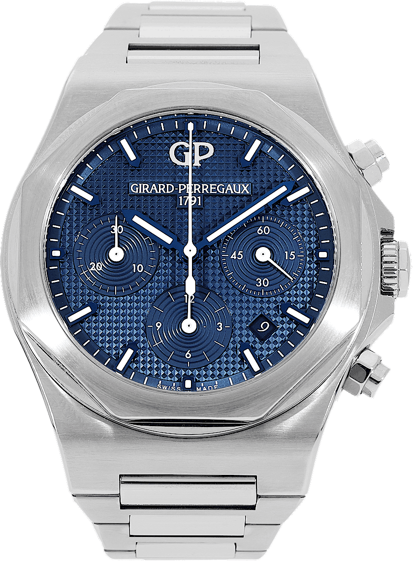 Girard Perregaux Laureato Chronograph 42 mm, Reference: 81020-11-431-11A, Gender: Male, Size: 42mm, Dial color: Blue, Strap material: Stainless Steel, Movement: Automatic, Year: 2019, Condition: Previously worn, minor to no signs of usage. The movement is flawless and the case has been cleaned. watch tested ensure full functionality. An inspection by our certified watchmakers guarantees its authenticity., Documents: Original papers, CHRONEXT Certificate