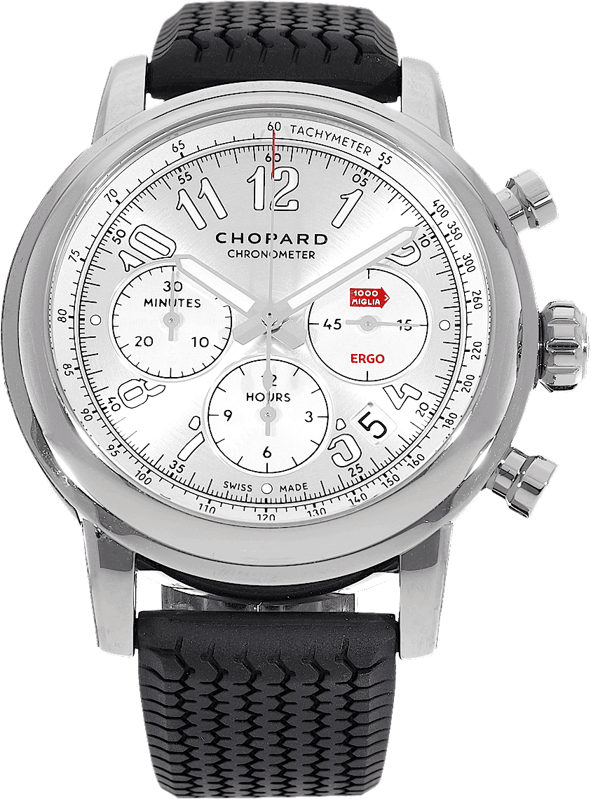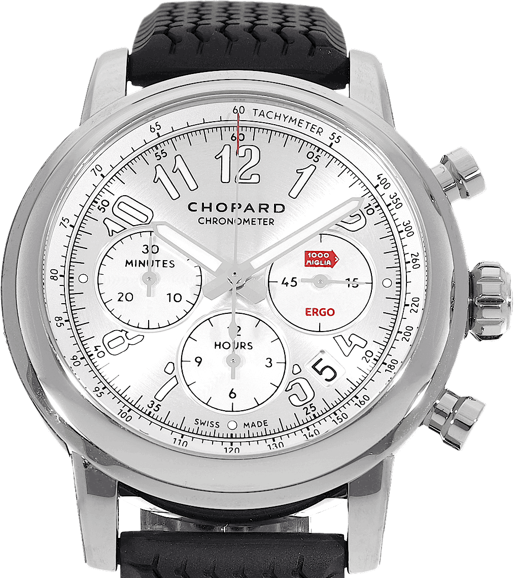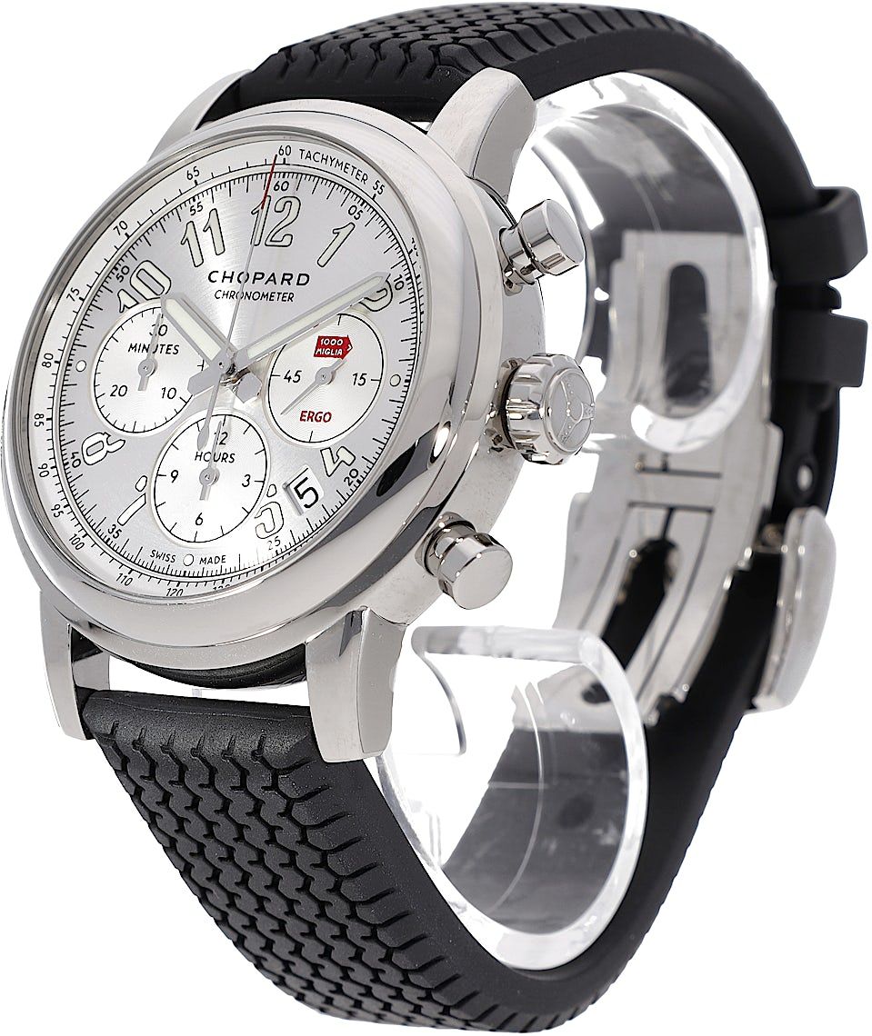 Chopard Mille Miglia Chronograph, Reference: 168511-3015, Gender: Male, Size: 42mm, Dial color: Silver, Strap material: Rubber, Movement: Automatic, Condition: Previously worn, minor to no signs of usage. The movement is flawless and the case has been cleaned. watch tested ensure full functionality. An inspection by our certified watchmakers guarantees its authenticity., Documents: Chronext Certificate