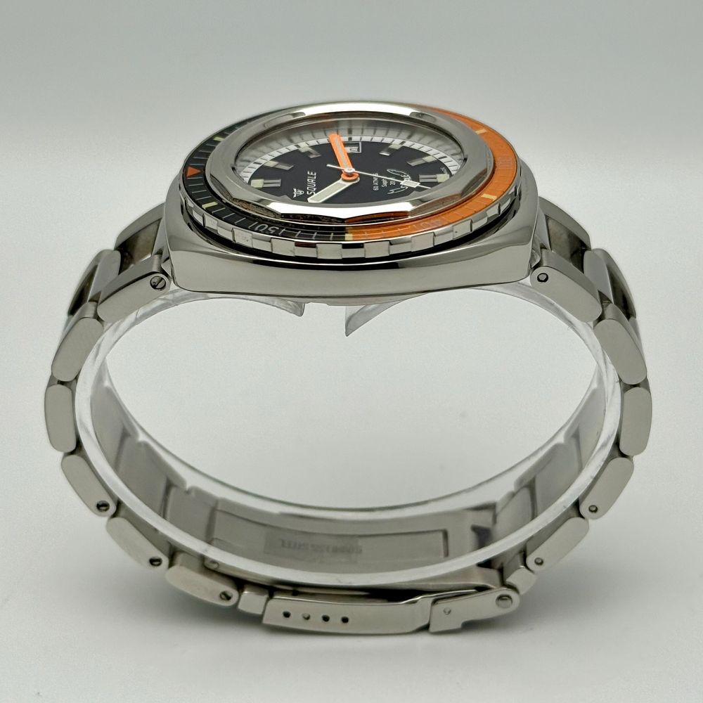 The new Square 2001 limited edition, consisting of only 300 pieces, is a faithful reproduction of the model chosen by Jacques Cousteau. The new version of the Squale 2001 retains the exact proportions and dimensions of the original. The asymmetric barrel-shaped case, with hidden lugs, makes the 43 mm length feel more compact. The overall diameter is 40 mm, with a crown positioned at 4 o'clock, perfectly integrated into the case.