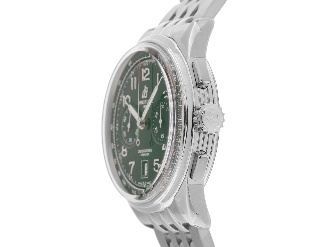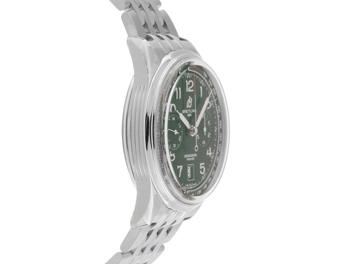 Gehäuse Edelstahl poliert und satiniert, Gehäusedurchmesser ohne Krone 42mm, Gehäusehöhe 13,6mm. Lünette Edelstahl glatt und poliert. Armband Edelstahl poliert, Breitling Sicherheitsfaltschließe Edelstahl mit Hersteller-Logo. Zifferblatt British Racing Green mit aufgesetzten Edelstahl Indexen und Edelstahl Leuchtzeigern. Uhrwerk Automatik, Chronograph, Chronometer mit Zeugnis, Breitling Manufakturkaliber 01 mit 41 Edelsteinen, Gangreserve ca. 70 Stunden. Anzeige von Stunde und Minute über Zeiger aus der Mitte, kleine Sekunde mit Sekundenstopp zur sekundengenauen Einstellung der Uhrzeit bei 9 Uhr, Datumsanzeige mit Schnellverstellung bei 6 Uhr. Saphirglas kratzfest, gewölbt und doppelseitig entspiegelt. Krone mit Hersteller-Logo. Boden Edelstahl verschraubt und graviert mit Saphirglas Sichtfenster. Gewicht der Uhr inklusive Armband 166g, Länge des Armbandes inkl. Gehäuse 220mm. Wasserdicht bis 10 ATM. Referenznummer: AB0118A11L1A1, ID: ST1160127000625H-9350, Artikelnummer: 10000080705. Original Breitling Box mit Umkarton und Garantie Papiere von 2025, Full Set. Ungetragen. Lieferzeit sofort.