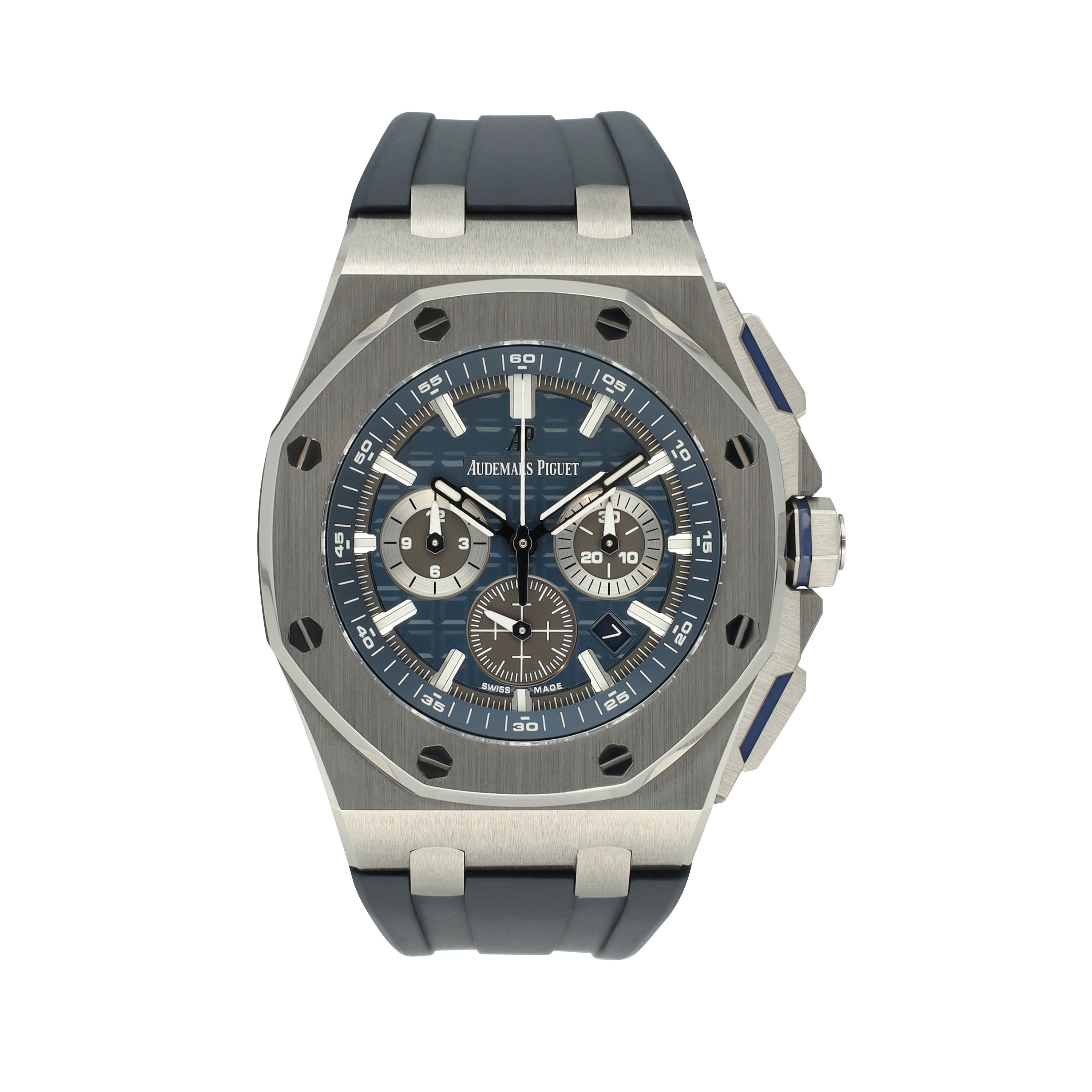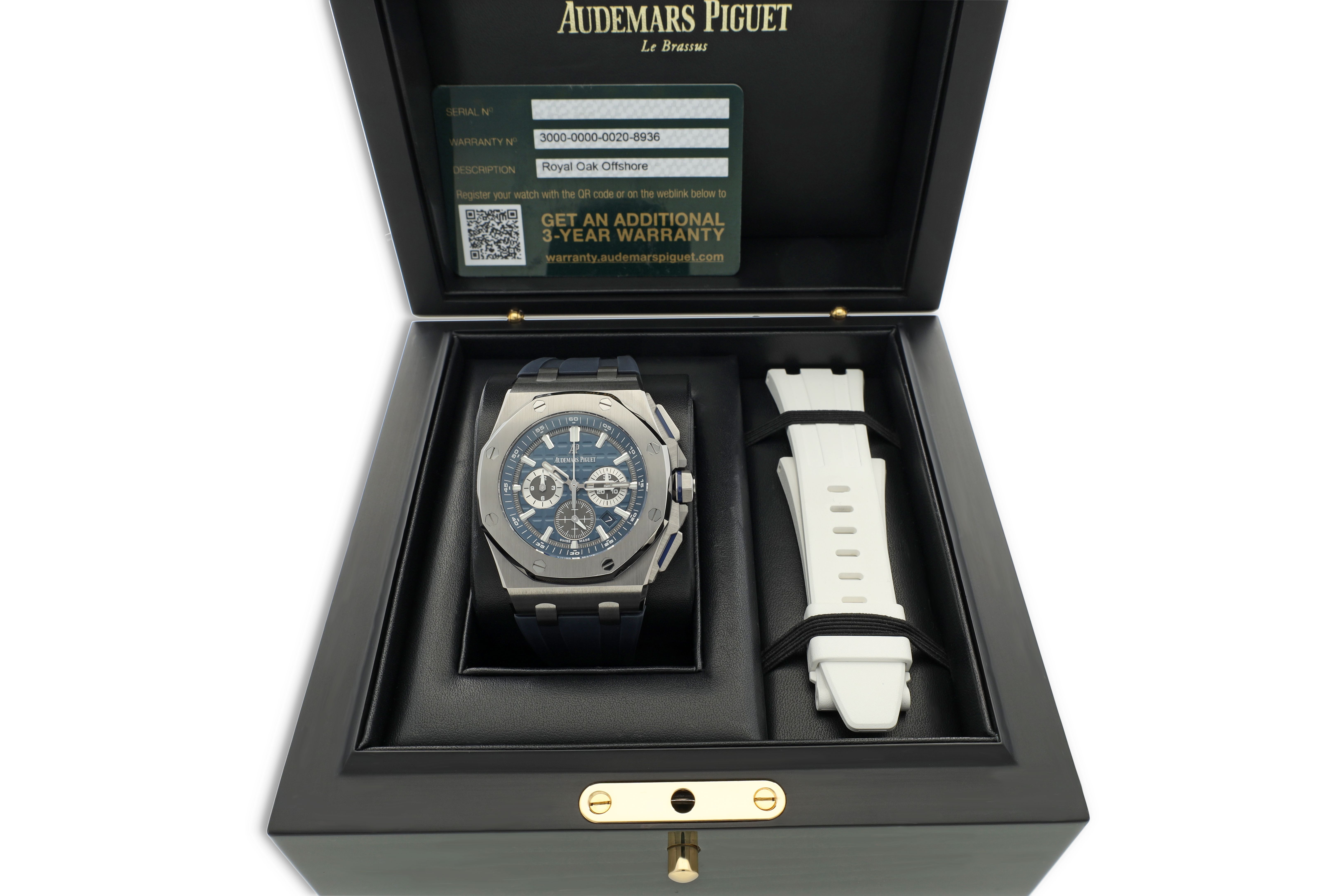The Audemars Piguet Royal Oak Offshore with reference 26480TI from 2020 comes as a full set, including the original box, papers, booklets, and warranty card. This striking model features a blue dial with the iconic “Méga Tapisserie” pattern, offering a bold yet elegant take on the Royal Oak Offshore’s legendary design.