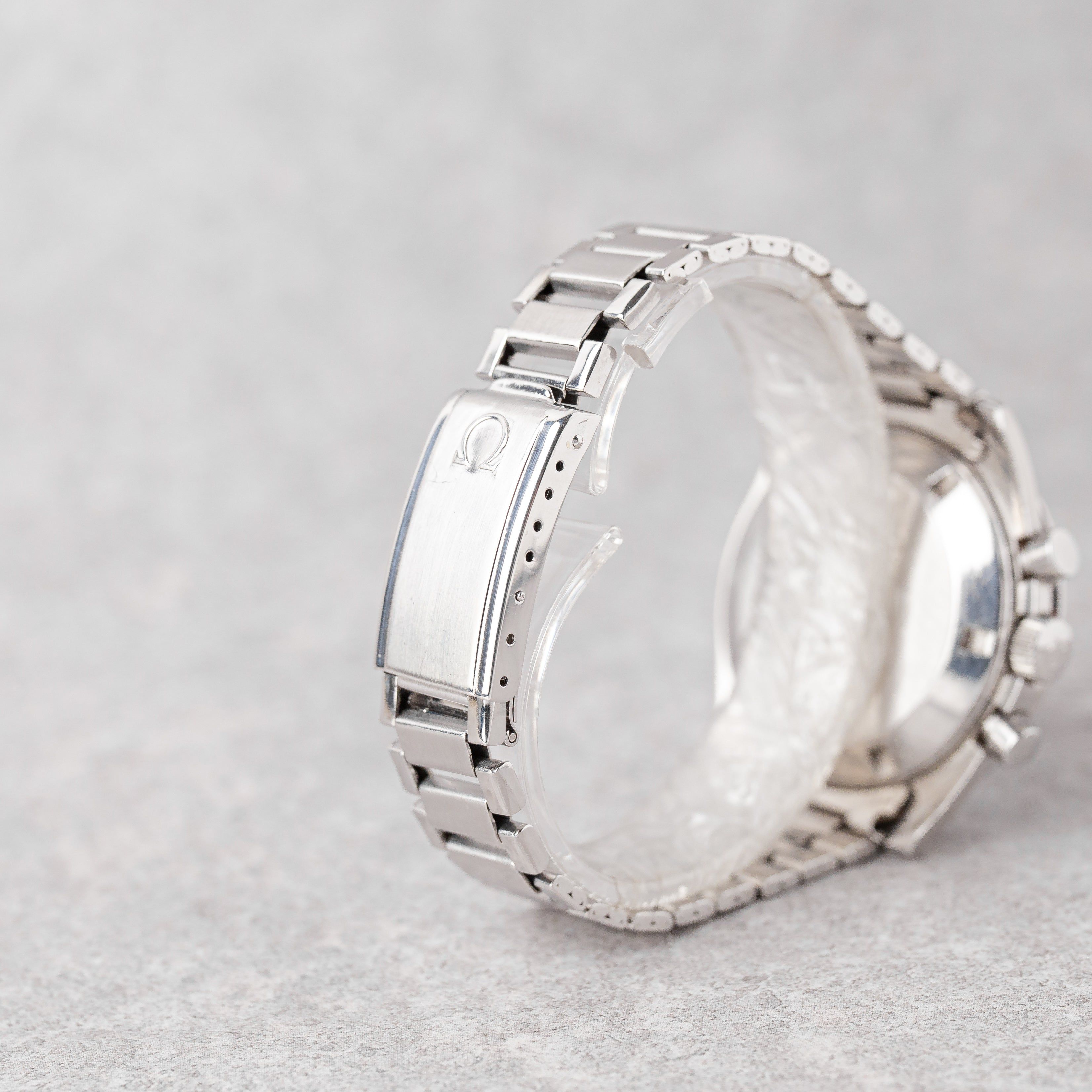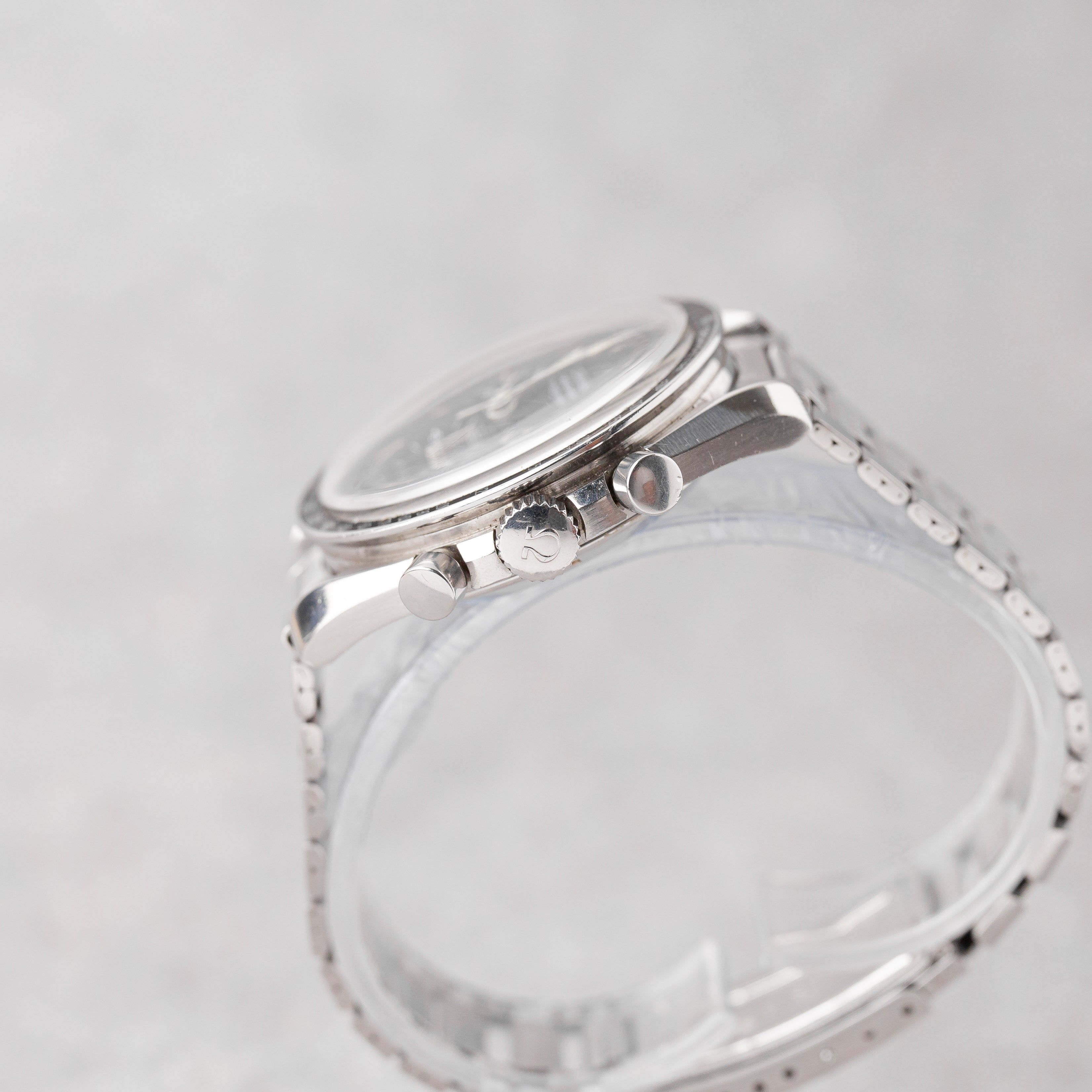 Historic Speedmaster with rare CB case (Centrale Boites), originally sold in Portugal as confirmed by the Omega Extract of Archives and the vintage Portuguese import hallmark on the upper left lug. Comes with its original steel bracelet and an additional new hybrid strap featuring the original Omega deployant clasp.Last serviced in late 2021, fully checked and running well, tested by our watchmaker. 6 months of guarantee from us. A collector’s gem with true provenance.