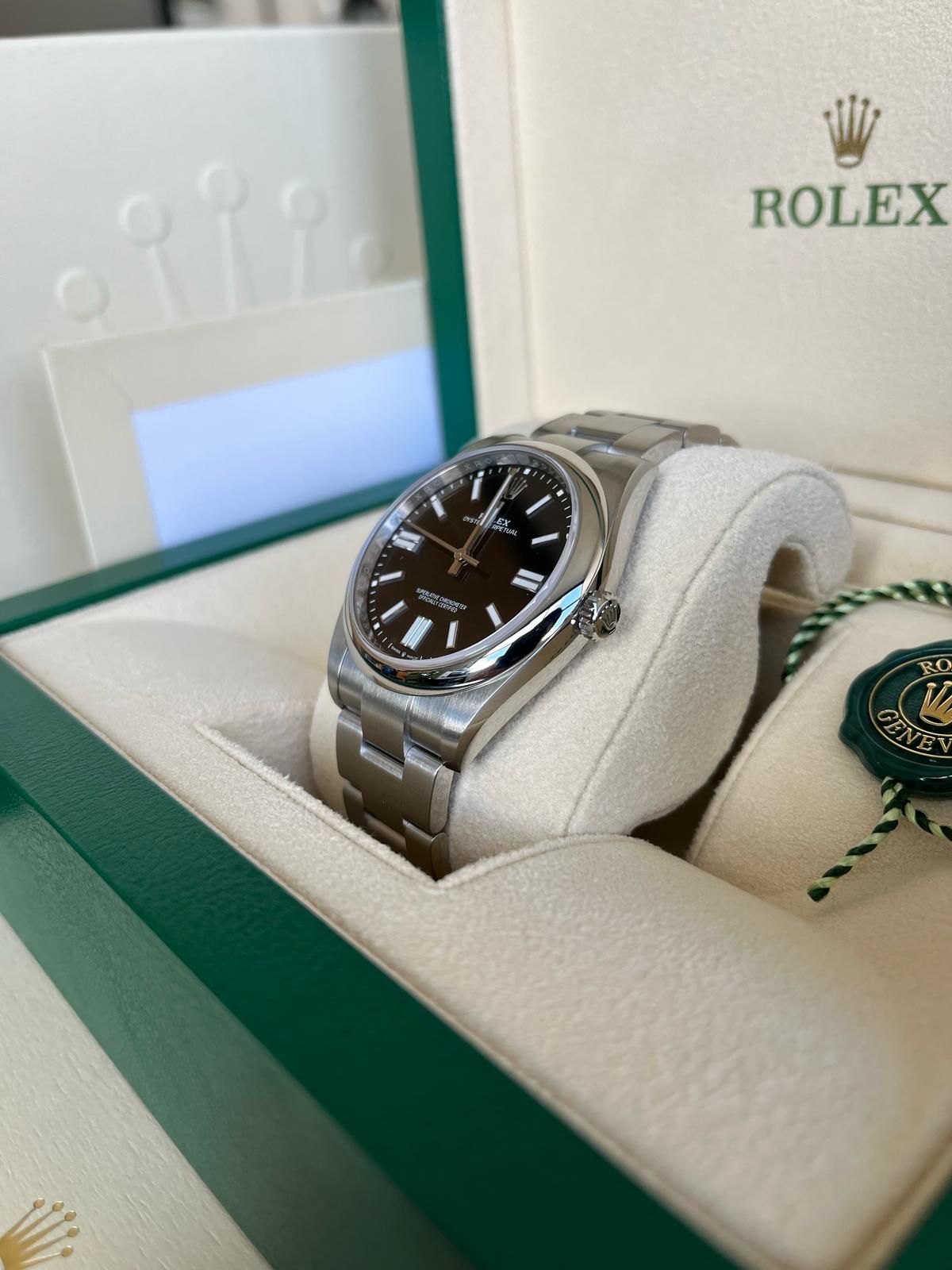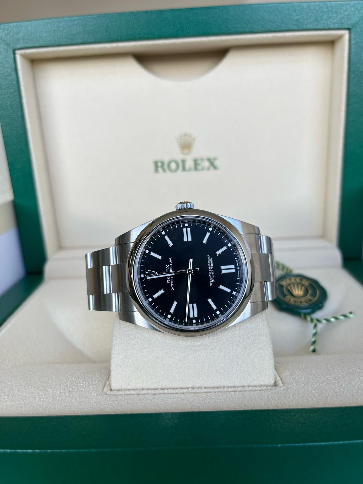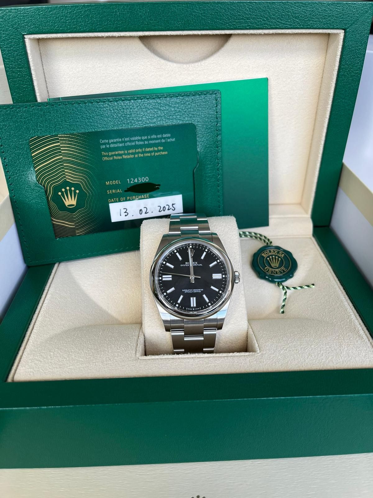 The Oyster Perpetual 124300 in 41mm pairs Rolex’s classic Oystersteel case with a sleek black dial for a clean, versatile look. Its in-house caliber 3230 delivers 70 hours of power reserve and outstanding chronometer performance. The brushed Oyster bracelet and polished bezel add subtle contrast to the minimalistic dial. A refined everyday Rolex that balances modern build quality with timeless design.