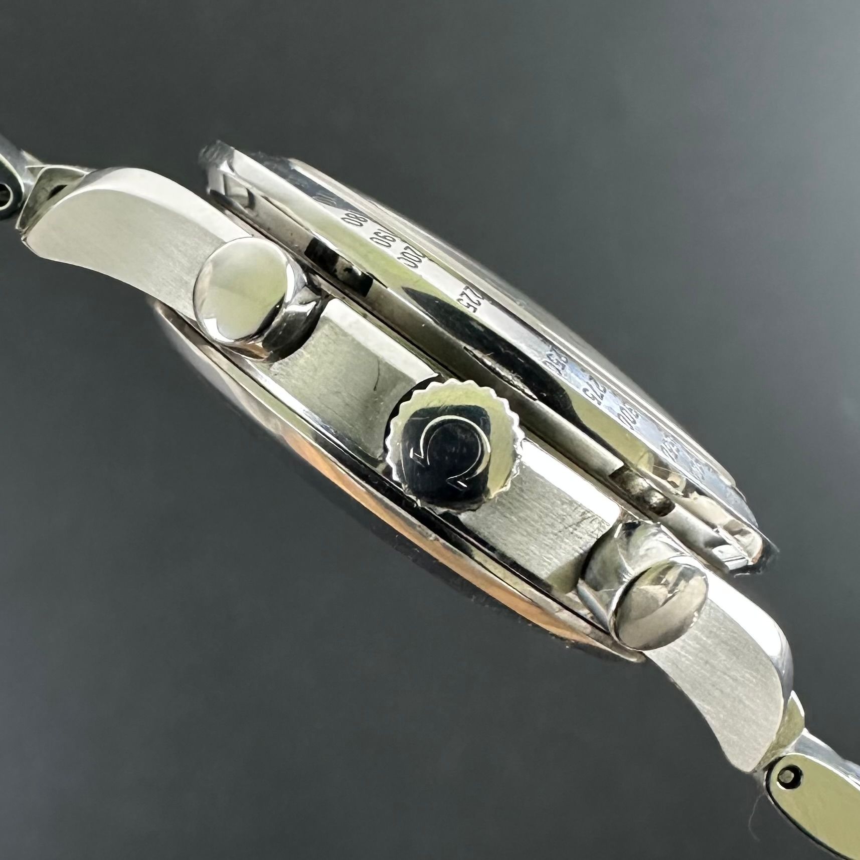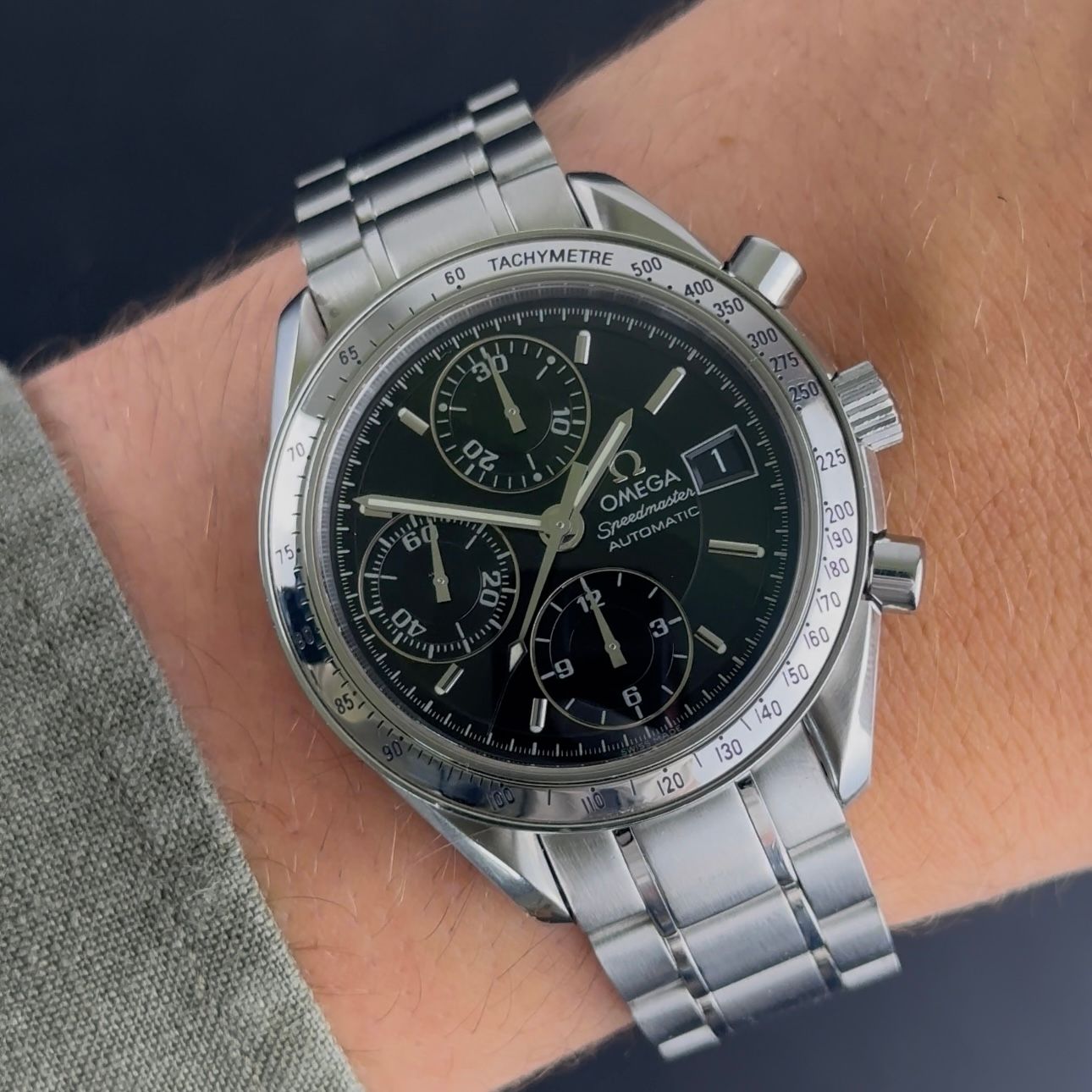 This vintage Omega Speedmaster Date, produced in 1998, features a 39mm case, commonly referred to as the Speedmaster Reduced, though not officially named as such. The watch remains in exceptional condition, with its original unpolished finish fully intact. It comes on the original 1563/850 bracelet, the original version for this model, with almost links present, including eight removable ones, suitable for a wide range of wrist sizes. Powered by the automatic caliber 1152, it was just serviced in July 2025 and runs flawlessly. Included is the original Omega tag, showing the reference, serial, movement numbers, and pictographs. Its outstanding condition makes it ideal for collectors or as a reliable daily wearer.