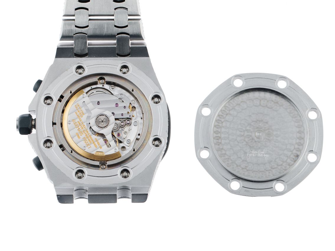 Der gesamte Brillantbesatz ist nicht von Audemars Piguet sondern in Pforzheimer Meisterwerkstatt nachträglich angebracht, ca. 1525 Diamanten / Brillanten, zusammen ca. 23,50ct TW / VSI (feines Weiß mit sehr kleinen Einschlüssen). Gehäuse Edelstahl komplett mit Diamanten besetzt, Gehäusedurchmesser ohne Krone 44mm, Gehäusehöhe 14,3mm. Lünette Edelstahl 8-eckig, 8-fach verschraubt mit Diamanten besetzt. Audemars Piguet Armband Edelstahl auch seitlich komplett mit Diamanten besetzt. Audemars Piguet Doppelfaltschließe aus Edelstahl mit Hersteller-Logo, verschraubte Bandstege und komplett mit Diamanten besetzt. Zifferblatt mit Diamanten-Vollbesatz, aufgesetzte arabische Ziffern, Perlmutt Hilfszifferblättern und schwarzen Zeigern. Uhrwerk Automatik Chronograph, Audemars Piguet Manufakturkaliber 3126 mit 54 Edelsteinen. Anzeige von Stunde und Minute über Zeiger aus der Mitte, kleine Sekunde mit Sekundenstopp zur sekundengenauen Einstellung der Uhrzeit bei 12 Uhr, Datumsanzeige mit Schnellverstellung unter Glaslupe bei 3 Uhr. Saphirglas kratzfest. Krone im Kautschukmantel verschraubbar mit Flankenschutz und Hersteller-Logo. Boden Edelstahl 8-fach verschraubt und graviert. Gewicht der Uhr inklusive Armband 211g, Länge des Armbandes inklusive Gehäuse 185mm. Referenznummer: 26170ST.00.D101CR.02, Gehäusenummer: D46XXXNo.26X, Baujahr 2006, ID: P3393960000320H-98000, Artikelnummer: 10000051773. Mit Gangkontrolle und äußerlicher Aufarbeitung von Januar 2024, inkl. 1000 Tage Garantie. Original Audemars Piguet Box mit Umkarton und Beschreibung sowie Uhrenpass. Superschnäppchen. Kapitalanlage mit Wertsteigerungspotential, extrem seltenes Sammlerstück, aus erster Hand, Tresoruhr, fast nicht getragen. Komplett mit Brillanten besetzt, mehr geht nicht! Wie Neu. Lieferzeit sofort.
