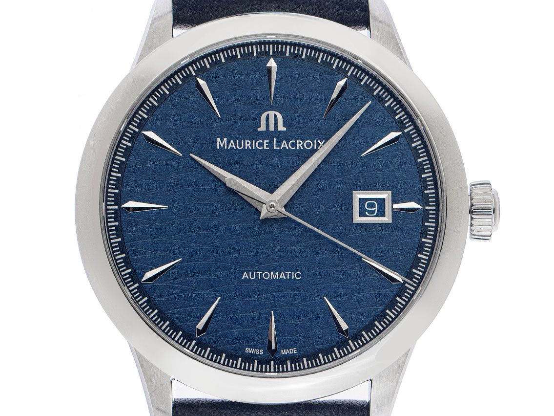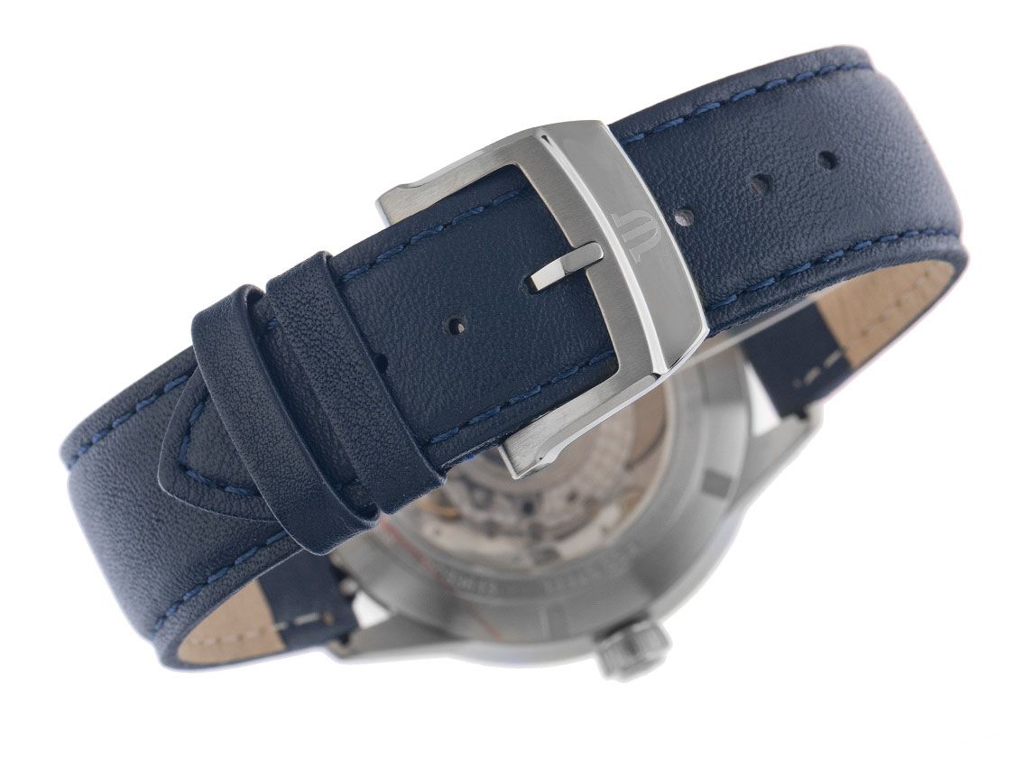 Gehäuse Edelstahl poliert und Satiniert, Gehäusedurchmesser ohne Krone 40mm, Gehäusehöhe 9,2mm. Armband Leder blau mit Ziernaht, Anstoßbreite 20mm, Faltschließe Edelstahl mit Hersteller-Logo. Zifferblatt blau mit texturierte Oberfläche mit aufgesetzten Edelstahl Indexen und Edelstahl Zeigern. Uhrwerk Automatik, Kaliber ML155 mit 25 Edelsteinen, Gangreserve ca. 42 Stunden. Anzeige von Stunde, Minute und Sekunde über Zeiger aus der Mitte mit Sekundenstopp zur sekundengenauen Einstellung der Uhrzeit, Datumsanzeige mit Schnellverstellung bei 3 Uhr. Saphirglas kratzfest und gewölbt. Krone geriffelt mit Hersteller-Logo. Boden Edelstahl verschraubt und graviert mit Saphirglas Sichtfenster. Gewicht der Uhr inklusive Armband 64g. Referenznummer: 756108-SS001-430-4, ID: ST197519040725H-1600, Artikelnummer: 10000081302. Original Maurice Lacroix Box mit Umkarton und Garantie Papiere, Full Set. Limitiert auf 888 Exemplare. Neu. Lieferzeit sofort.