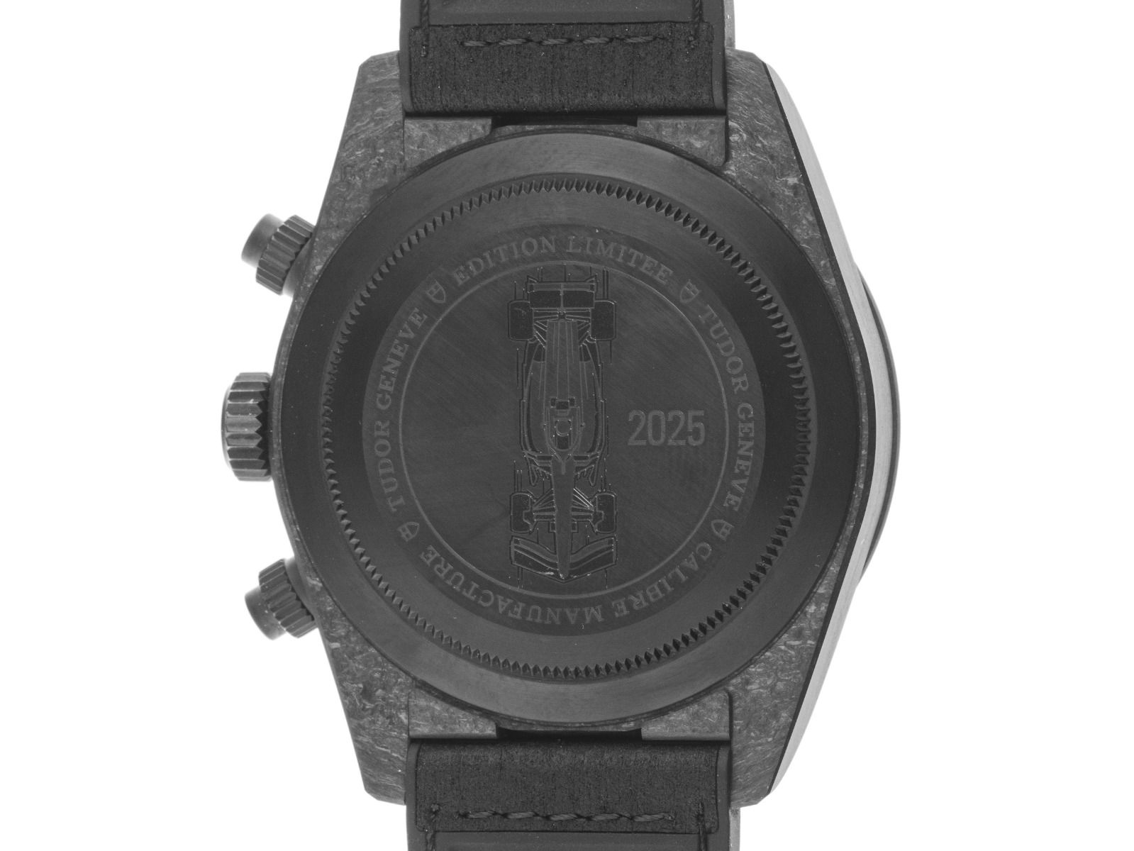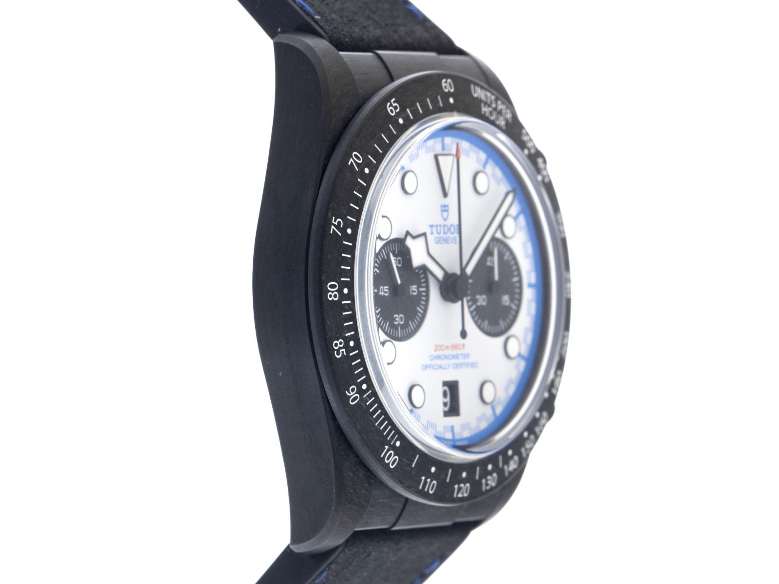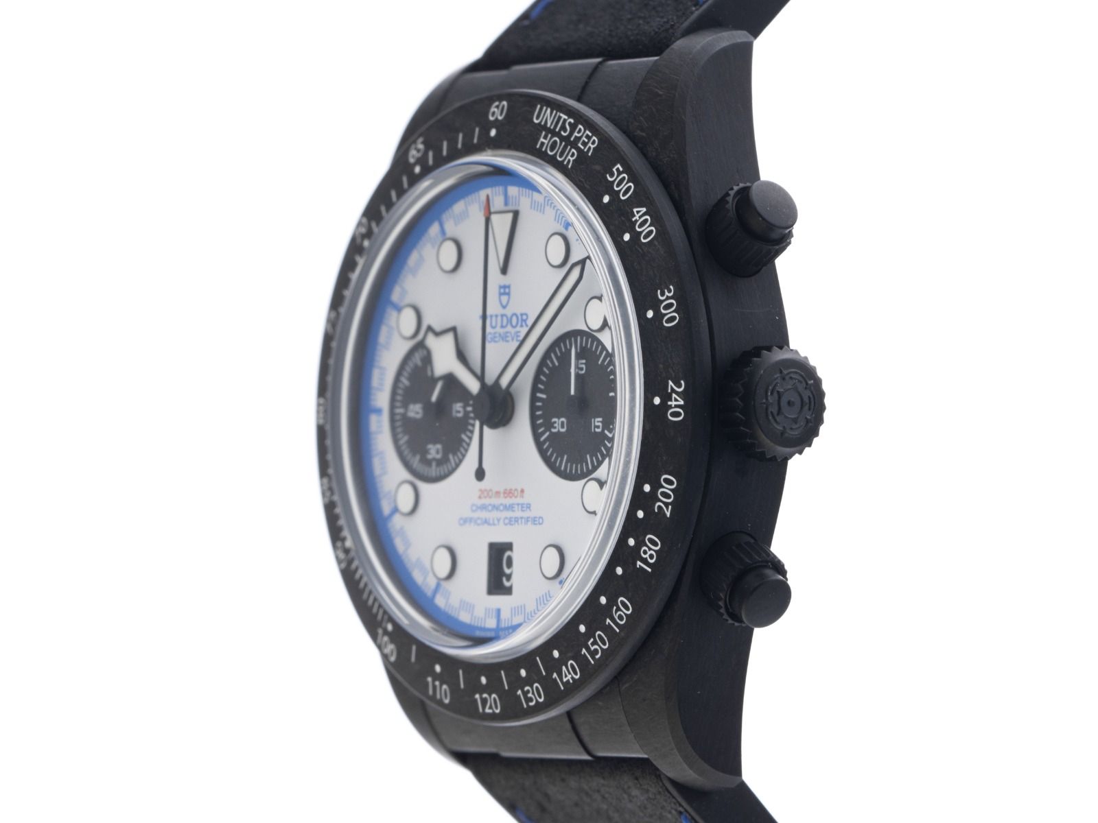 Gehäuse Carbon schwarz satiniert, Gehäusedurchmesser ohne Krone 42mm, Gehäusehöhe 14,3mm. Lünette Carbon mit Tachymeterskala. Armband Kautschuk schwarz mit blauer Ziernaht, Anstoßbreite 22mm, Stiftschließe Carbon mit Hersteller-Logo. Zifferblatt weiß matt mit aufgesetzten Leuchtindexen und schwarzen Leuchtzeigern. Uhrwerk Automatik, Chronograph, Chronometer mit Zeugnis (COSC), Kaliber Tudor MT5813. Anzeige von Stunde und Minute über Zeiger aus der Mitte, kleine Sekunde mit Sekundenstopp zur sekundengenauen Einstellung der Uhrzeit bei 9 Uhr, Datumsanzeige mit Schnellverstellung bei 6 Uhr. Saphirglas kratzfest. Krone verschraubbar mit Hersteller-Logo, Chronographendrücker verschraubbar. Boden Edelstahl PVD beschichtet, verschraubt und graviert. Gewicht der Uhr inklusive Armband 77g. Referenznummer: 79377KN-0001, ID: P1296160000725H-12600/7350, Artikelnummer: 10000081707. Original Tudor Box mit Umkarton und Garantie Papiere von Juli 2025 sowie Beschreibung sowie Watchregister Auszug von Juli 2025, The Watch Register Zertifikat / ohne Eintrag (Internationale Datenbank für verlorene oder gestohlene Uhren), Full Set. Ungetragen. Lieferzeit sofort.