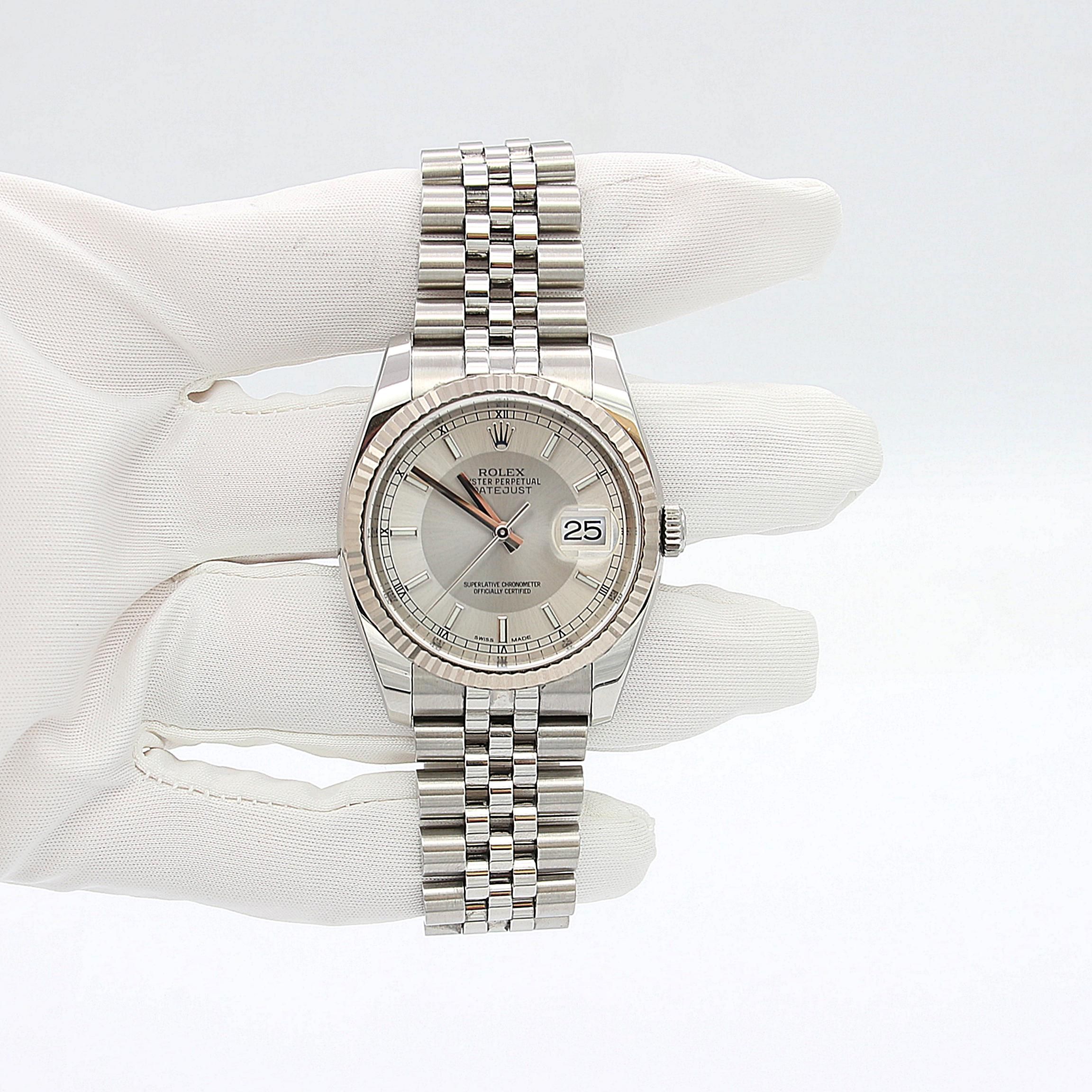 For sale at Debonar Watches: pre-owned Rolex Datejust 116234, in excellent conditions, with a superb silver and grey dial called "Tuxedo", full set.Invest in a piece of Rolex history—the Datejust 116234 carries the legacy of one of the world’s most iconic watch models.This exemplar has been paired with a Jubilee bracelet, the most classic option with a Datejust. If you’re only going to be wearing one watch from now on, it needs to be one that you can wear in any situation: the Rolex Datejust 36mm ref 116234. This is the modern descendent of the classic DJs of the 1950s: the one we have here is the classic 36mm size, not the 41mm Datejust II. A bit of its story:Rolex DateJust (inspired by Rolex Bubbleback) was first introduced in 1945 to celebrate the 40th anniversary of Rolex. The Datejust is one of the earliest Rolex models that survives till today.From its debut way back in 1945, a revolutionary launch that put the brand firmly on the map, it has remained at the top of the company’s bestseller list for three quarters of a century. BRAND ROLEX MODEL DATEJUST REFERENCE 116234 CASE MATERIAL STEEL MOVEMENT AUTOMATIC DIMENSION 36 MM DIAL SILVER / GREY BEZEL WHITE GOLD CRYSTAL SAPPHIRE BRACELET TYPE JUBILEE BRACELET MATERIAL STEEL BRACELET LENGHT 18 CM ORIGINAL BOX YES ORIGINAL PAPERS YES (CARD) YEAR 2010-3 CONDITION EXCELLENT