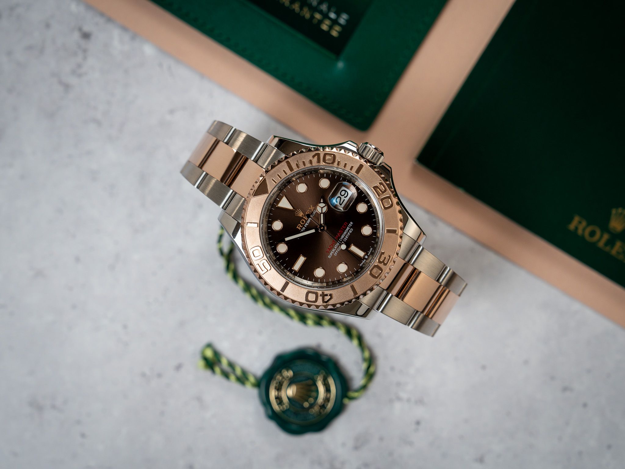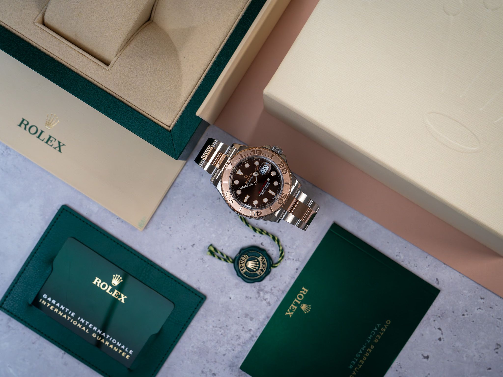 Rolex Yacht-Master 126621 with the chocolate brown dial in Everose Rolesor/steel and Oyster bracelet. This watch was originally sold in 2023 and comes as a full set, including the original box, warranty card, and booklets.