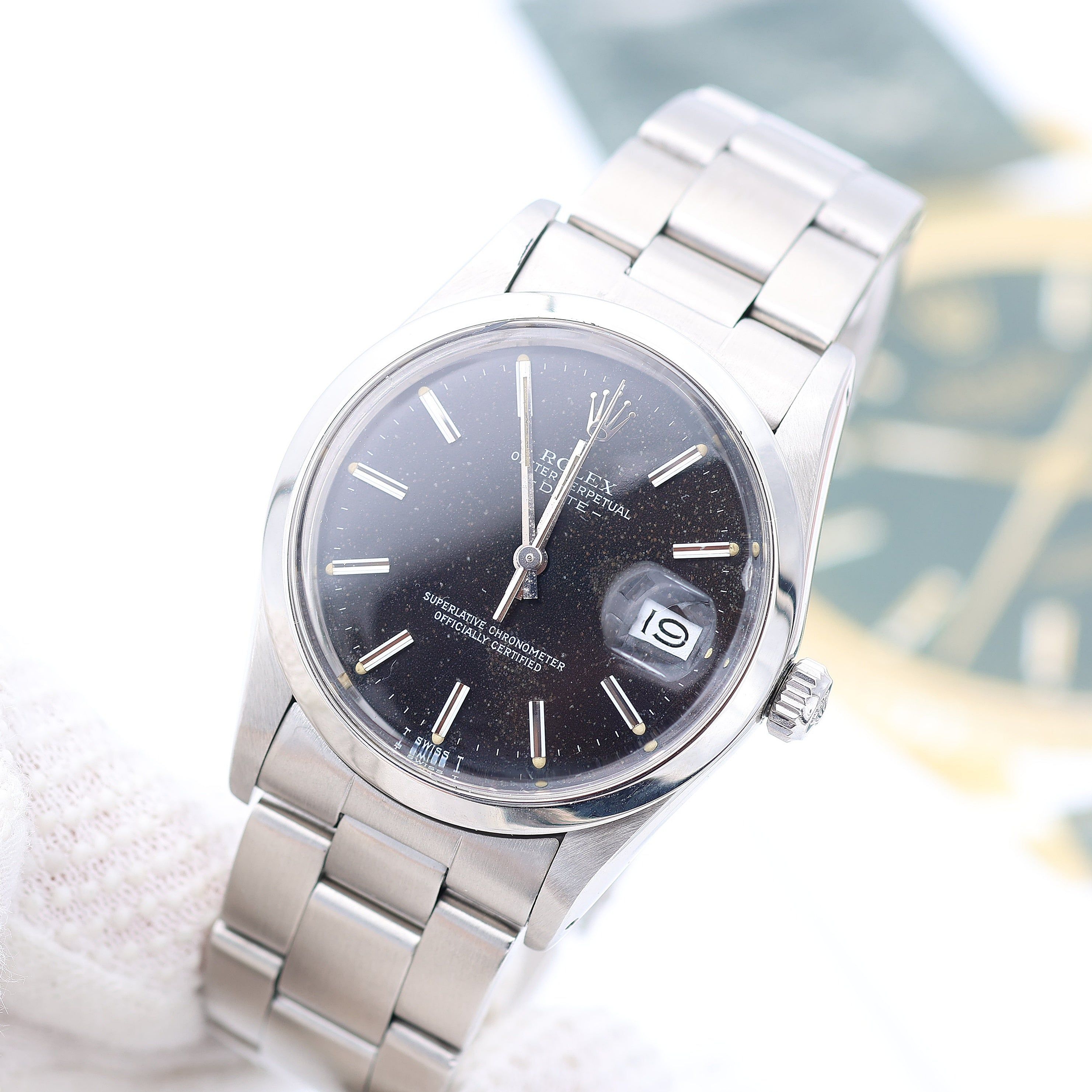 For sale at Debonar Watches: pre-owned Rolex Oyster Perpatual Date ref. 15000, with quickset date function.This Rolex has a sportive black dial, perfect for everyday: please noticed the little white spots on the dial - they are part of the vintage charm of this watch.On top is a smooth polished bezel, giving an attractively minimalist frame to the dial. The Rolex Date Stainless Steel with white roman dial 15000 is one of the most classic Rolex watches ever made. Released to market in the 1980’s, you can be sure you are gaining a precise, reliable, and highly fashionable Rolex Date watch.The Date Rolex features a acrylic crystal, Rolex Chronometer, waterproof stainless steel case 34mm in diameter, smooth bezel.The dials always say DATE. BRAND ROLEX MODEL DATE REFERENCE 15000 CASE MATERIAL STEEL MOVEMENT AUTOMATIC DIMENSION 34 MM DIAL BLACK BEZEL STEEL CRYSTAL PLEXIGLASS BRACELET TYPE BRACELET BRACELET MATERIAL STEEL BRACELET LENGHT 16 CM ORIGINAL BOX NO ORIGINAL PAPERS NO YEAR APPROX. THE '70s CONDITION VERY GOOD