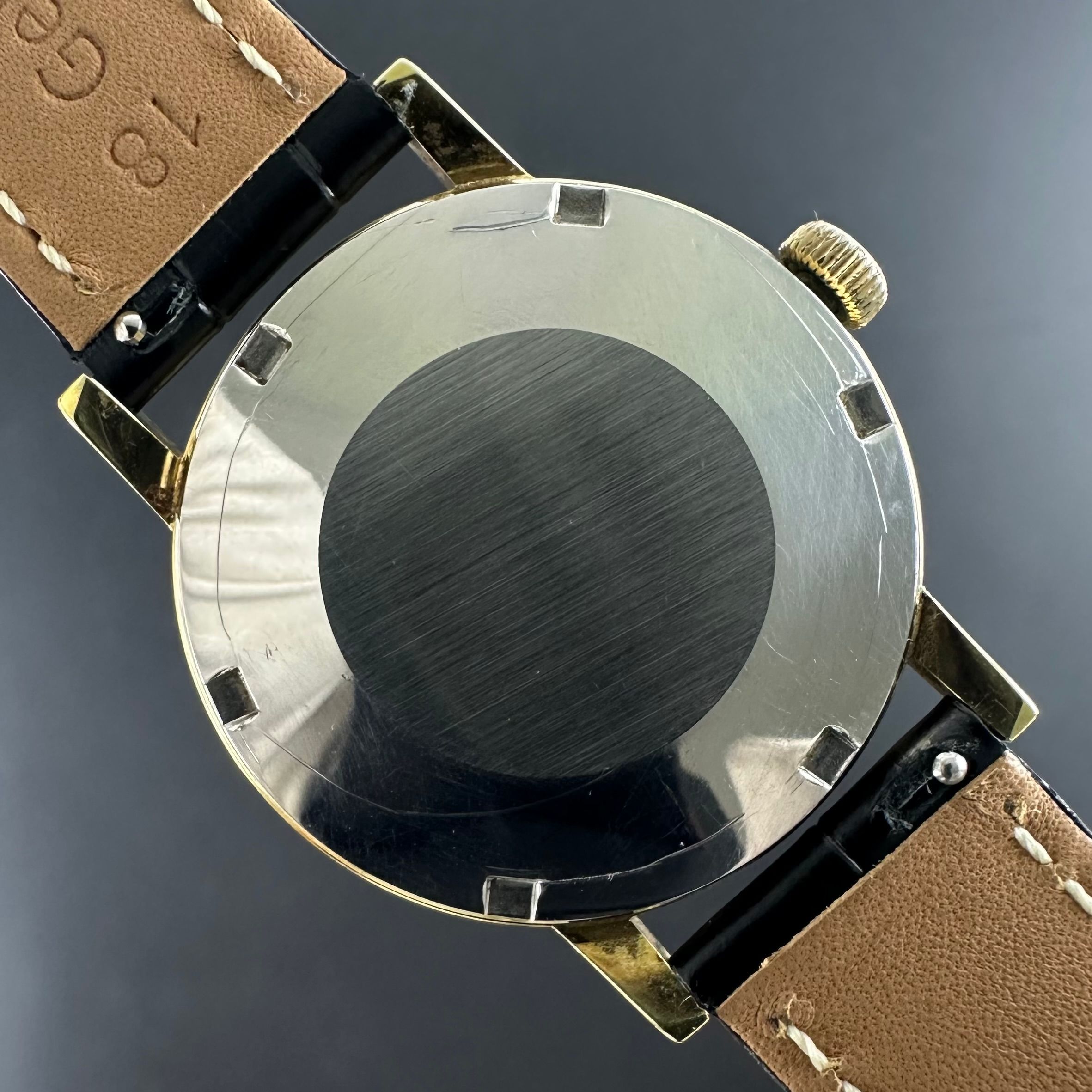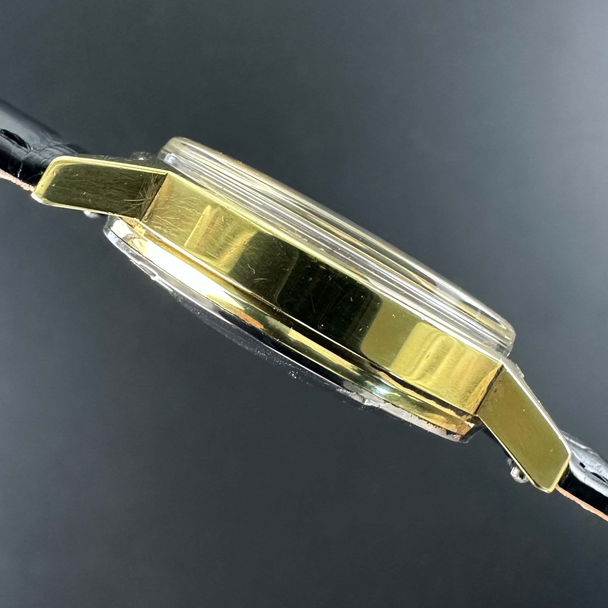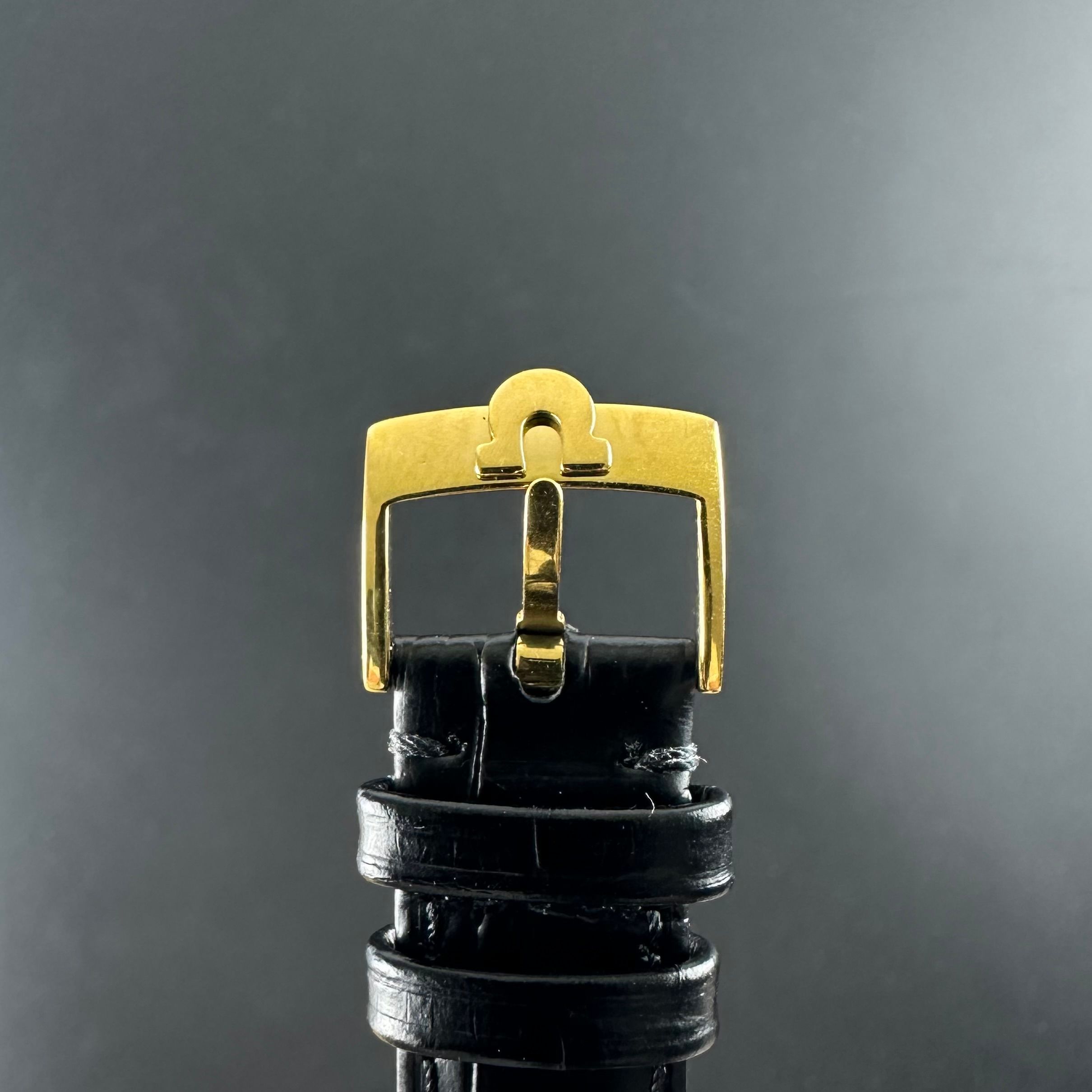 This vintage Omega Genève Automatic was produced in 1973 and features a white vertically brushed dial with gold and black accents and a date window at 3 o’clock. The 35mm gold-plated case (excluding crown) houses a caliber 1481 movement, serviced in July 2025 and currently running excellently. The original crown shows wear but still operates the push date function properly. The watch is fitted with a black calf leather strap with a crocodile grain motif, aside from the strap, it remains completely original and in good condition, with an especially well-preserved, untouched dial.