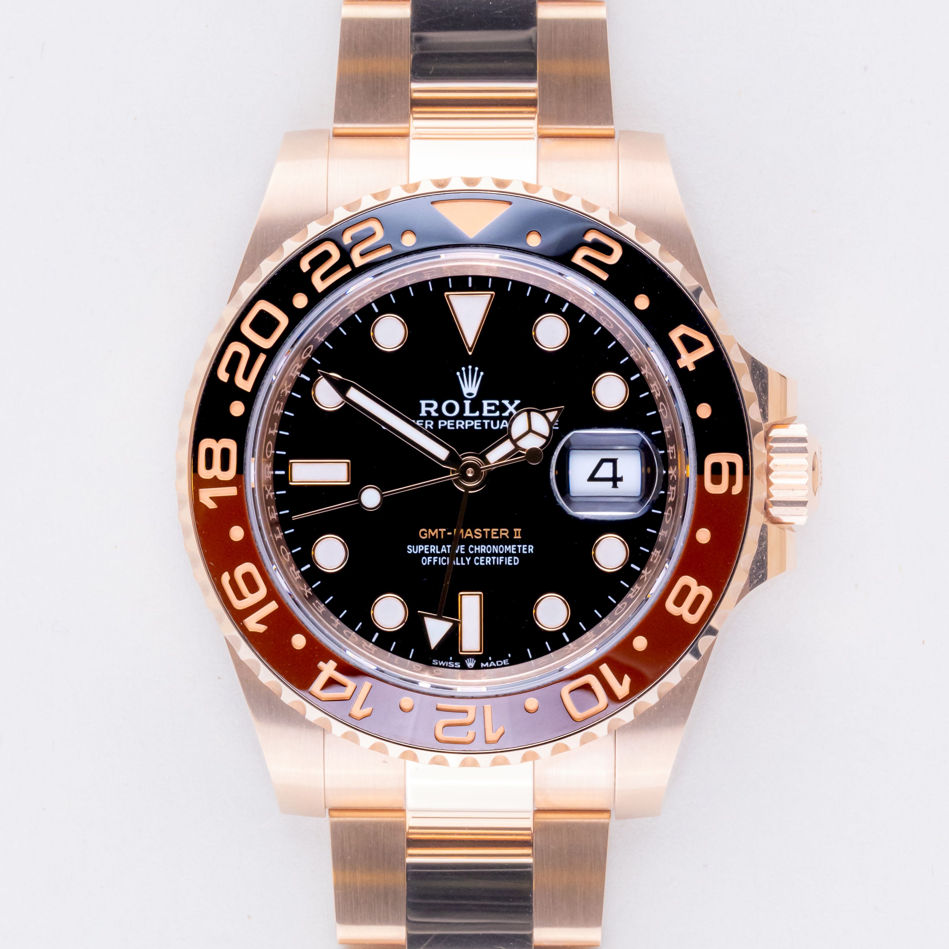 Rolex GMT-Master II reference 126715CHNR from 2025 including full set. The GMT-Master II 126715CHNR measures a 40mm rosegold case, a Rose gold Oyster bracelet w/ Oysterclasp and Ceramic bezel. The GMT-Master II 126715CHNR features an automatic caliber 3285 with quickset date function, a scratch resistance sapphire crystal and black dial with chromalight display.