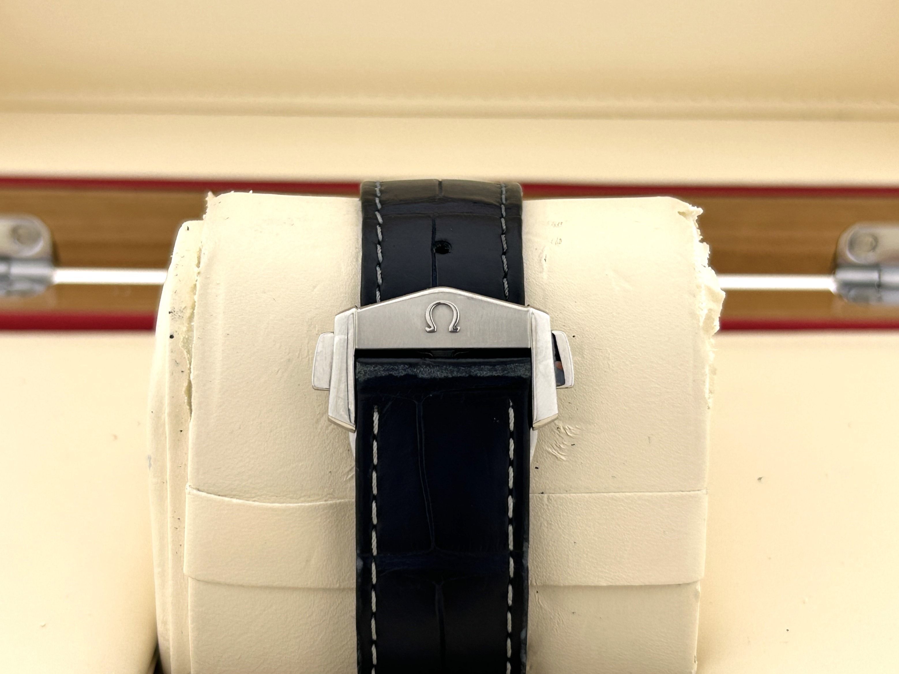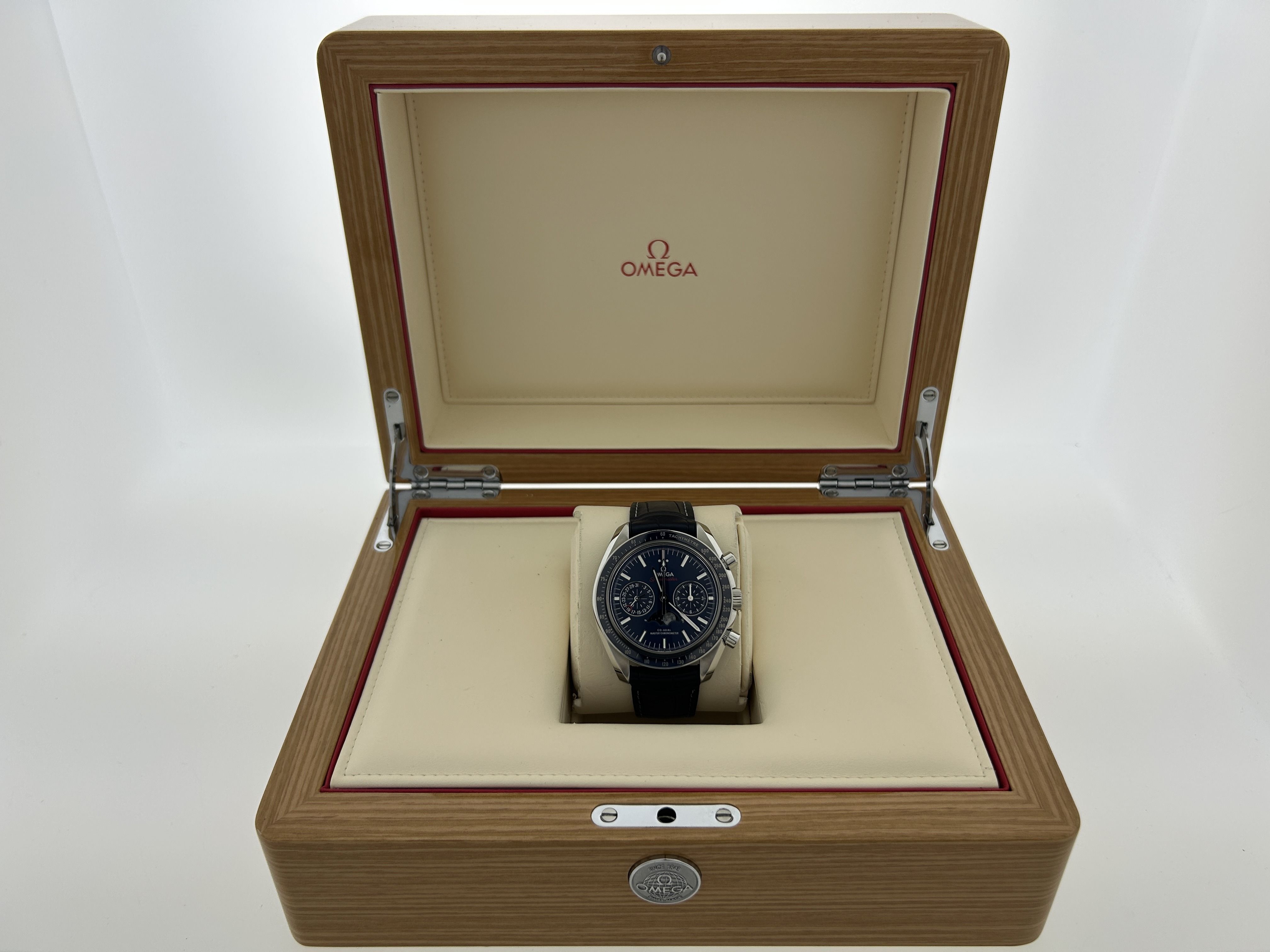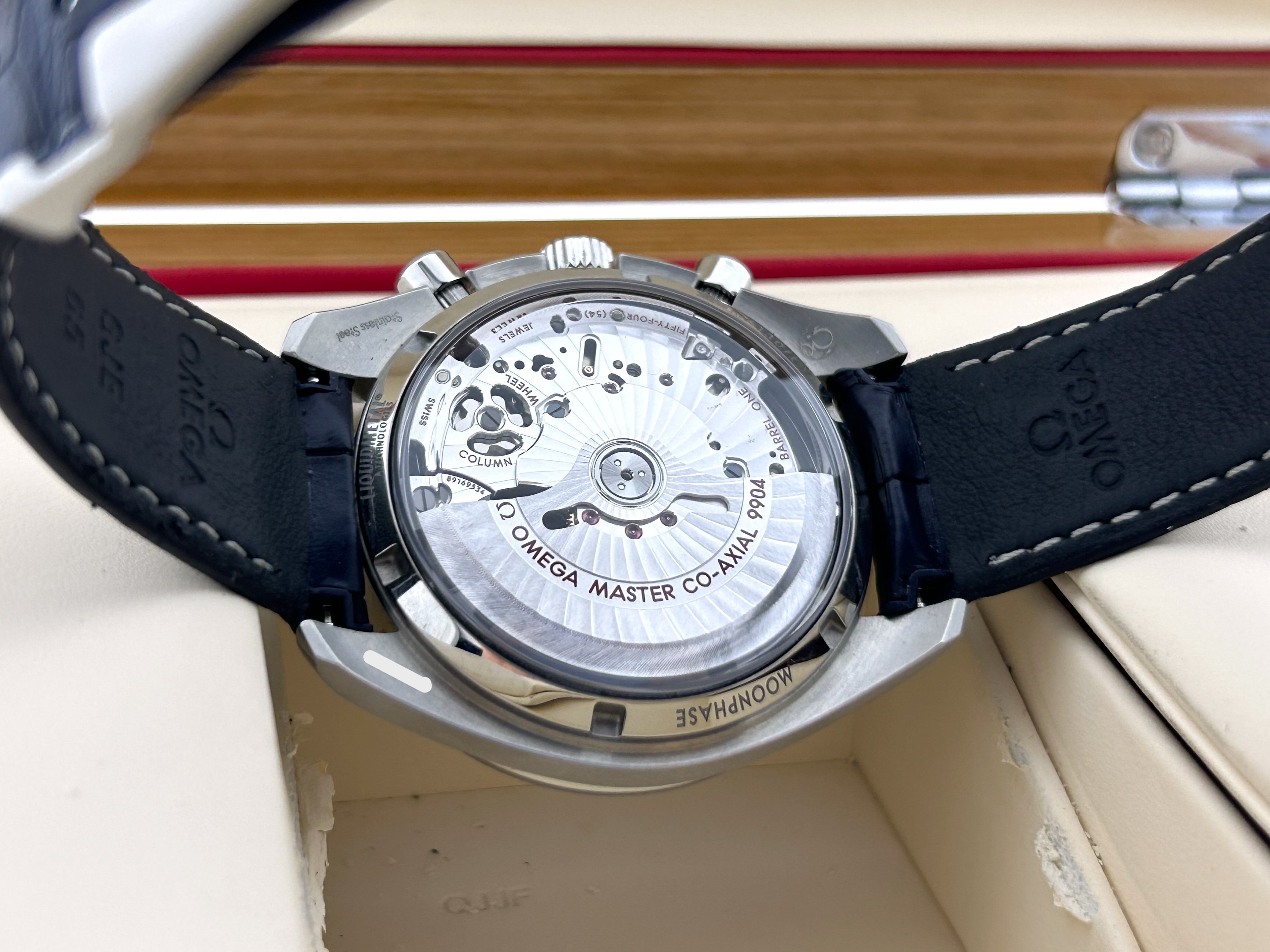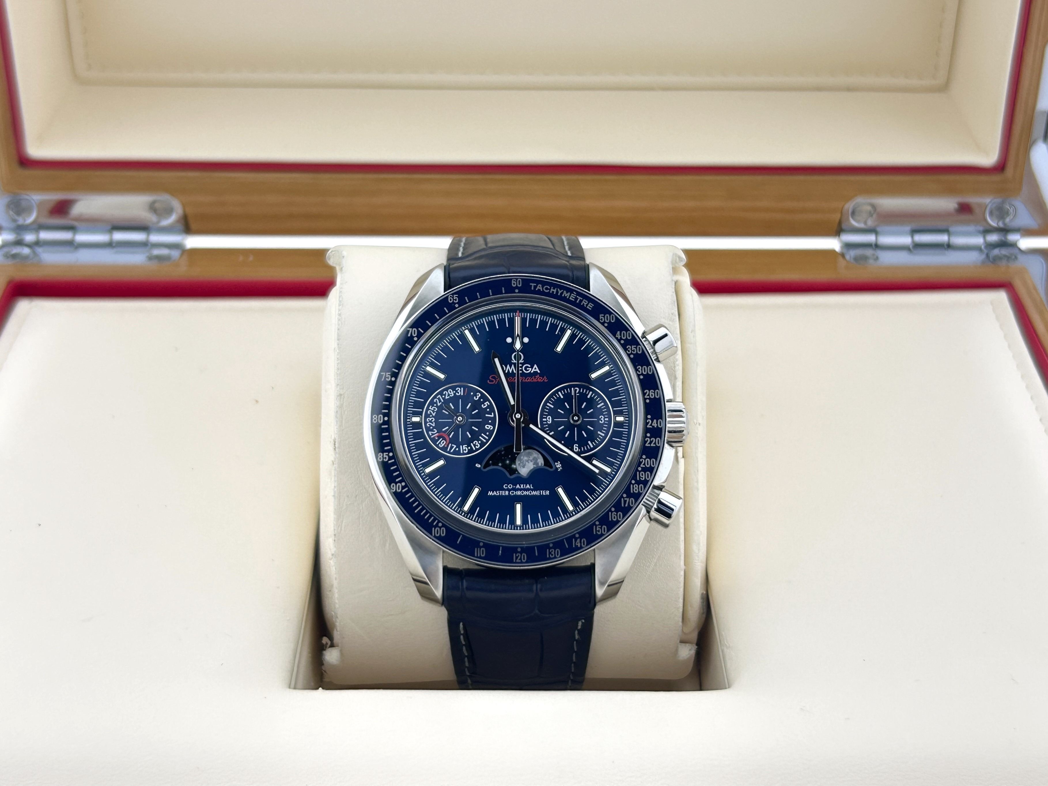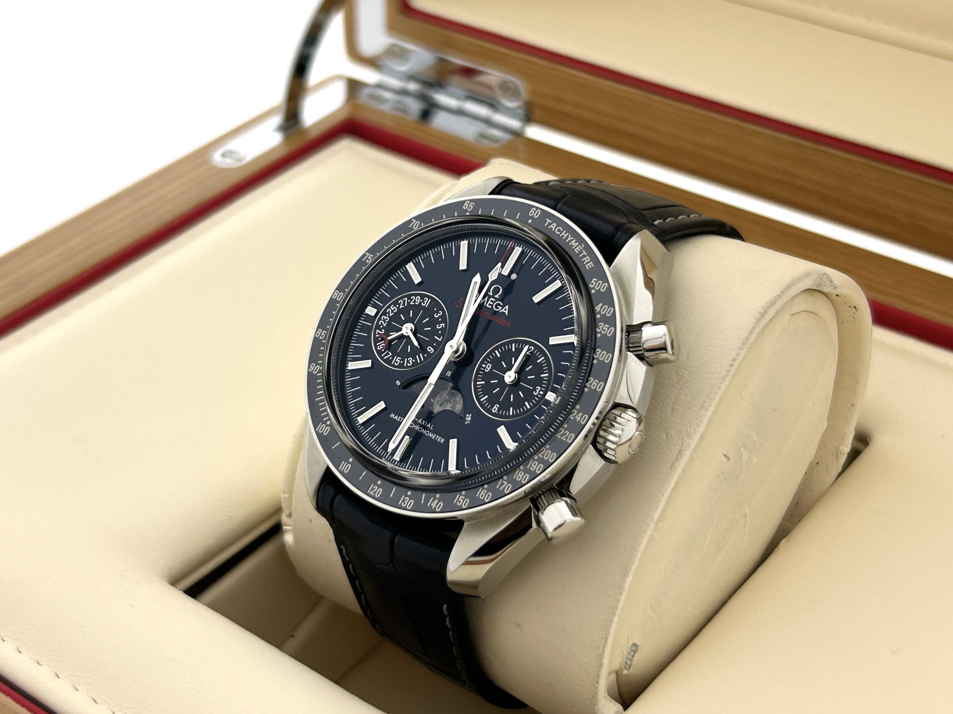 An Omega Speedmaster Moonphase, ref. 304.33.44.52.03.001, from 2017, fullset. The watch has a 44.25mm steel case, with a tachymeter on the blue bezel. The watch has a blue alligator leather strap and a folding clasp. The Omega has a blue dial, with 2 subdials and a moonphase window at 6 o'clock. The Omega Speedmaster is part of the 6 space missions to the moon. The watch is in a very good condition. On the glass one can see a small dot between 11 and 12 o'clock.