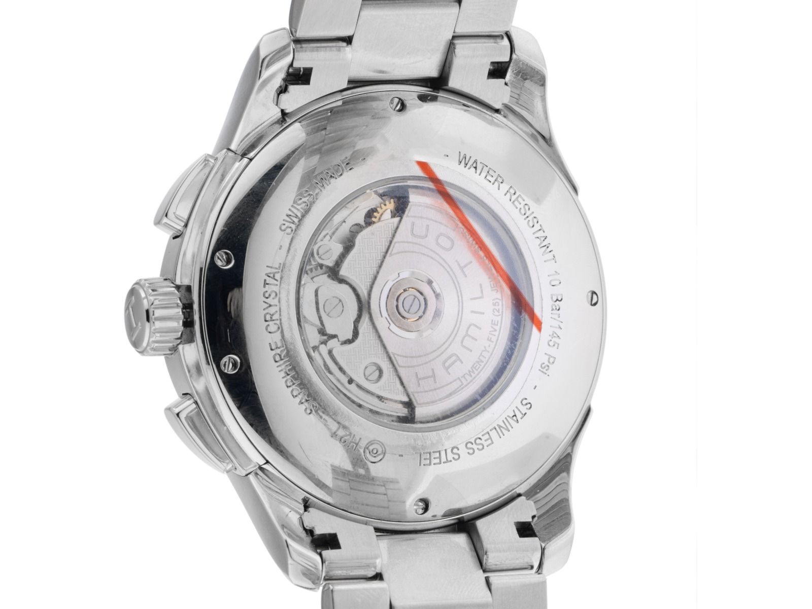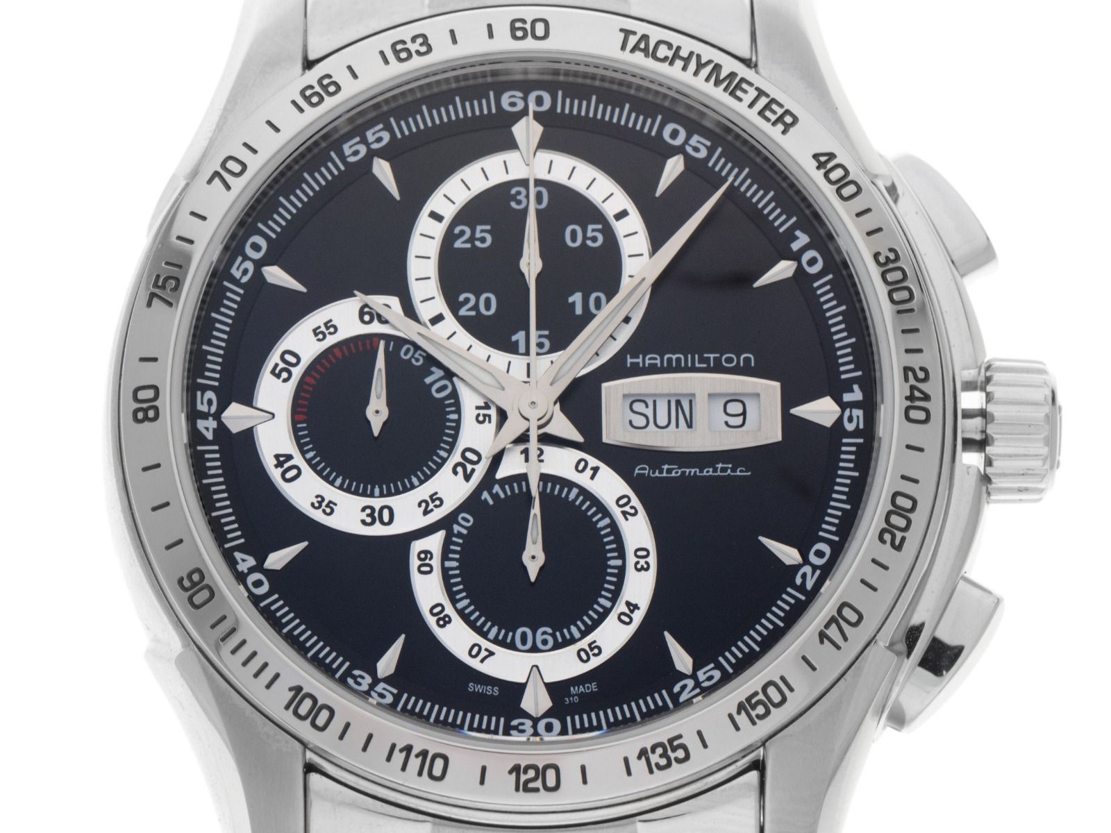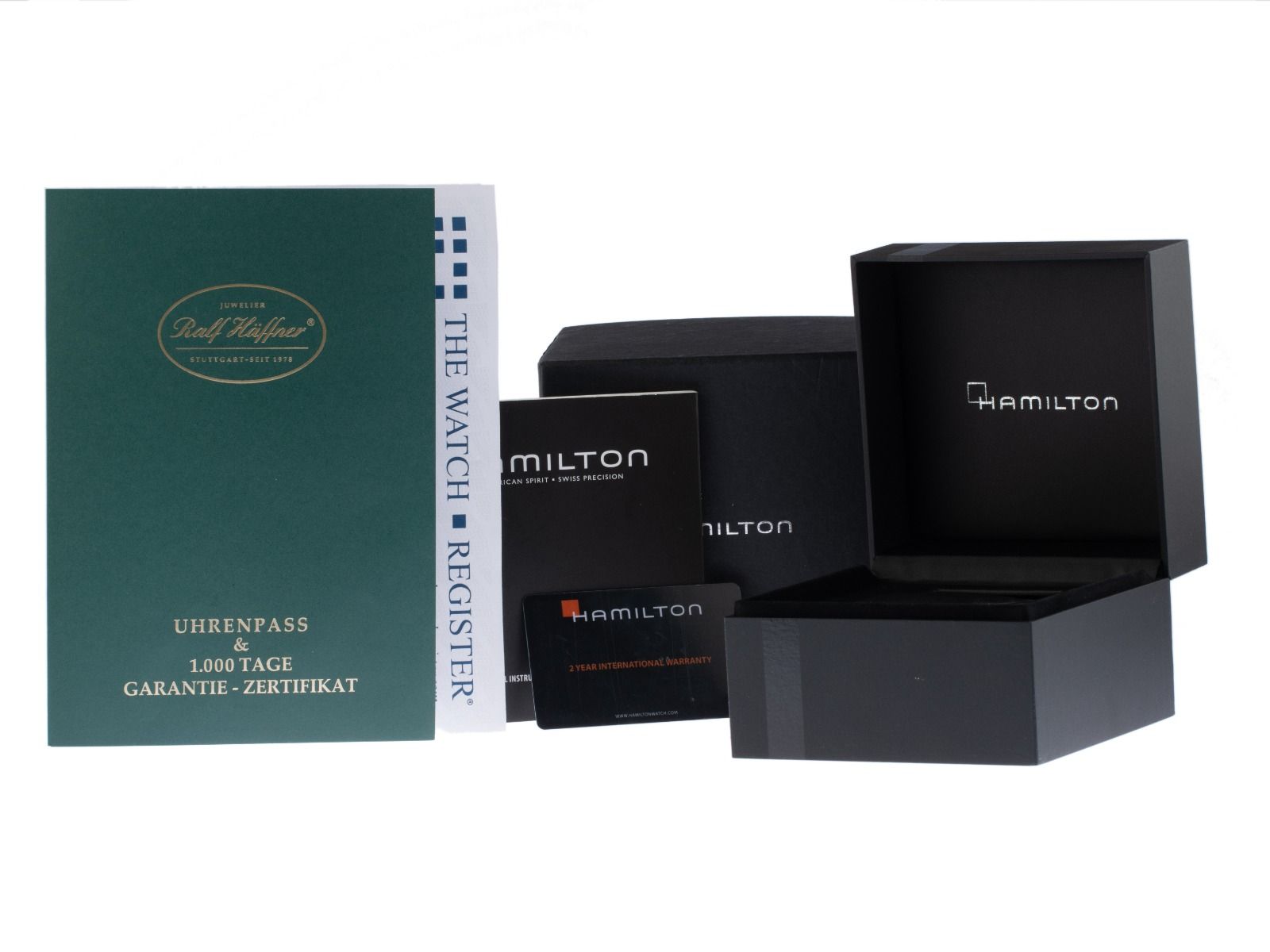 Gehäuse Edelstahl poliert, Gehäusedurchmesser ohne Krone 48mm, Gehäusehöhe 15,2mm. Lünette Edelstahl glatt und poliert mit Tachymeterskala. Armband Edelstahl poliert und satiniert, Doppelsicherheitsfaltschließe Edelstahl. Zifferblatt schwarz mit aufgesetzten Edelstahl Indexen und Edelstahl Zeigern. Uhrwerk Automatik, Chronograph, Kaliber Hamilton 4-21 mit 25 Edelsteinen. Anzeige von Stunde und Minute über Zeiger aus der Mitte, kleine Sekunde mit Sekundenstopp zur sekundengenauen Einstellung der Uhrzeit bei 9 Uhr, Datums-Wochentagsanzeige mit Schnellverstellung bei 3 Uhr. Saphirglas kratzfest und gewölbt. Krone verschraubbar mit Hersteller-Logo. Boden Edelstahl 5-fach verschraubt und graviert mit Saphirsichtglasfenster. Gewicht der Uhr inklusive Armband 217g, Länge des Armbandes inklusive Gehäuse 165mm. Referenznummer: H32811531, Gehäusenummer: H328XXX, ID: P133616000825H-2400, Artikelnummer: 10000081829. Mit Gangkontrolle und kompletter äußerlicher Aufarbeitung von August 2025. Original Hamilton Box mit Umkarton und Garantie Papiere von Oktober 2018 sowie Beschreibung und Watchregister Auszug von August 2025, The Watch Register Zertifikat / ohne Eintrag (Internationale Datenbank für verlorene oder gestohlene Uhren), Full Set. Superschnäppchen. Wie Neu. Lieferzeit sofort.