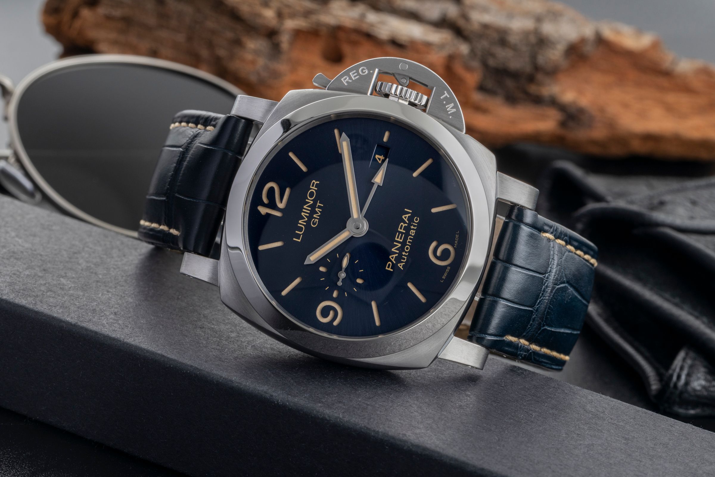 Alternative title: Panerai PAM01033 Luminor 1950 44 3 Days GMT Automatic Stainless Steel / Blue; Panerai Luminor GMT Automatik Stahl Herrenuhr Ref. PAM01033 Box & Papiere 2019 [2504261]