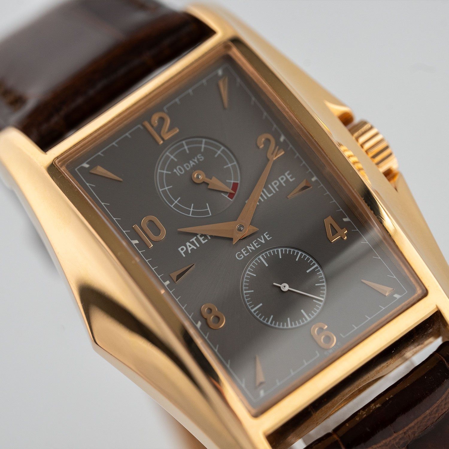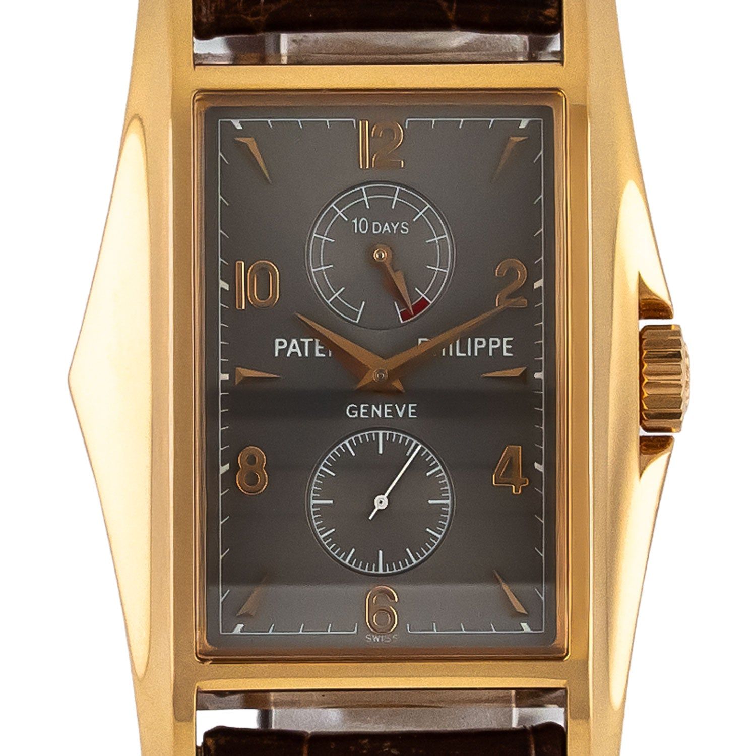 The Patek Philippe Gondolo Anniversary 8 Days (reference 5100R-001) was introduced in 2000 as a strictly limited special edition to mark the new millennium.The watch impresses with its striking, rectangular case made of fine 18-carat rose gold, which is characterized by elegant Art Deco-inspired lines and perfect proportions. The watch features a classically designed, silver-colored dial with applied Breguet numerals and a discreet power reserve indicator at 12 o'clock.The fine, blued hands and perfectly coordinated typography lend the watch a timeless elegance and underscore Patek Philippe's traditional style. The highest-quality case workmanship and gently curved horns ensure maximum comfort on the wrist.The elegant combination of a rose gold case and a hand-stitched brown alligator leather strap underscores the classic appeal of this special model. The Gondolo 5100R is equipped with the impressive caliber 28-20/220, which offers an eight-day power reserve and can be admired in all its beauty through the transparent case back. The rose gold limited edition of 750 pieces makes this watch a coveted collector's item for lovers of exclusive timepieces and fine watchmaking. The Patek Philippe Gondolo Anniversary 5100R-001 combines historical references, technical mastery, and limited exclusivity in a unique creation. An archive extract has been requested for the watch, which usually takes 2 to 3 months to issue.You receive a 1-year warranty on the functionality of the movement.