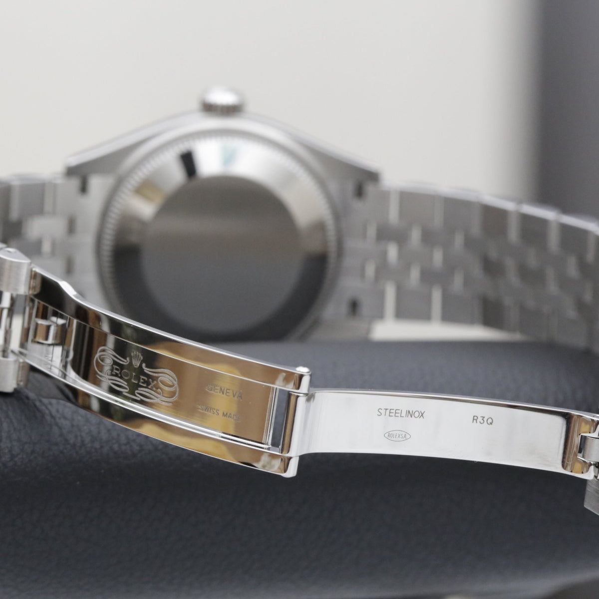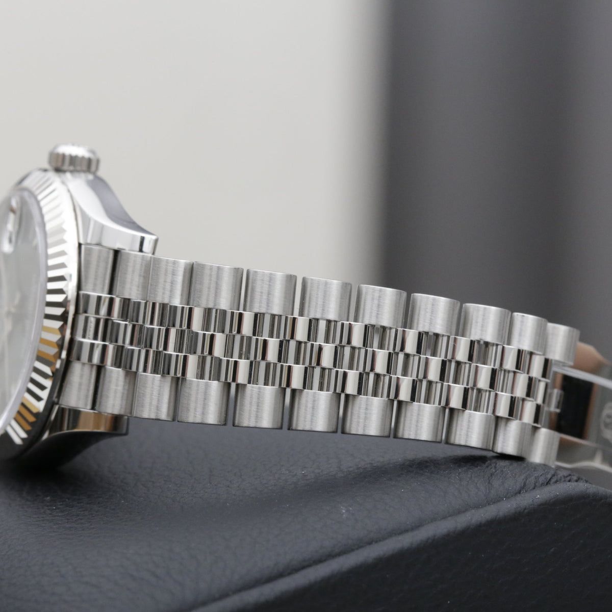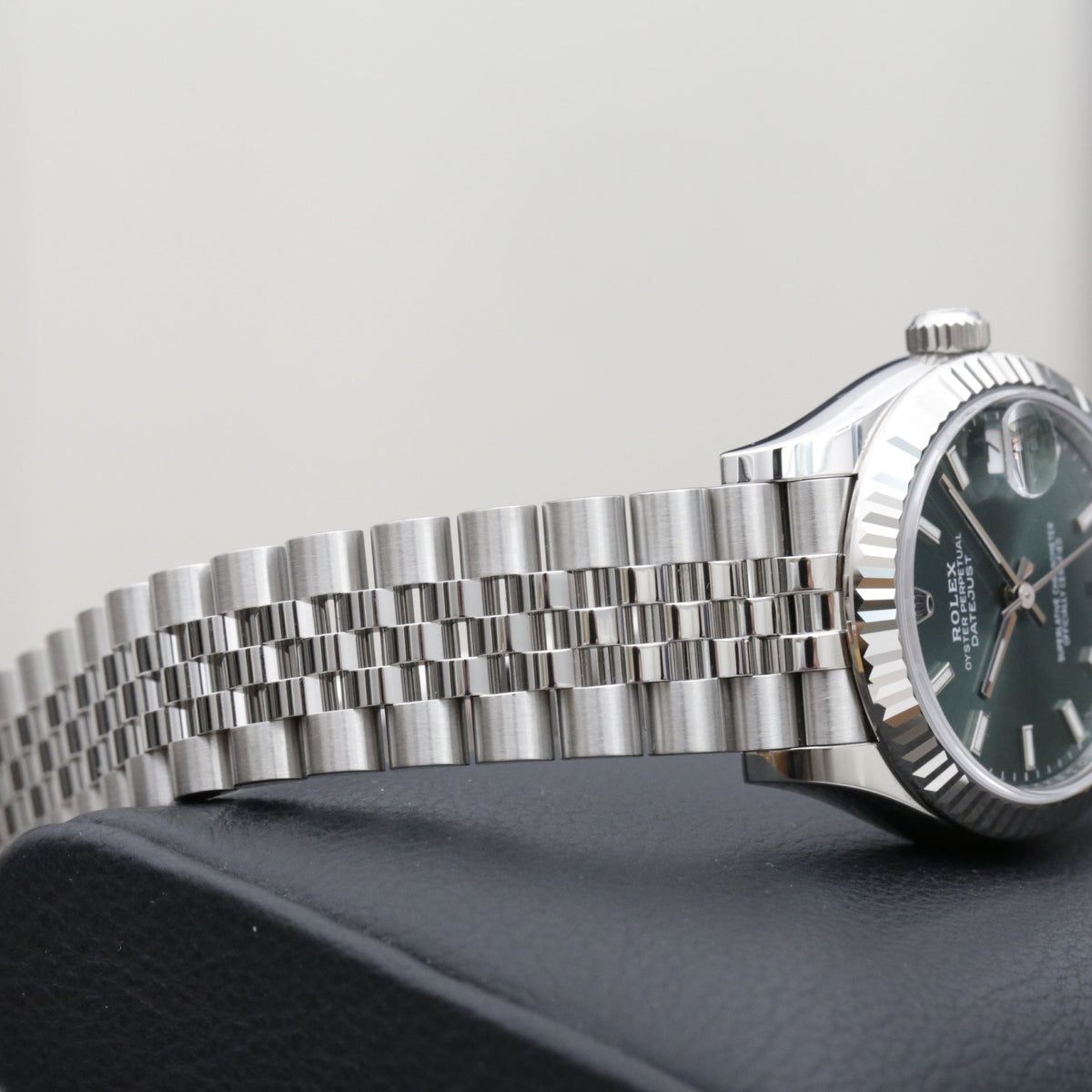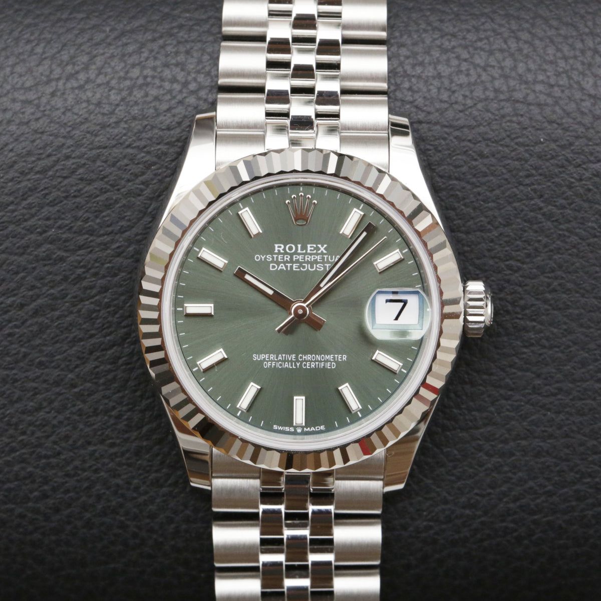 This Rolex Datejust 31 in steel and white gold fluted bezel features a mint green dial and a jubilee bracelet.