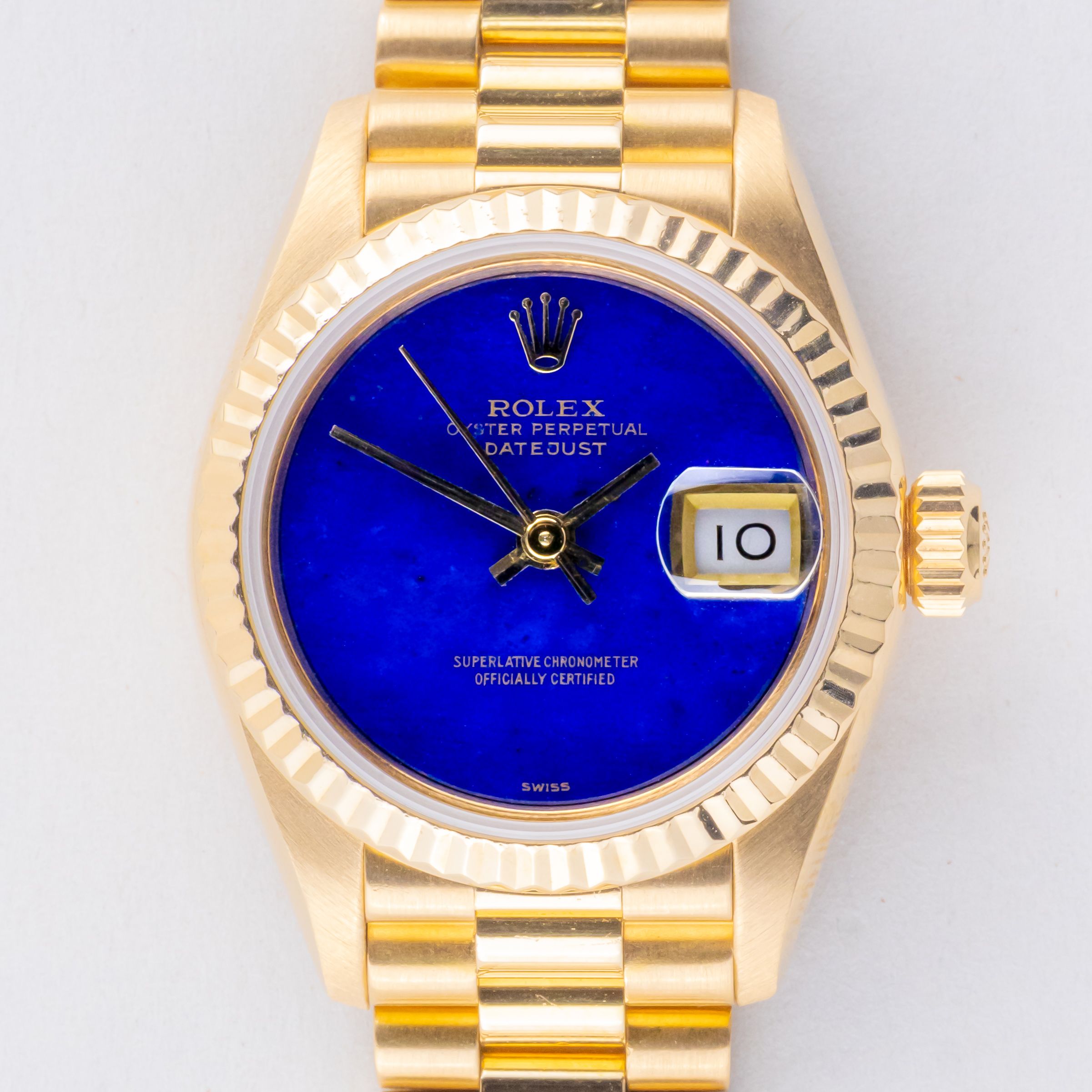 Rolex Oyster Perpetual Lady-Datejust reference 69178 from 1991 including full set. The Lady-Datejust 69178 measures a 26mm gold case, gold jubilee bracelet and fluted 18k yellow gold bezel. This Lady-Datejust 69178 features an automatic movement caliber 2135 with quickset date function, sapphire crystal and a Lapis Lazuli dial.
