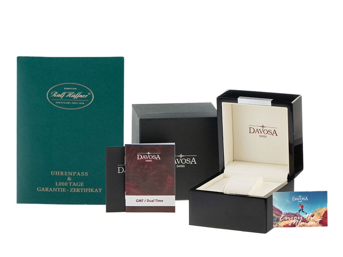 Gehäuse Edelstahl, poliert und satiniert, Gehäusedurchmesser ohne Krone 42mm, Gehäusehöhe 15,5mm. Lünette Edelstahl mit schwarz / blauem Keramik Inlay, einseitig drehbar. Armband Edelstahl poliert und satiniert, Sicherheitsfaltschließe Edelstahl mit Hersteller-Logo. Zifferblatt schwarz mit aufgesetzten Edelstahl Leuchtindexe und Edelstahl Leuchtzeigern. Uhrwerk Automatik, Kaliber ETA 2893 mit 21 Edelsteinen. Anzeige von Stunde, Minute und Sekunde über Zeiger aus der Mitte mit Sekundenstopp zur sekundengenauen Einstellung der Uhrzeit, Datumsanzeige mit Schnellverstellung unter Glaslupe bei 3 Uhr, zweite Zeitzone (GMT) ablesbar über Lünette, einstellbar über blauen Zeiger aus der Mitte. Saphirglas kratzfest. Krone verschraubbar mit Flankenschutz und Hersteller-Logo. Boden Edelstahl verschraubt und graviert. Gewicht der Uhr inklusive Armband 204g, Länge des Armbandes inklusive Gehäuse 195mm. Referenznummer: 161.571.45, Gehäusenummer: 0XXX, ID: P151312000925H-1590, Artikelnummer: 10000082282. Original Davosa Box mit Umkarton und Garantie Papiere von Mai 2019 sowie Watchregister Auszug von September 2025, The Watch Register Zertifikat / ohne Eintrag (Internationale Datenbank für verlorene oder gestohlene Uhren), Full Set. Superschnäppchen. Wie Neu. Lieferzeit sofort.