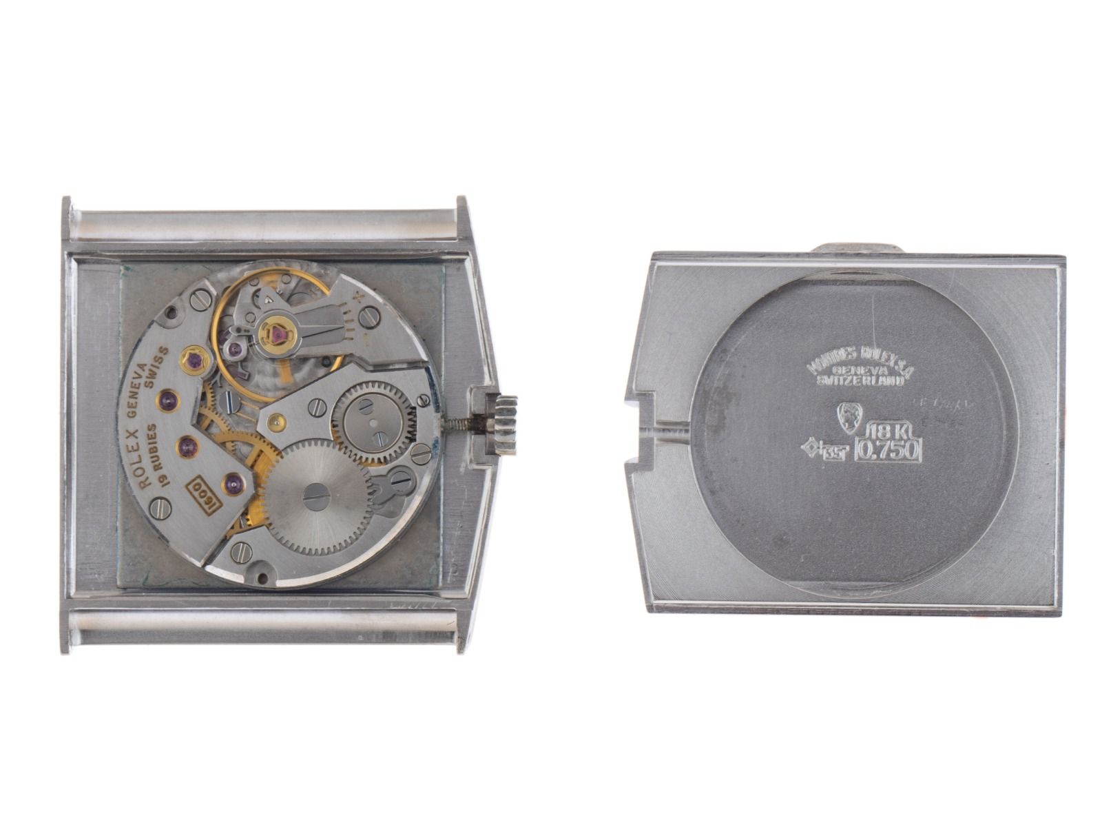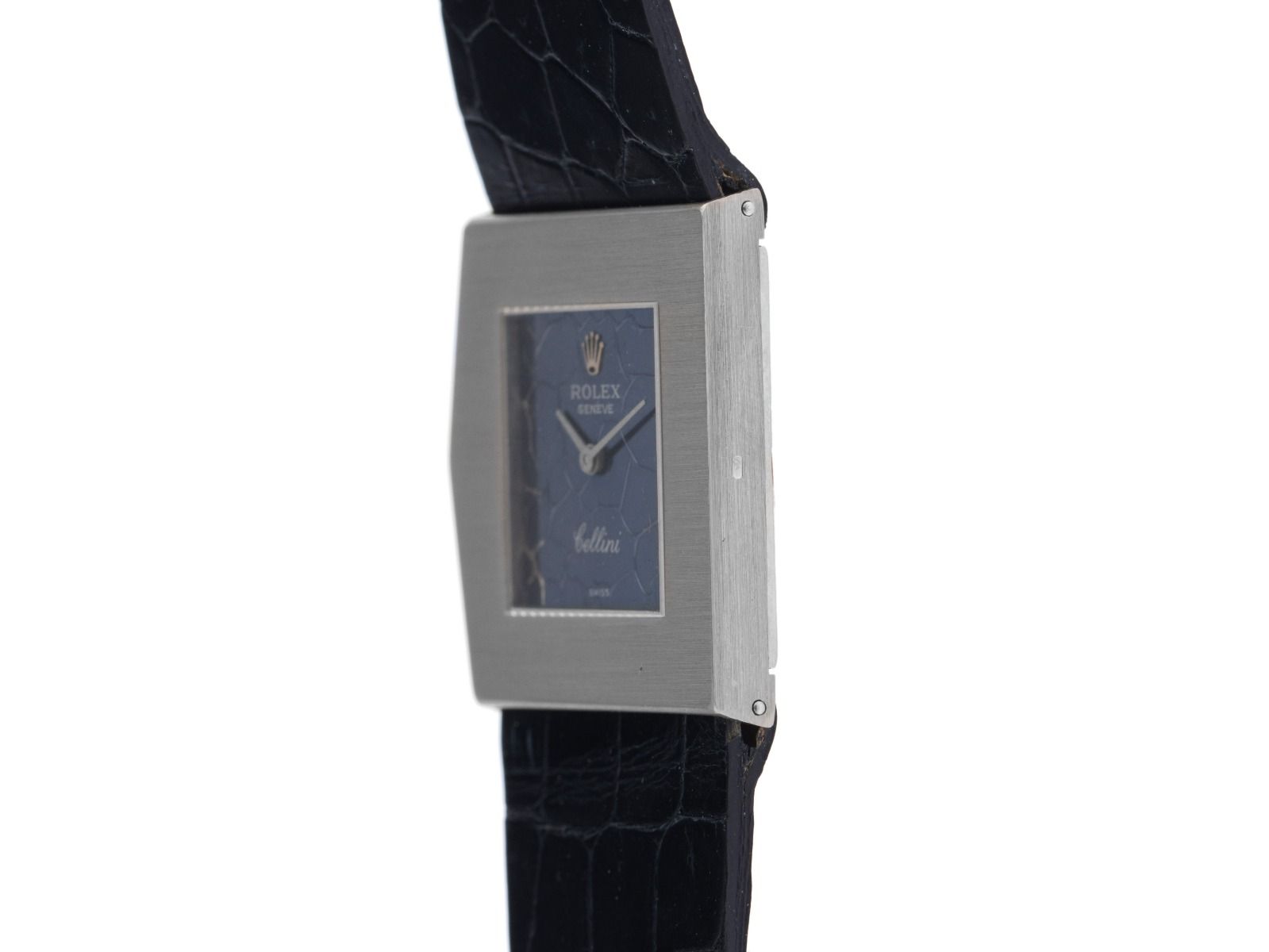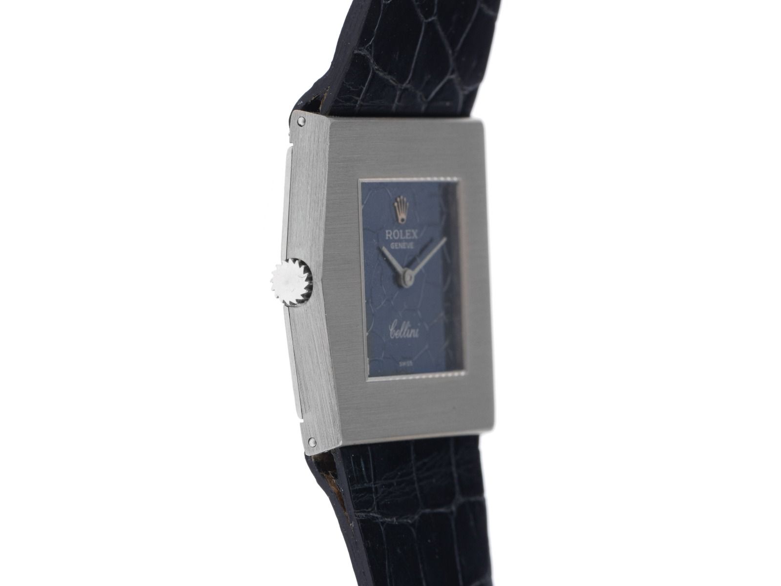 Gehäuse 18kt Weißgold satiniert, Gehäusemaße ohne Krone (L x B x H) 28,7 x 27,5 x 5,5mm. Armband Krokoleder schwarz, Rolex Stiftschließe Edelstahl mit Hersteller-Logo, Anstoßbreite 24mm. Zifferblatt blau mit Kroko-Optik und weißen Zeigern. Uhrwerk Handaufzug, Rolex Manufakturkaliber 1600 mit 19 Edelsteinen. Anzeige von Stunde und Minute über Zeiger aus der Mitte. Saphirglas kratzfest. Krone links im Gehäuse eingelassen. Boden 18kt Weißgold graviert. Gewicht der Uhr inklusive Armband 36g. Referenznummer: 4017, Gehäusenummer: 3477XXX, Baujahr: 1972, ID: P1398131160825H-10500, Artikelnummer: 10000081989. Mit Gangkontrolle und kompletter äußerlicher Aufarbeitung von September 2025. Original Rolex Box mit Umkarton und Beschreibung sowie Ledermäppchen, Übersetzungsheft, Rolex Chronometer-Siegel, Tag und Watchregister Auszug von September 2025, The Watch Register Zertifikat / ohne Eintrag (Internationale Datenbank für verlorene oder gestohlene Uhren). Kapitalanlage mit Wertsteigerungspotential, sehr seltenes Sammlerstück. Sehr guter Zustand. Lieferzeit sofort.