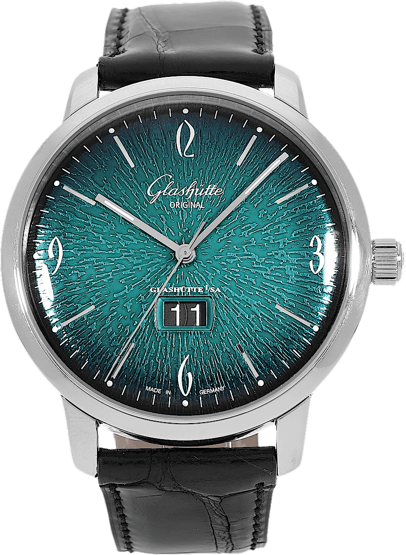Glashütte Original Sixties Panoramadatum, Reference: 2-39-47-04-02-04, Gender: Male, Size: 42mm, Dial color: Green, Strap material: Calf Leather, Movement: Automatic, Year: 2019, Condition: Previously worn, minor to no signs of usage. The movement is flawless and the case has been cleaned. watch tested ensure full functionality. An inspection by our certified watchmakers guarantees its authenticity., Documents: papers, CHRONEXT Certificate
