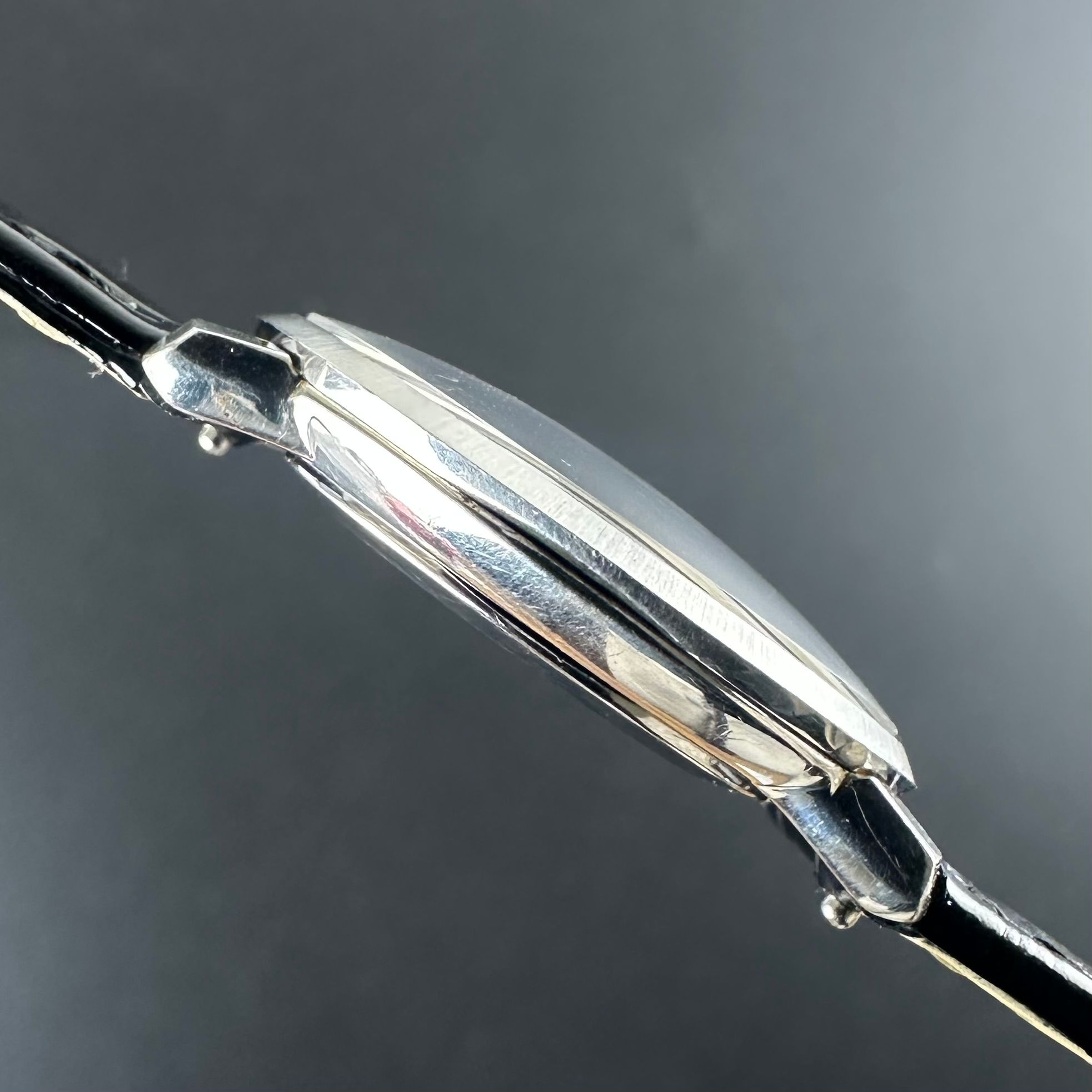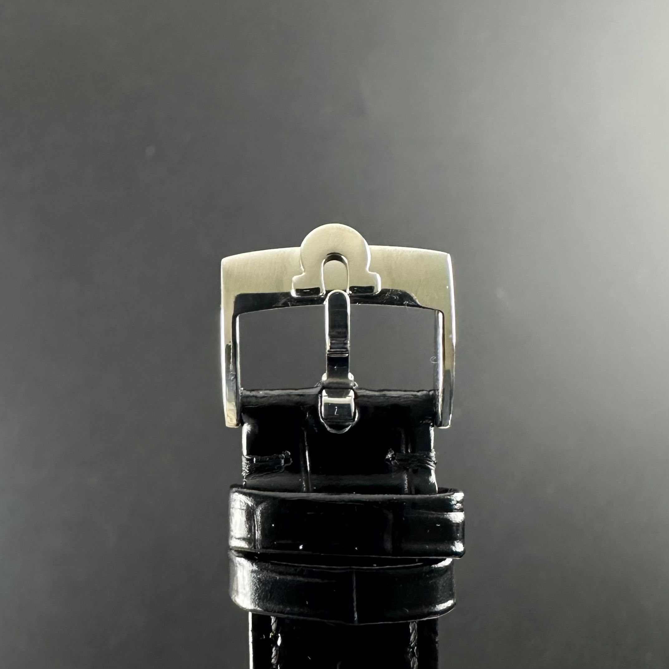 Strap: A black calf leather strap with light glossy finish and crocodile grain. Made in France. (Fits a 12 to 20cm wrist)